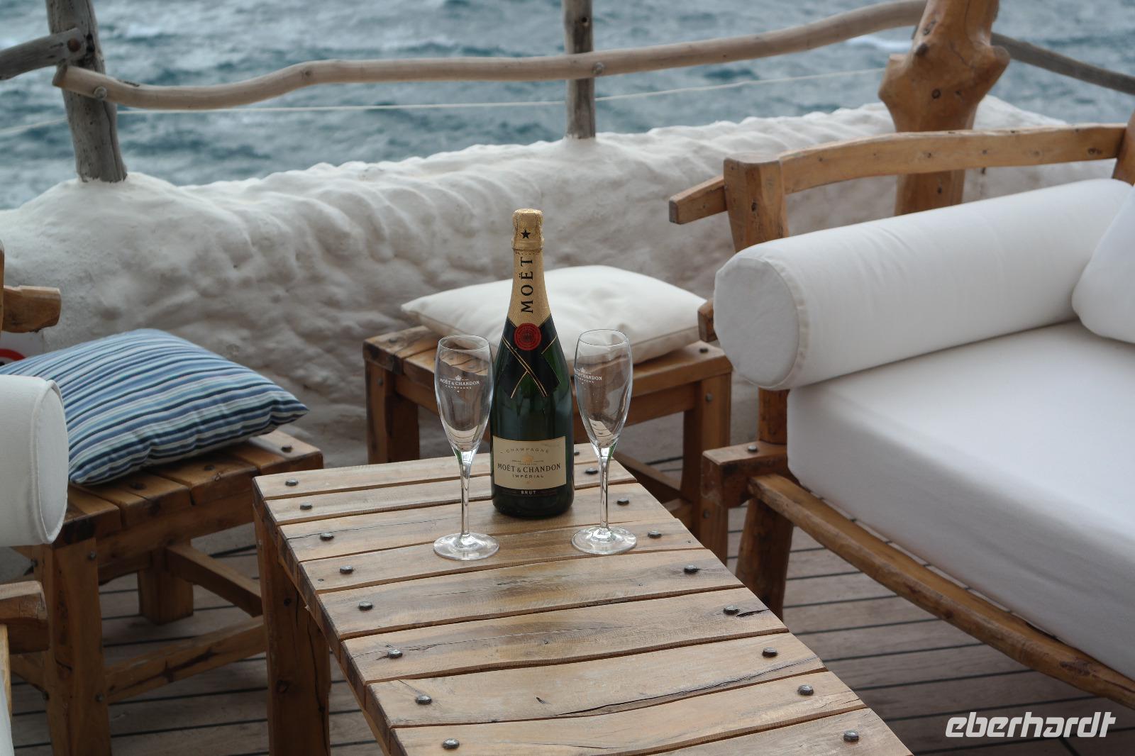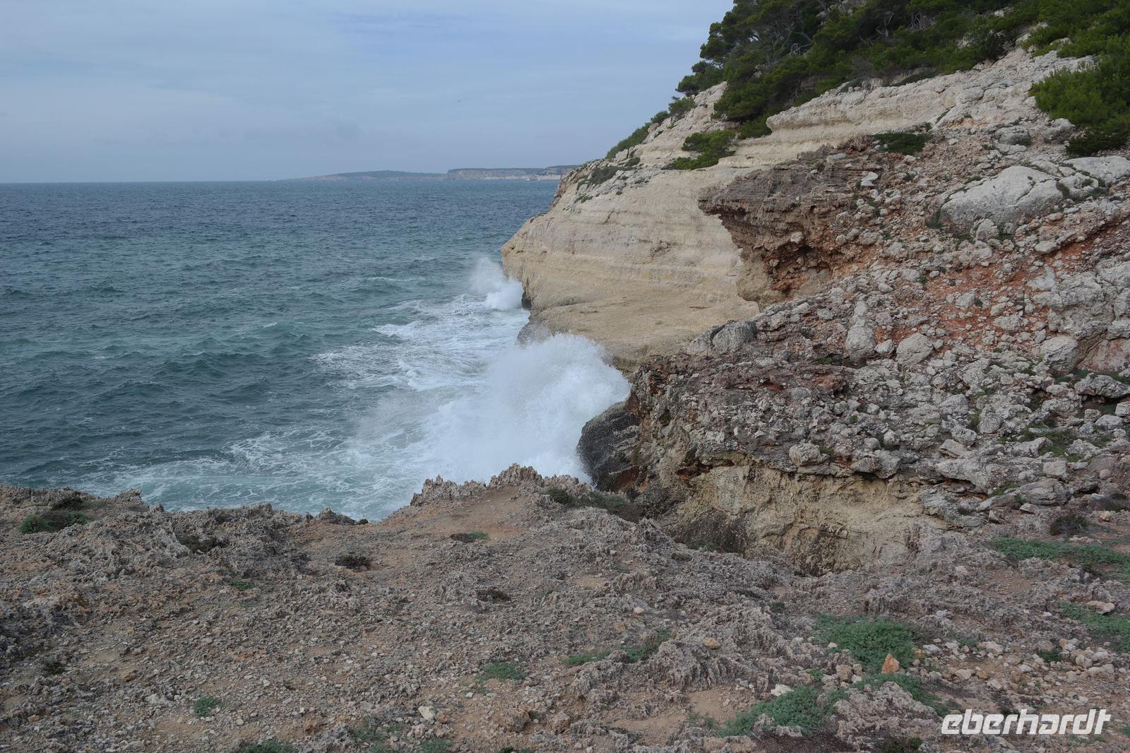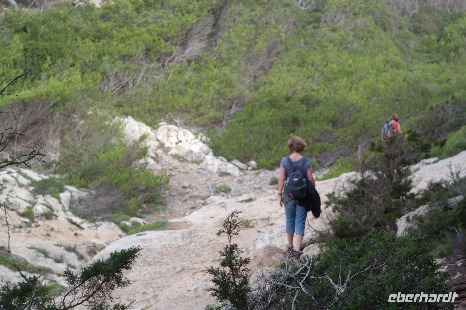 Die Sonne und unser George strahlen wieder um die Wette - auch wir sind tatendurstig und folgen unserem Wanderführer zunächst an den Strand von Sant Tomas. Da es sich im tiefen Sand nicht gut läuft mit Wandersstiefeln kraxeln wir über Steine und Geröll nach oben, genießen den Ausblick auf die wilde Küste im Süden der Insel und wechseln dann im Auf und Ab, gelangen immer weiter gen Westen und stoppen um die Mittagszeit in einer kleinen Bucht. Erholung tut jetzt gut - ob relaxt am Strand oder bei gutem Wellengang im Meer. Über holprige Felsen, schmale Küstenpfade und enge Waldwege geht es von Bucht zu Bucht. Die frische, salzhaltige Luft und das anspruchsvolle Terrain machen Appetit - wir stärken uns unterwegs und kehren am Nachmittag in eine hübschen Strandbar in Cala Galdena zur Kaffeezeit ein. Zum Lieblingsgetränk für unsere Gruppe entwickelt sich der leckere Eiskaffee - darauf kommen wir noch zurück .
