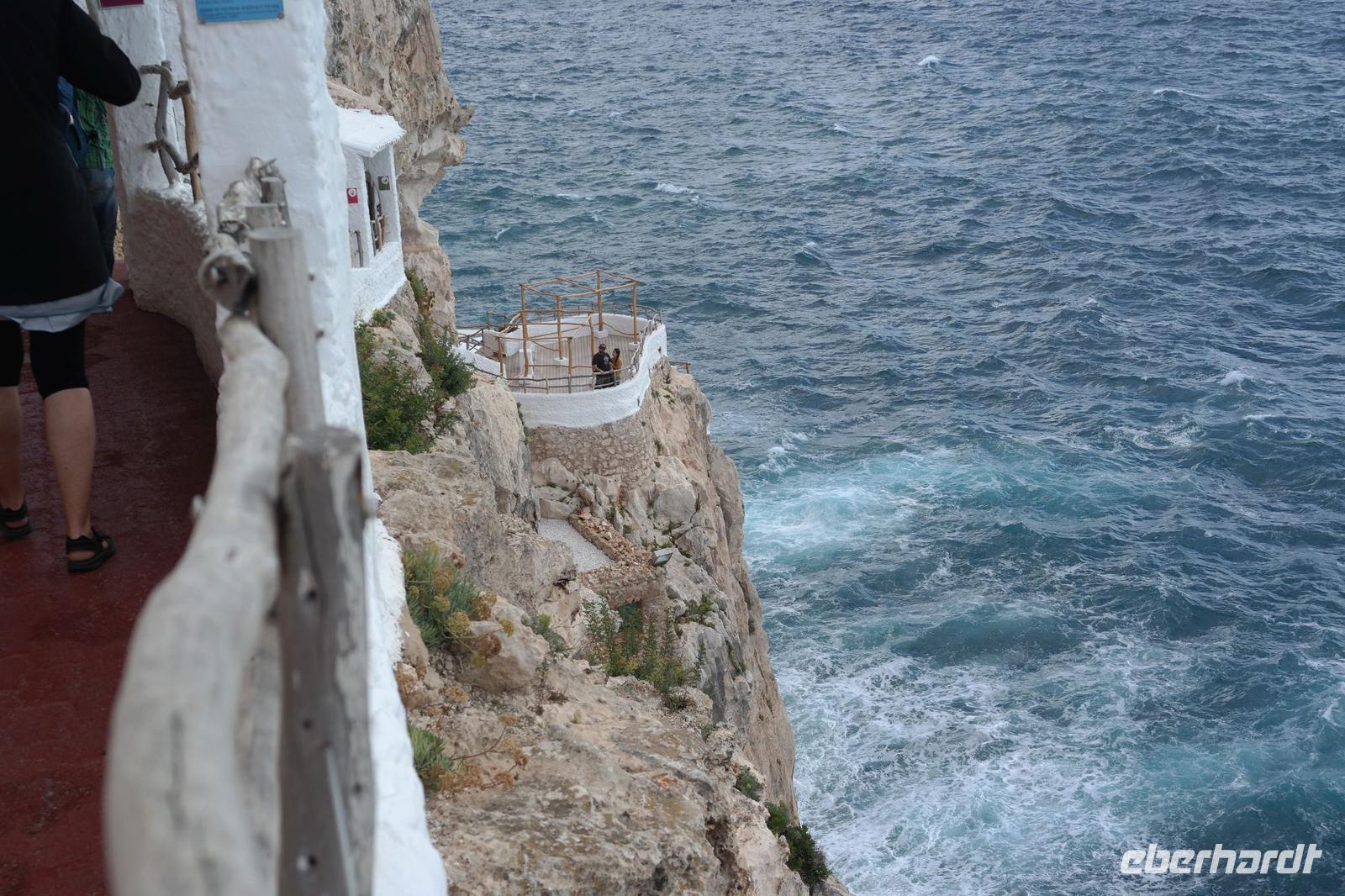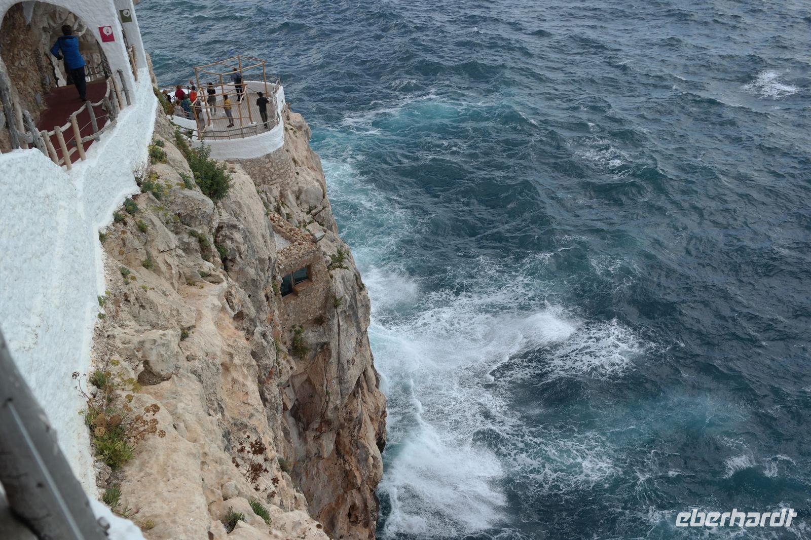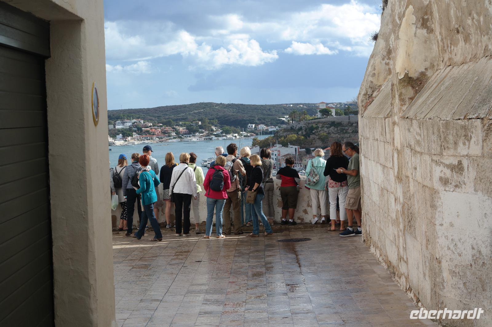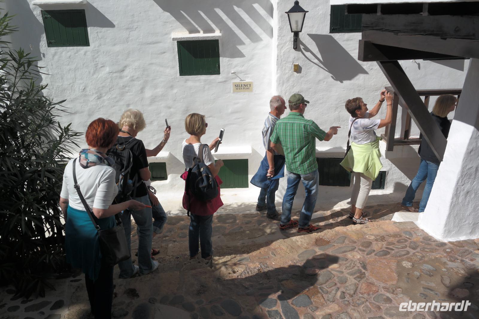 Die Wanderschuhe dürfen heute auslüften - wir nehmen den Bus. Es geht zum höchsten Berg der Insel - „El Toro" - zugleich wichtiger Wallfahrtsort (Kloster Santa Maria) - von hier können wir die kleine Insel in alle Himmelsrichtungen überblicken und in der kleinen Kirche unsere Wünsche und Gebete zurücklassen. Danach geht es in die Hauptstadt Mahon (katalan.: Mao) - berühmt für den größten Naturhafen Europas, thront die Stadt auf einem Felsplateau über der 5 km langen Bucht, die eine ganze Flotte beherbergen kann. Wir schlendern über die Plazzas, durch enge Gassen und genießen um die Mittagszeit ein Orgelkonzert in der Kirche der Heiligen Maria. Von Plakaten erfahren wir, dass selbst auf Menorca das „Oktoberfest" gefeiert wird - kein Wunder also, wenn auf der Wies'n die Leute ausbleiben. Wir fahren weiter über Sant Lluis, sehen den Leuchtturm auf der „Luftinsel" und drehen ab in Richtung Südwest in das kleine Fischerörtchen Binibèquer. Die kleinen Häuser - komplett weiß angestrichen (auch Dächer, Kamine und Antennen sind weiß) bilden mit den engen Gäßchen ein einzigartiges Labyrinth - wir finden trotzdem den Weg in eine kleine Bar und lassen uns Eiscafè und Anderes schmecken. Unsere letzte Station für heute sind die Naturhöhlen von Xoroi. Diese Höhlen sind nur vom Meer aus zu sehen - in den Felsen wurde eine Treppe eingebaut und von hier bietet sich uns ein spektakulärer Blick auf die tosende Brandung. In den Höhlen finden sich heute kleine Bars - wir können uns gut vorstellen, dass hier das Nachtleben pulsiert - deshalb sind wir am Nachmittag gekommen .