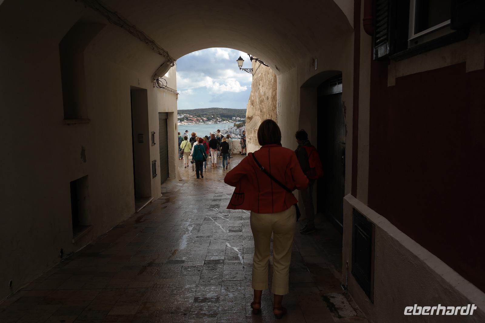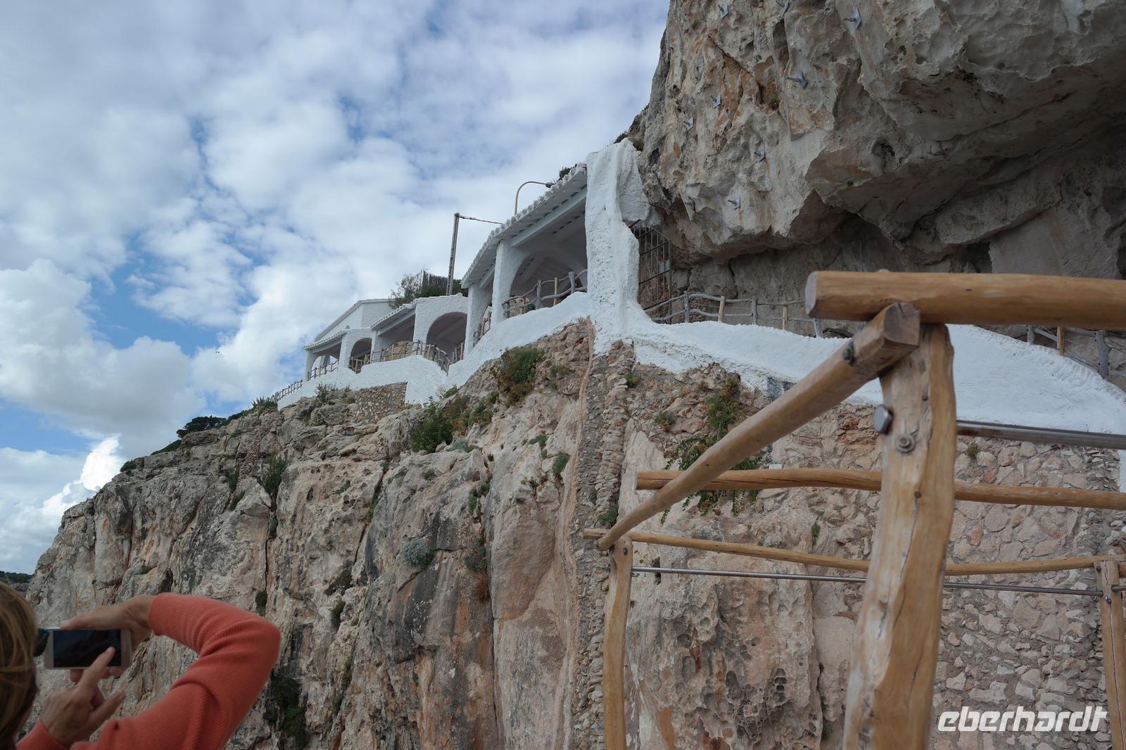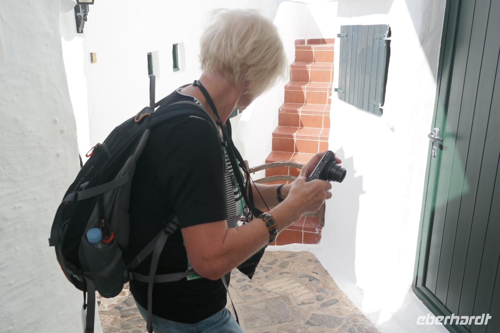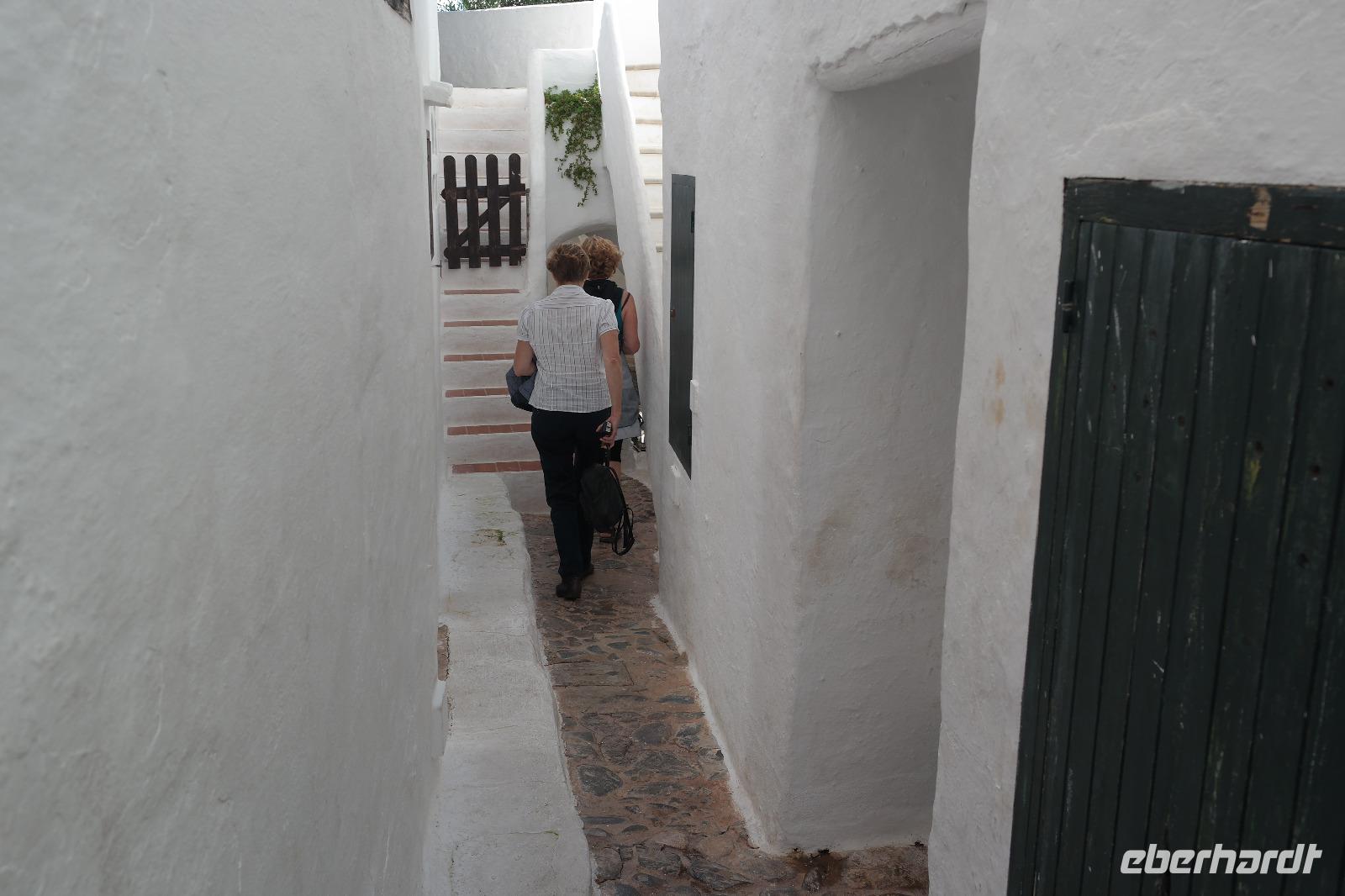 Die Wanderschuhe dürfen heute auslüften - wir nehmen den Bus. Es geht zum höchsten Berg der Insel - „El Toro" - zugleich wichtiger Wallfahrtsort (Kloster Santa Maria) - von hier können wir die kleine Insel in alle Himmelsrichtungen überblicken und in der kleinen Kirche unsere Wünsche und Gebete zurücklassen. Danach geht es in die Hauptstadt Mahon (katalan.: Mao) - berühmt für den größten Naturhafen Europas, thront die Stadt auf einem Felsplateau über der 5 km langen Bucht, die eine ganze Flotte beherbergen kann. Wir schlendern über die Plazzas, durch enge Gassen und genießen um die Mittagszeit ein Orgelkonzert in der Kirche der Heiligen Maria. Von Plakaten erfahren wir, dass selbst auf Menorca das „Oktoberfest" gefeiert wird - kein Wunder also, wenn auf der Wies'n die Leute ausbleiben. Wir fahren weiter über Sant Lluis, sehen den Leuchtturm auf der „Luftinsel" und drehen ab in Richtung Südwest in das kleine Fischerörtchen Binibèquer. Die kleinen Häuser - komplett weiß angestrichen (auch Dächer, Kamine und Antennen sind weiß) bilden mit den engen Gäßchen ein einzigartiges Labyrinth - wir finden trotzdem den Weg in eine kleine Bar und lassen uns Eiscafè und Anderes schmecken. Unsere letzte Station für heute sind die Naturhöhlen von Xoroi. Diese Höhlen sind nur vom Meer aus zu sehen - in den Felsen wurde eine Treppe eingebaut und von hier bietet sich uns ein spektakulärer Blick auf die tosende Brandung. In den Höhlen finden sich heute kleine Bars - wir können uns gut vorstellen, dass hier das Nachtleben pulsiert - deshalb sind wir am Nachmittag gekommen .