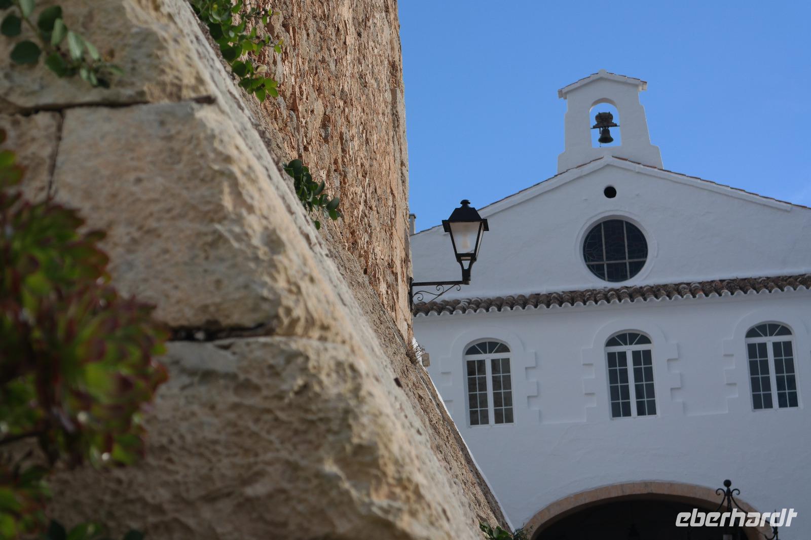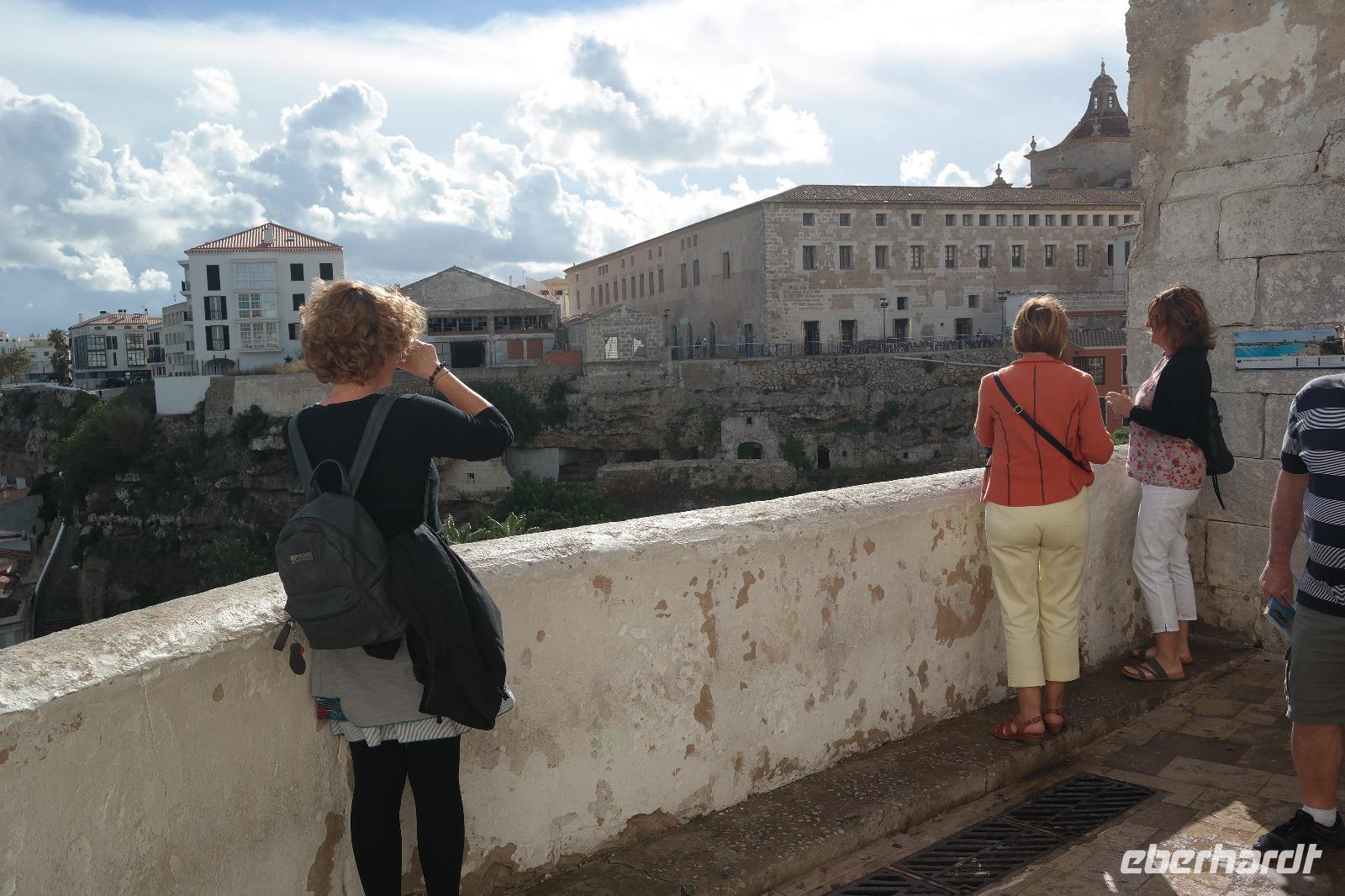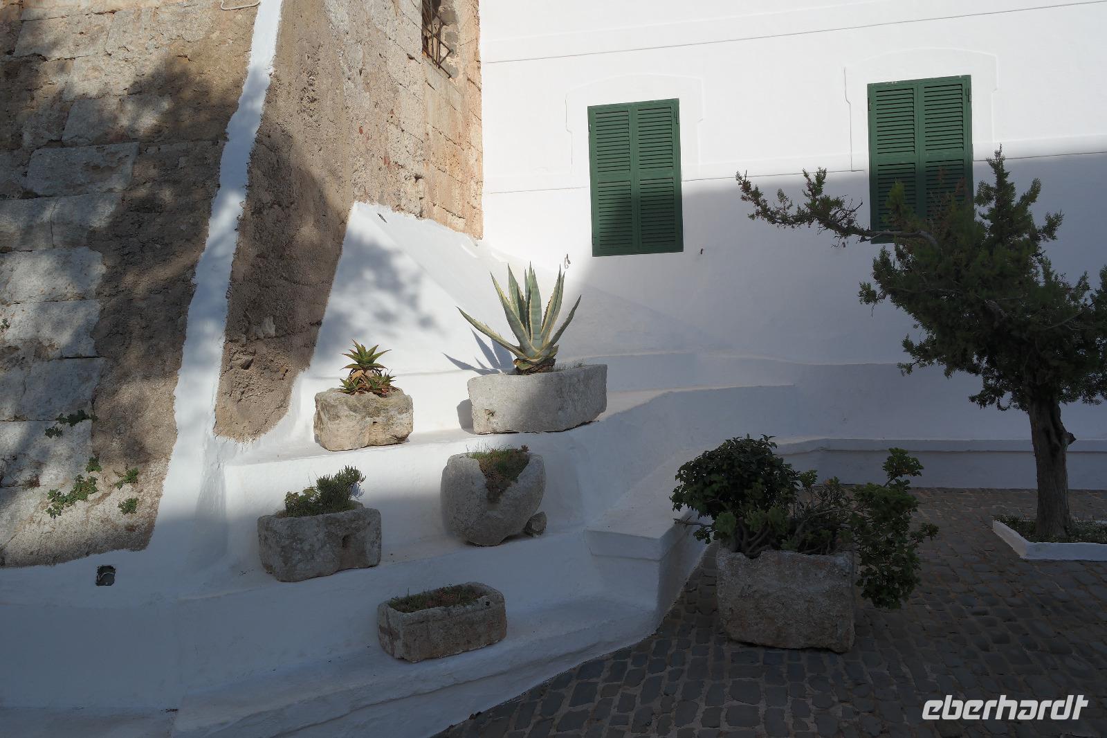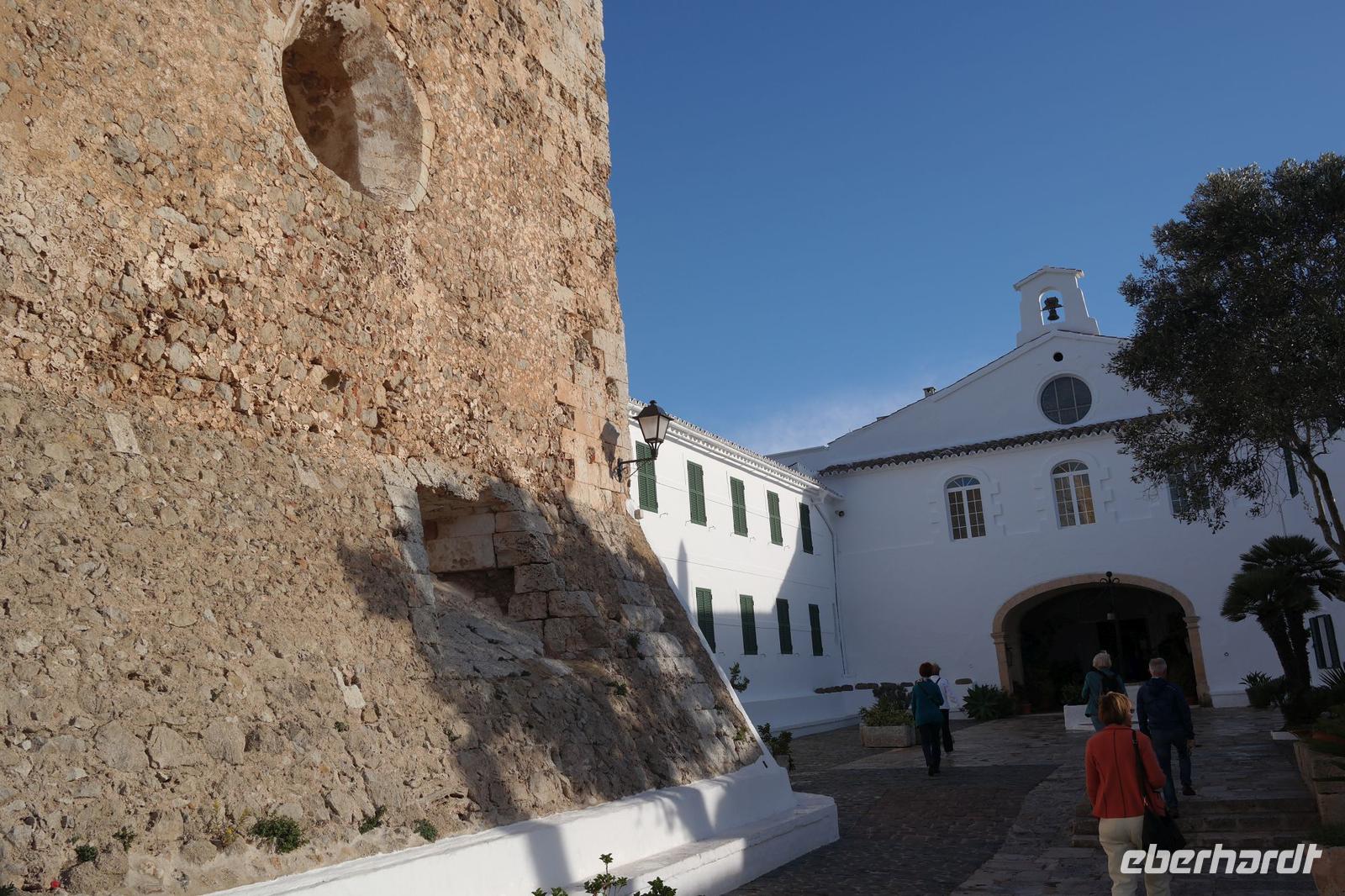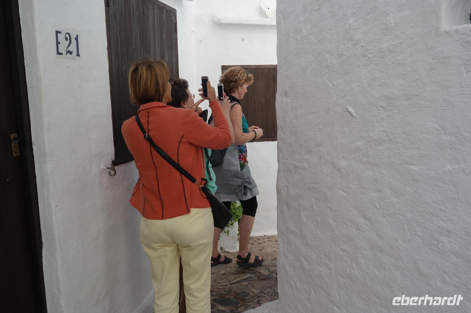 Die Wanderschuhe dürfen heute auslüften - wir nehmen den Bus. Es geht zum höchsten Berg der Insel - „El Toro" - zugleich wichtiger Wallfahrtsort (Kloster Santa Maria) - von hier können wir die kleine Insel in alle Himmelsrichtungen überblicken und in der kleinen Kirche unsere Wünsche und Gebete zurücklassen. Danach geht es in die Hauptstadt Mahon (katalan.: Mao) - berühmt für den größten Naturhafen Europas, thront die Stadt auf einem Felsplateau über der 5 km langen Bucht, die eine ganze Flotte beherbergen kann. Wir schlendern über die Plazzas, durch enge Gassen und genießen um die Mittagszeit ein Orgelkonzert in der Kirche der Heiligen Maria. Von Plakaten erfahren wir, dass selbst auf Menorca das „Oktoberfest" gefeiert wird - kein Wunder also, wenn auf der Wies'n die Leute ausbleiben. Wir fahren weiter über Sant Lluis, sehen den Leuchtturm auf der „Luftinsel" und drehen ab in Richtung Südwest in das kleine Fischerörtchen Binibèquer. Die kleinen Häuser - komplett weiß angestrichen (auch Dächer, Kamine und Antennen sind weiß) bilden mit den engen Gäßchen ein einzigartiges Labyrinth - wir finden trotzdem den Weg in eine kleine Bar und lassen uns Eiscafè und Anderes schmecken. Unsere letzte Station für heute sind die Naturhöhlen von Xoroi. Diese Höhlen sind nur vom Meer aus zu sehen - in den Felsen wurde eine Treppe eingebaut und von hier bietet sich uns ein spektakulärer Blick auf die tosende Brandung. In den Höhlen finden sich heute kleine Bars - wir können uns gut vorstellen, dass hier das Nachtleben pulsiert - deshalb sind wir am Nachmittag gekommen .