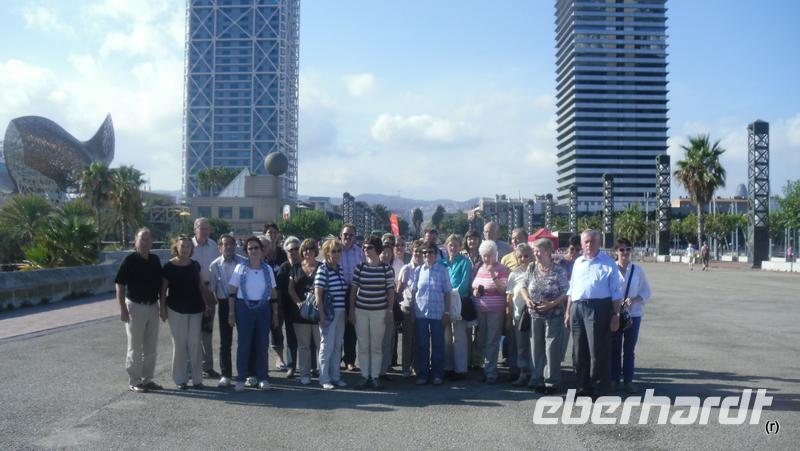 Am Sonntagmorgen flogen wir von Dresden und die andere Gruppe von Leipzig über München, wo die beiden Gruppen sich treffen sollten, nach Barcelona. Beide Flüge hatten eine Verspätung von etwa 30 Minuten durch Bodennebel in München. Es wurde zeitlich dadurch schon knapp für den Anschlussflug nach Barcelona, aber es kamen noch ein wenig seltsame Umständen dazu, die dazu führten, dass die Leipziger-Gruppe einfach nicht am vereinbarten Treffpunkt am Abfluggate auftauchten. Glücklicherweise kam letztlich dann aber auch die Gästegruppe aus Leipzig aus ihrem Flieger und konnten noch rechtzeitig nach Barcelona boarden und so flogen wir beruhigt und voller Vorfreude nach Barcelona.In Barcelona erwarteten uns die örtliche Reiseleiterin Stephanie und der Busfahrer Gustavus und begrüßten uns herzlich am Ausgang. Gustavus brachte die Gäste zum Bus während Stephanie und ich uns zusammen mit einem Gast um eine Koffersache am Flughafenschalter kümmerten. Nachdem alles glücklich geklärt war, fuhren wir los und machten gleich eine kleine Orientierungsfahrt durch Barcelona und einen Erfrischungs-Stopp und eine Kaffeepause auf dem Montjüic und genossen das wunderbare warme milde Klima und das Ankommen. Dann ging es zum Anell Olimpic und wir stiegen aus und ließen uns das Stadion erklären und zeigen.