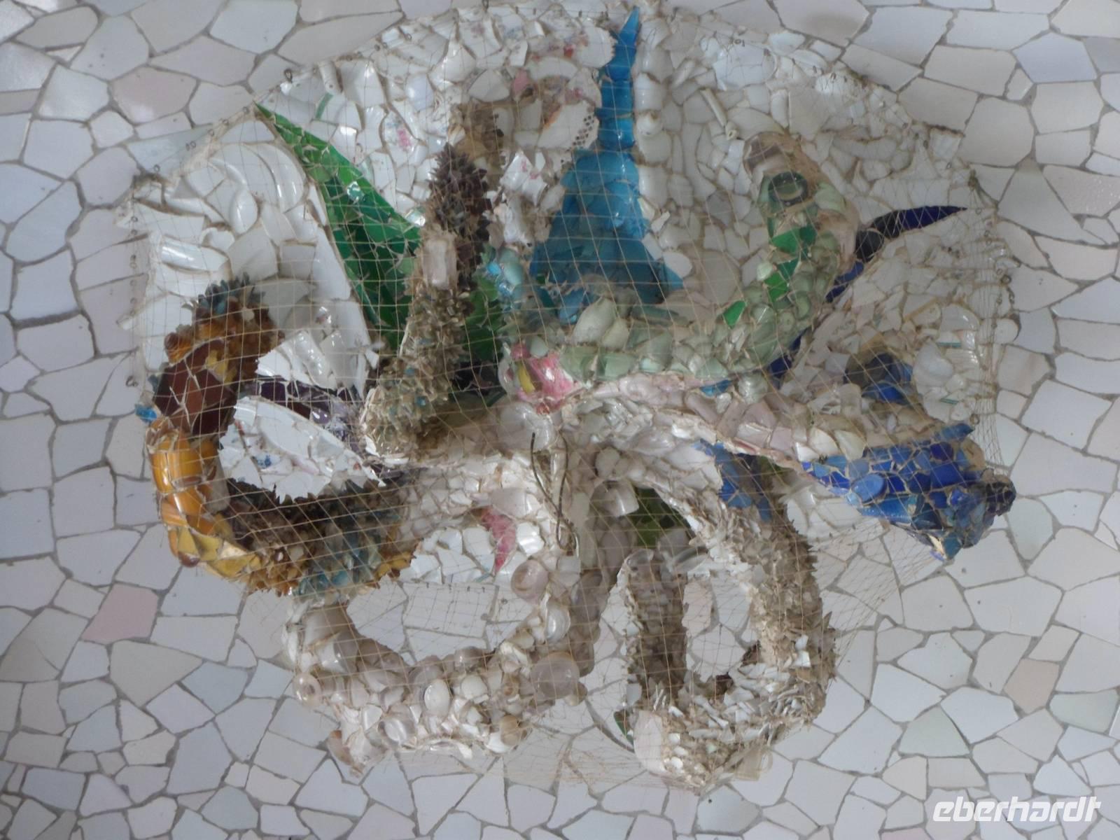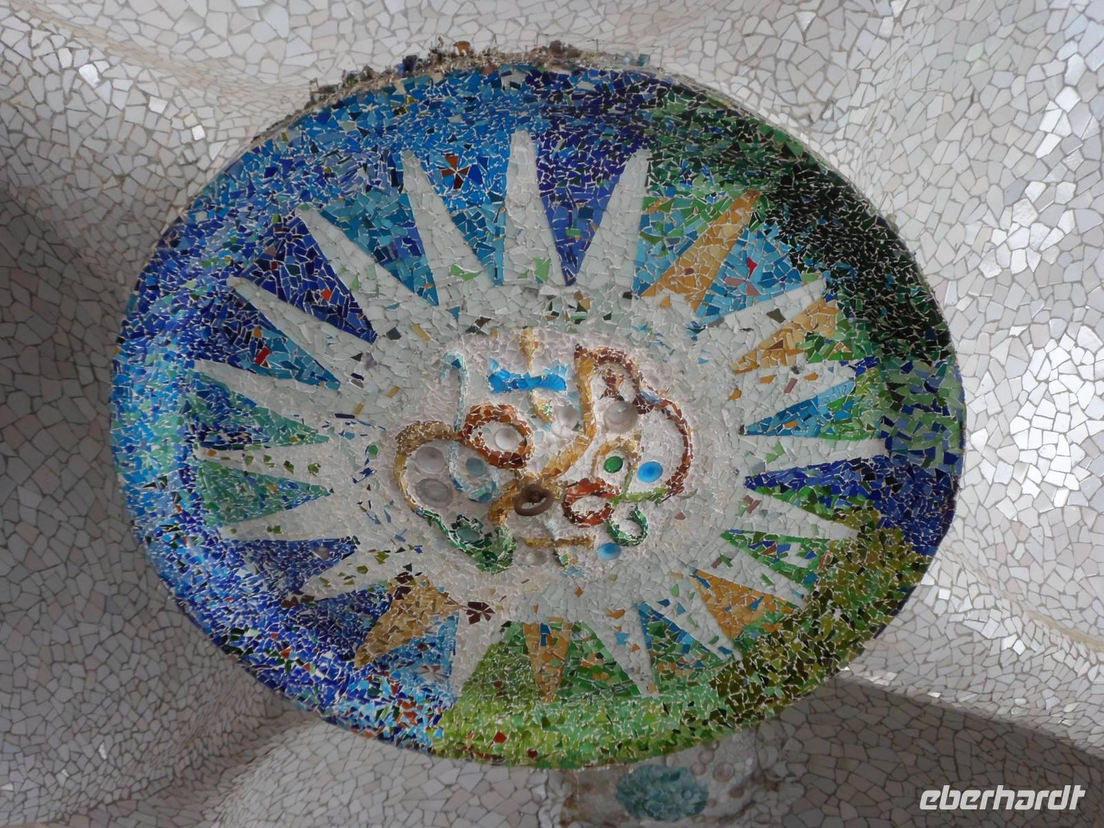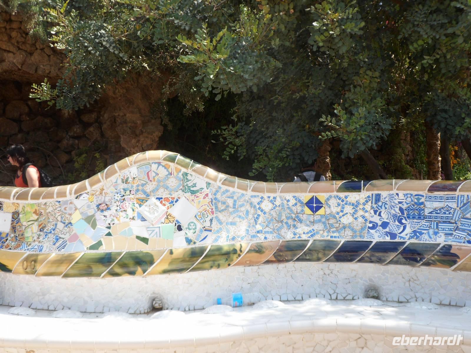 Weiter ging es nun zum Park Güel, der geplanten kleinen Gartenstadt, wofür 1910 A. Gaudi den Bauauftrag bekam. Leider wurden nur 2 Häuser gebaut. Übrig blieb der Park, einer der originellsten öffentlichen Anlagen die je konzipiert wurden. Die Natursteinarkaden und Viadukte sind einmalig und die Details mit Trencadis - Mosaiken unbeschreiblich. Hier kann man die 150m lange Wellenbank bestaunen oder, falls man ein Plätzchen findet , einfach nur ausruhen.