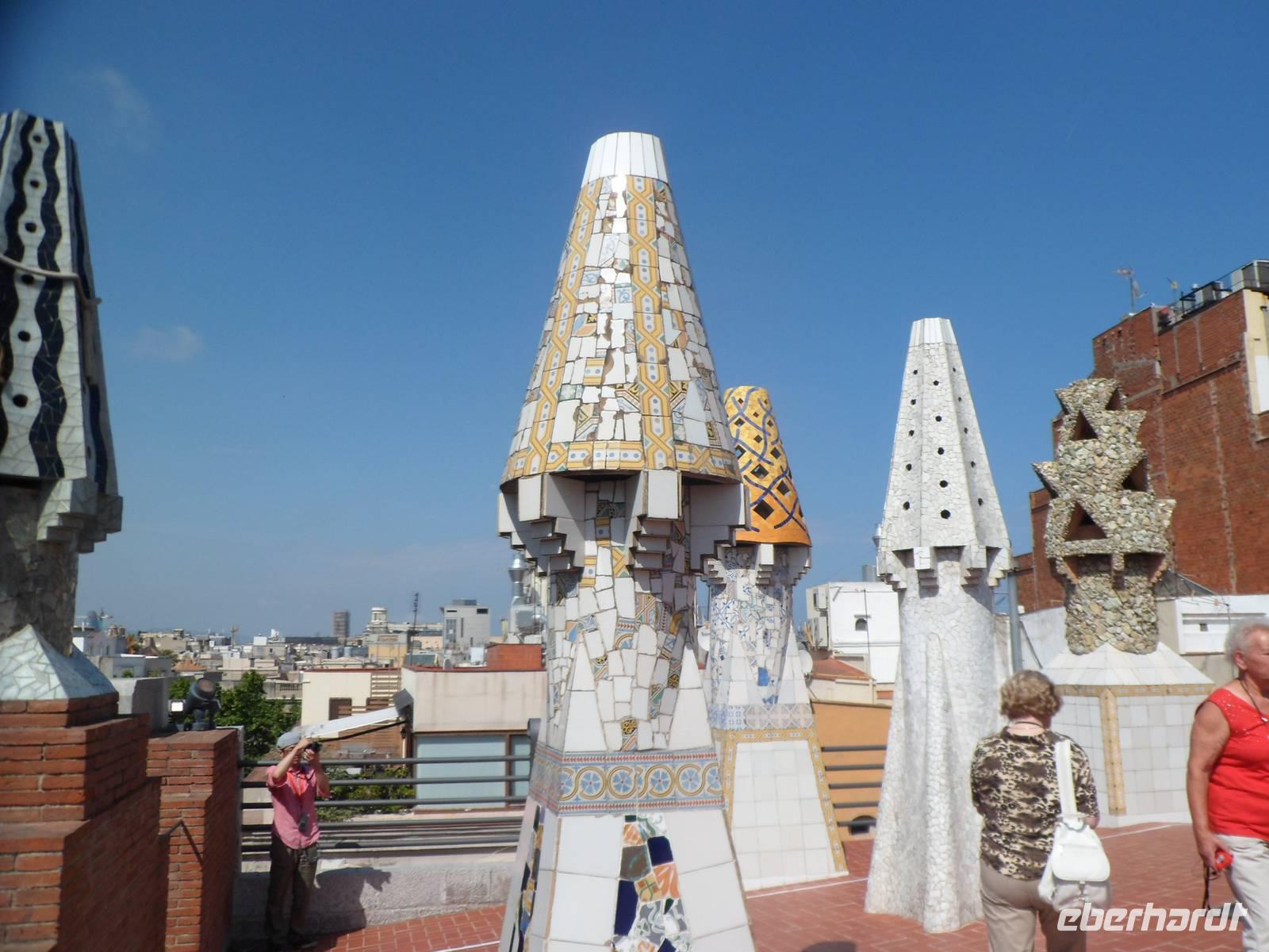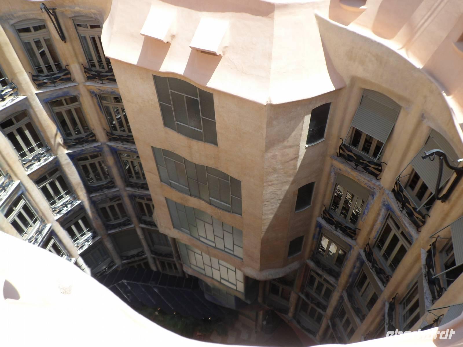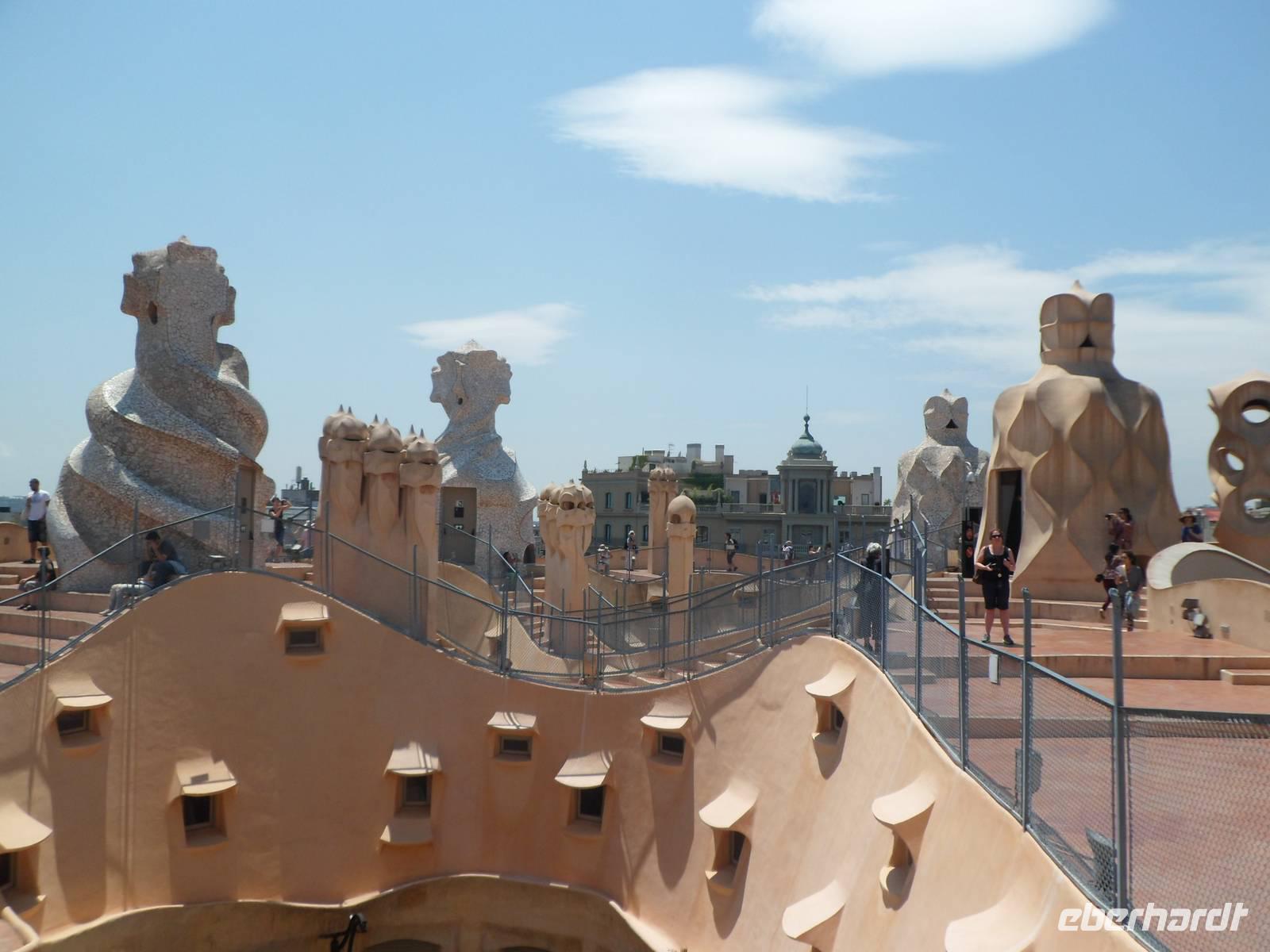 Gegen 13.20 Uhr fuhren wir weiter zum Casa Mila Haus. Gaudis wichtigster Beitrag zur Stadtarchitektur und sein letztes Werk, bevor er sich der Sagrada Familia widmete. Das Haus weicht völlig von allen damaligen Grunsätzen ab. Es beherbergt die erste Tiefgarage der Stadt, hat zwei runde Innenhöfe, schmiedeeiserne Balkone ung gewellte Mauern aus unbehauenem Stein. Das sensationelle Dach mit kunstvoll gearbeiteten Luftröhren und Kaminen ist so bizarr, das man es "Hexenschreck" nannte.