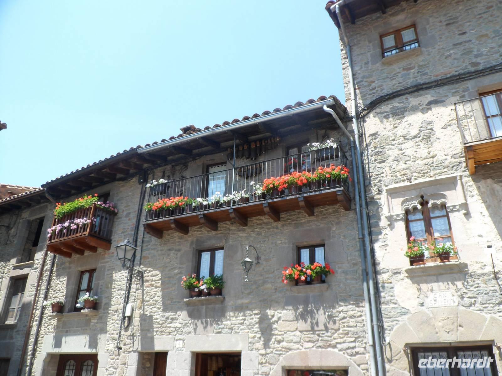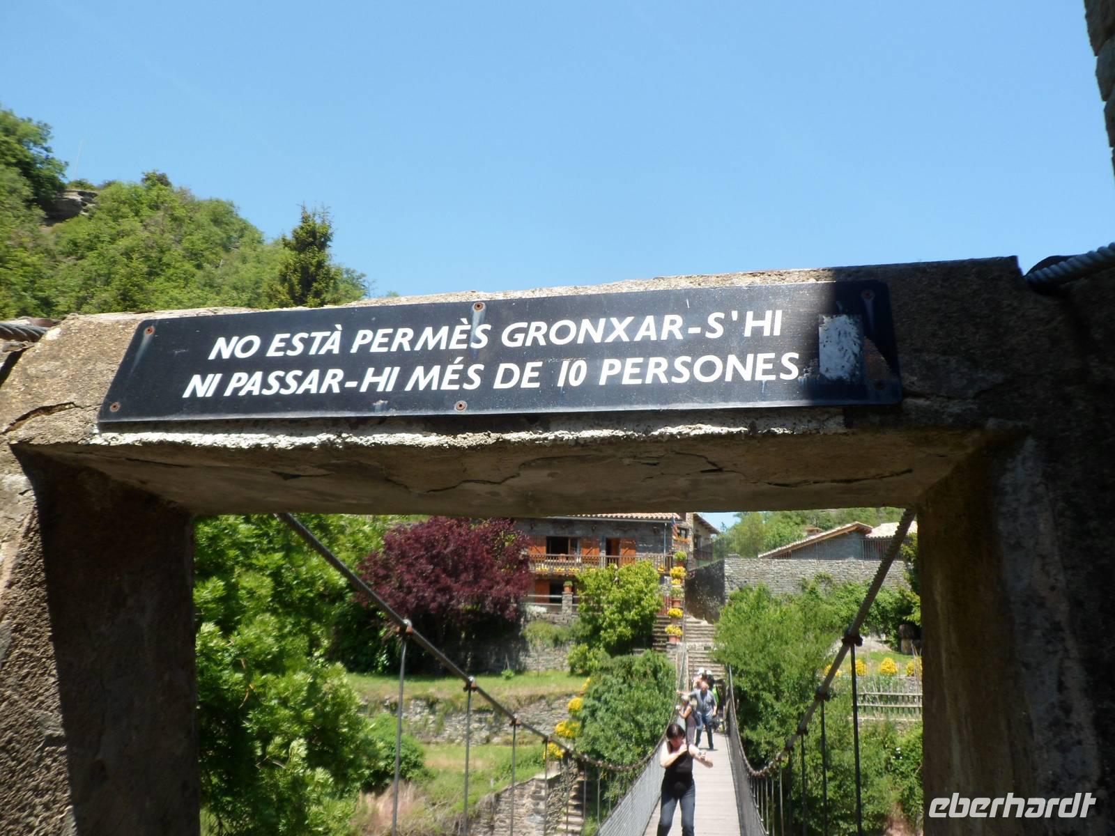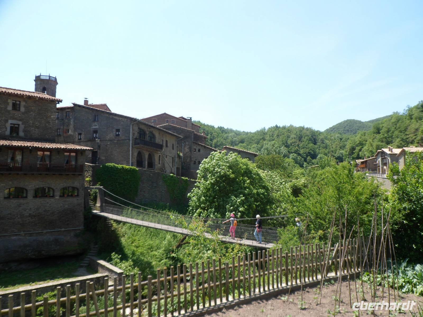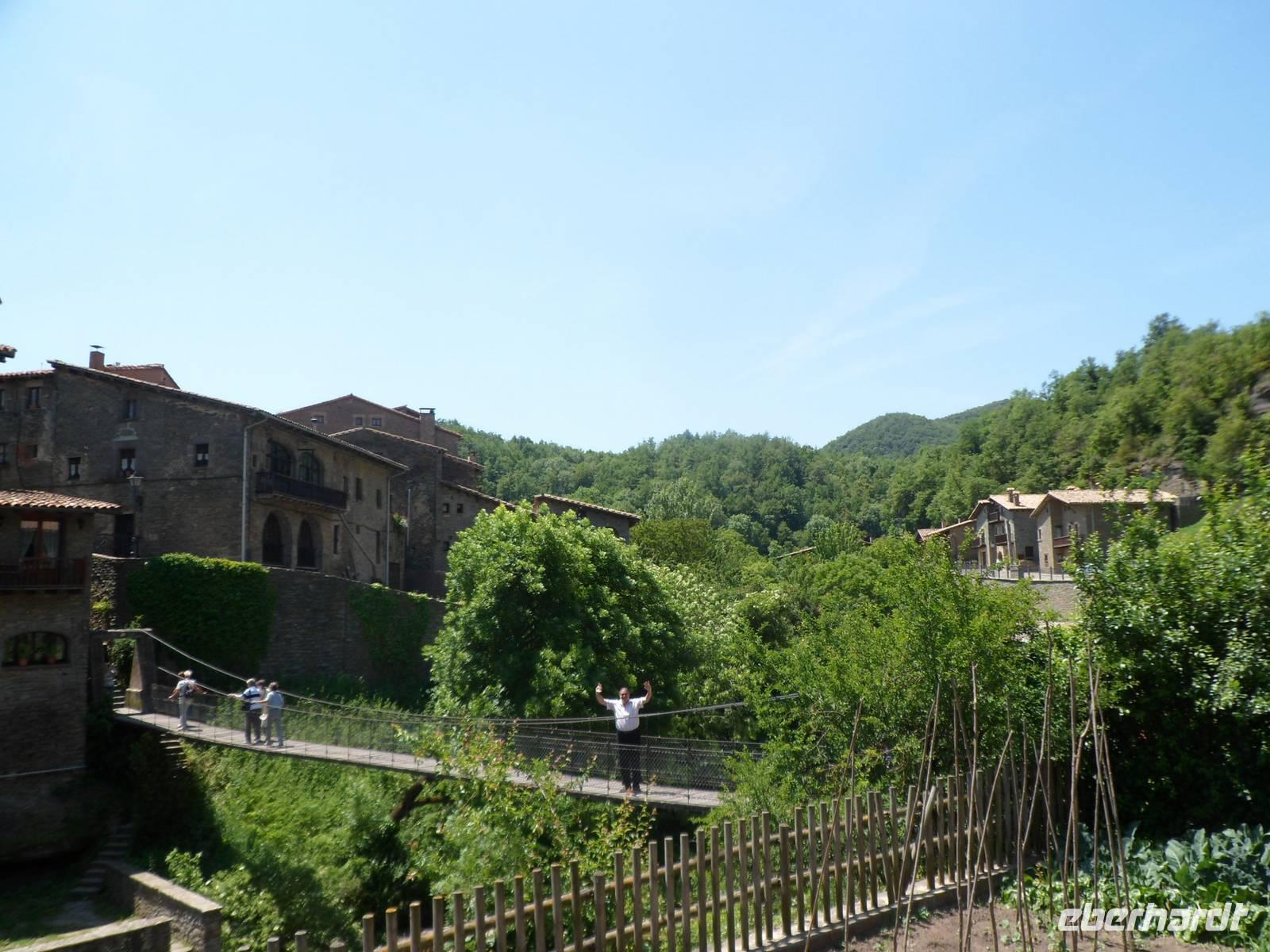 Vorbei an großen Feldern und Wäldern, blühenden Wiesen und die Pyränäen in der Ferne kamen wir 12.45 Uhr im Kleinen Ort Rupit an. Mit viel Spaß über die Hängebrücke erreichten wir das Örtchen mit den kleinen Steinhäusern in 1000m Höhe. Sehr beeindruckend und still liegt es inmitten einer Felsenlandschaft und ist heute ein Künstlerdorf. Es gibt eine Grundschule, eine Post, Kunstlädchen, Lebenmittelmarkt mit Fleischer und Bäcker und überall liebevoll dekorierte Fenster und Mauern. Einfach ein Ort zum verweilen und träumen, aber auch ein wunderschönes Wandergebiet. Etwa 14.00 Uhr fuhren wir über den Aussichtspunkt mit der kleinen Kapelle "Maria del Far", wo man von 1200m Höhe Girona, das Meer, die Berge der Pyränäen, zwei große Stauseen und eine traumhafte Landschaft sehen kann.