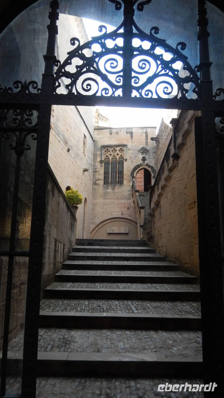 Nach dieser beeindruckenden Besichtigung laufen wir über die la Rambla, die Fußgängerzone der Stadt, besuchen die berühmte Kreuzkathedrale mit den Künstlern vor der Kirche - heute ist es ein Mann ohne Kopf, mit dem sich ein Reisegast fotografieren. In der Markthalle Katharina machen wir unsere Mittagspause und können hier nicht nur Obst, Fisch, Fleisch und Gemüse, sondern noch allerhand mehr kaufen. Nach der Mittagspause geht es weiter zu Fuß und wir machen Gebrauch von unseren Regenschirmen. Wir sehen das Rathaus, das Cuatre Gats, die kleine Bar, in der sich früher berühmte Künstler trafen, mit Bild von Picasso vor dem Eingang. Da es mittlerweile stark regnet, nehmen wir die Metro und fahren zur Casa Mila, ein Haus, das Gaudi für Familie Mila erbaut hat, das ihnen aber nie richtig gefiel. Wir können alle nicht nachvollziehen wieso. Das Gebäude ist beeindruckend! Wir besichtigen das Museum im Dachgeschoss und sehen uns anschließend eine der Wohnungen an. Am Abend kehren wir in eine typisch spanische Tapas-Bar ein und laufen gemeinsam zurück zum Hotel. Ein anstrengender, nasser, aber durchaus eindrucksvoller und schöner Tag geht zu Ende.