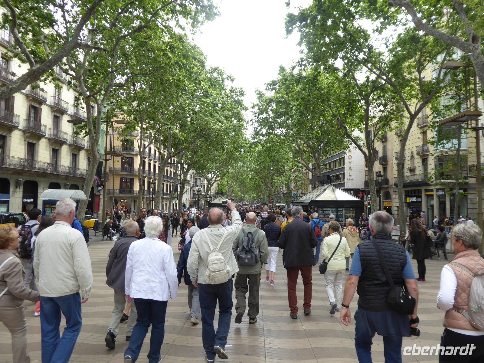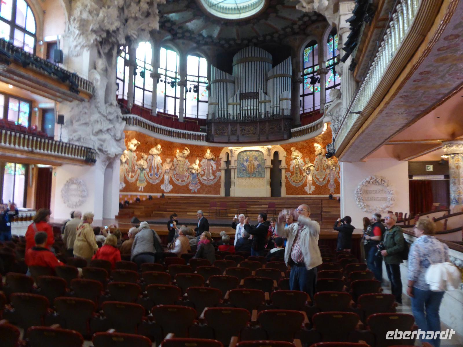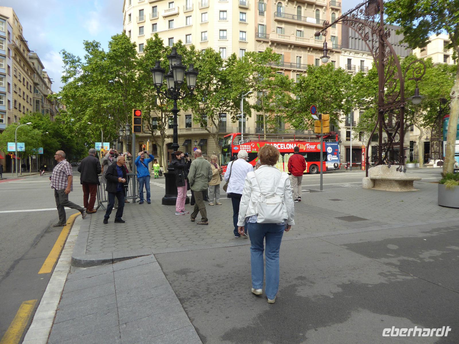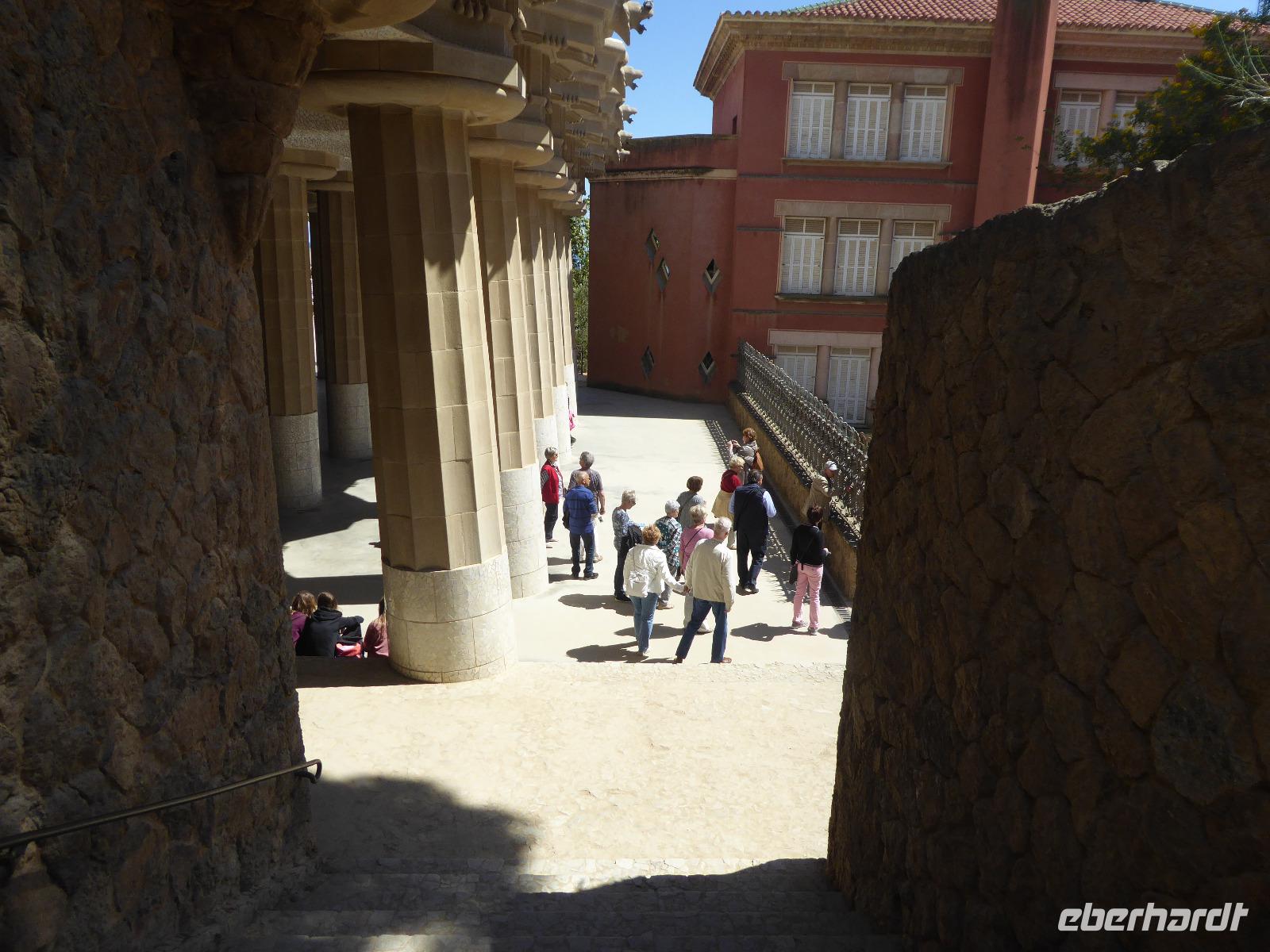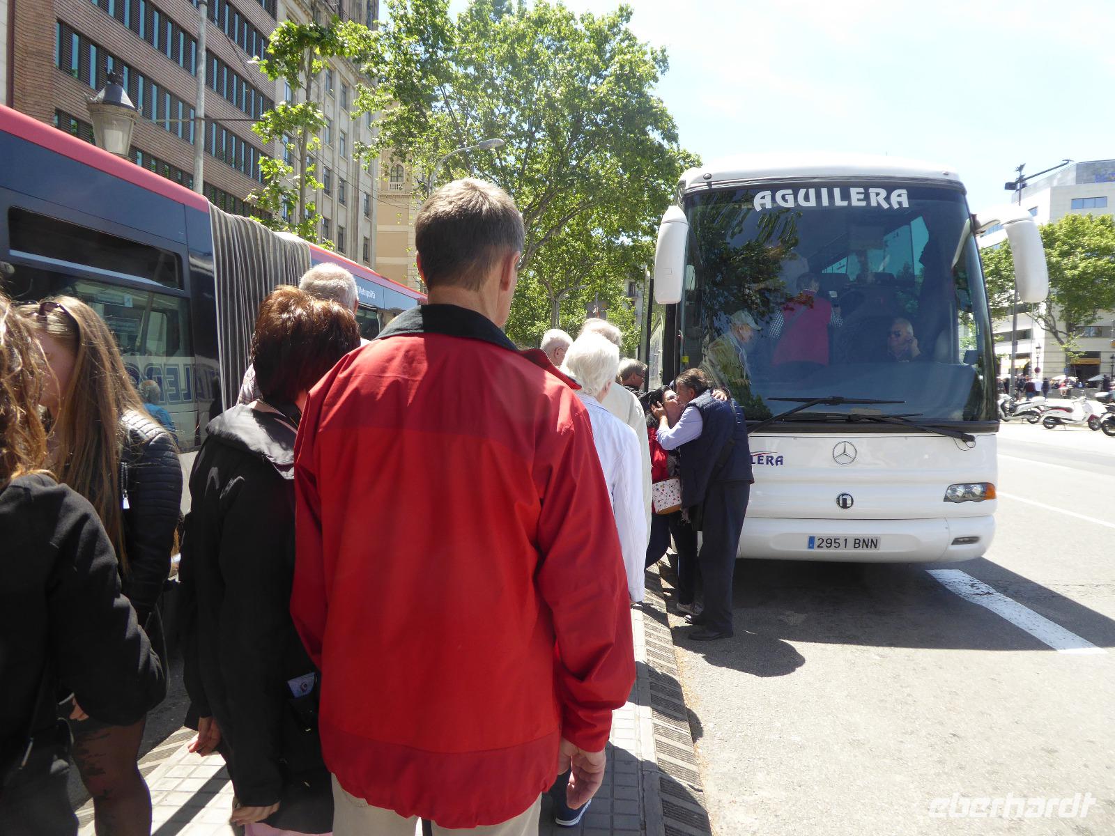 Nach einem ausgiebigen Frühstück treffen wir uns punkt Neun mit Lorenzo in der Lobby. Der Bus ist auch schon da und mit José , unserem Busfahrer, geht es heute kreuz und quer durch Barcelona. Zunächst fahren wir auf der längsten Straße der schachbrettangeordneten Stadt, der La Grande bis ins Zentrum. Auffällig sind die wunderschönen Fassaden der Häuser. Wir besuchen die Casa Mila. Die Wartezeit verkürzt uns unterhaltend eine Dame aus einer anderen Gruppe, die auf Krawall gebürstet ist und sich mit Carlos anlegt, weil sie meint, wir hätten uns vorgedrängelt. Da ist sie aber an den Richtigen geraten. Carlos lässt sich die Butter nicht vom Brot nehmen. Zu ihrer Beruhigung ist ihre Gruppe dann tatsächlich vor uns dran. Es dauert ein bisschen, aber bald schluckt auch uns dieses ungewöhnliche Haus. Wir bekommen Audioguides und fahren in kleinen Grüppchen mit dem Fahrstuhl auf die Terrasse. Was für eine grandiose Anlage. Die Bewohner hatten es hier wirklich gut. Nachdem wir die Aussicht nach allen Seiten genossen haben, geht es treppab durch das ganze Haus. Wir bewundern die Konstruktion des Dachbodens, schlendern an den Zimmern vorbei, deren Einrichtung so manche Erinnerung weckt. Obwohl wir so viel Zeit hatten, müssen wir uns jetzt doch sputen, denn wir haben bald den nächsten Termin. Um 11.30 Uhr werden wir im Musikpalast erwartet. Hier treffen wir auch auf die andere Eberhardt-Gruppe mit meinem lieben Kollegen Benjamin. Zunächst sehen wir einen Film über die Geschichte des Hauses, der zwar in Spanisch ist, aber durch die Bilder trotz Sprachunkenntnis, verstanden werden kann. Bei der Führung ist es dann etwas anders. Wir werden aufgefordert, einer spanisch sprechenden Führerin zu folgen, die unserem Lorenzo aber keine Chance lässt, für uns zu übersetzen. Wir beobachten die Auseinandersetzung der Beiden, aber diese Dame ist unerbittlich, sie hat für das Anliegen der deutschen Gäste kein Verständnis. Lorenzo tut was er kann und informiert uns trotzdem über das Geschehen im Musikpalast. Zu aller Überraschung bringt uns Benjamin ein Ständchen und erfreut damit nicht nur uns, sondern auch die Gäste der unnahbaren Reiseführerin. Anschließend genießen wir während der Mittagspause Tappas, Kaffee oder Bier je nach Bedarf. Eine ganze Stunde ist Zeit für Müßiggang. Nun fahren wir zum Park Güell. Wir haben so ein Glück, die Sonne scheint, der Himmel ist strahlend blau und die Fliesenscherben, die die Säulen schmücken, funkeln und glitzern. Wir spazieren durch die traumhafte Anlage und haben ausreichend Zeit, uns satt zu fotografieren. Auch unser Gruppenfoto entsteht hier.