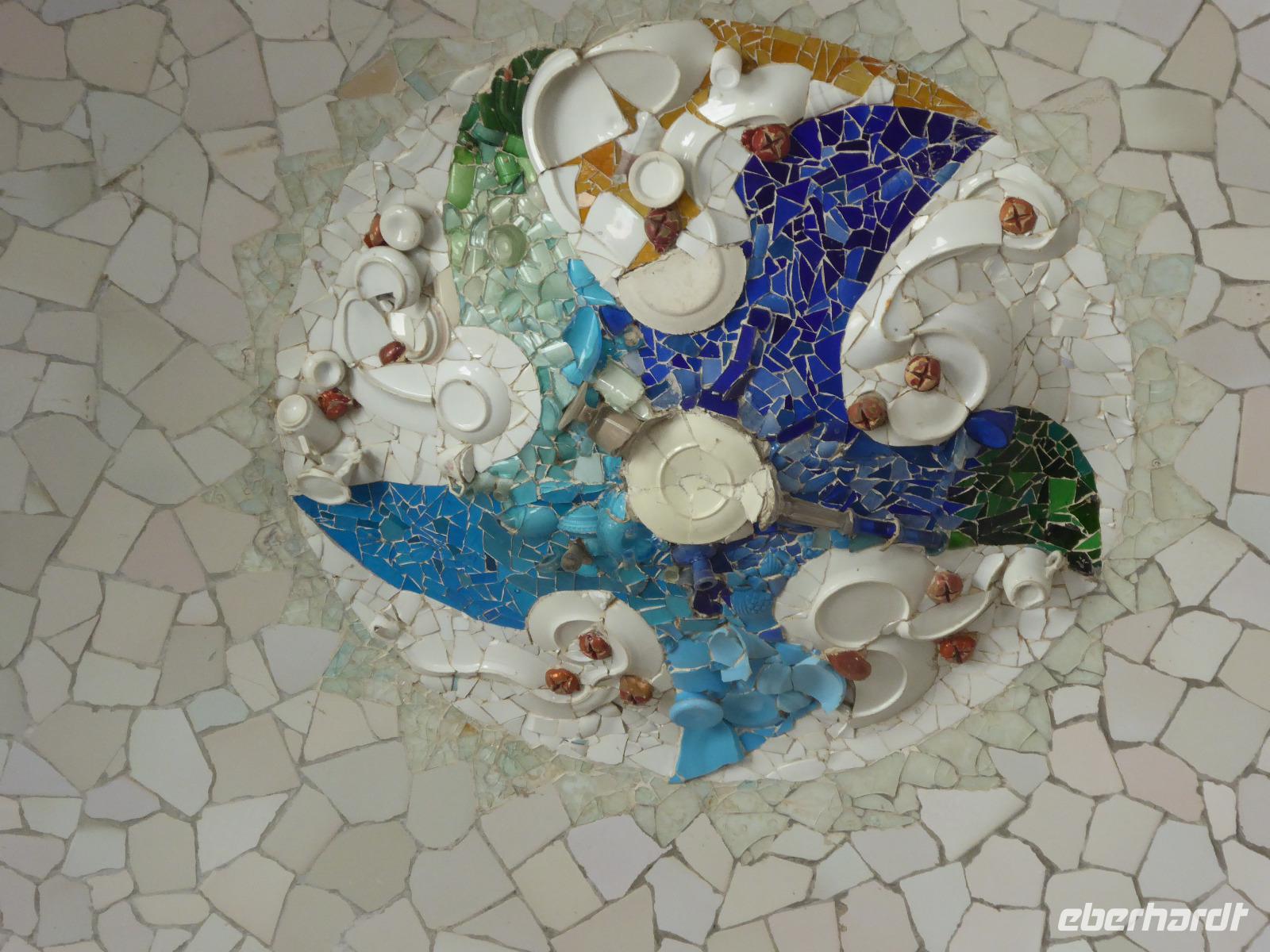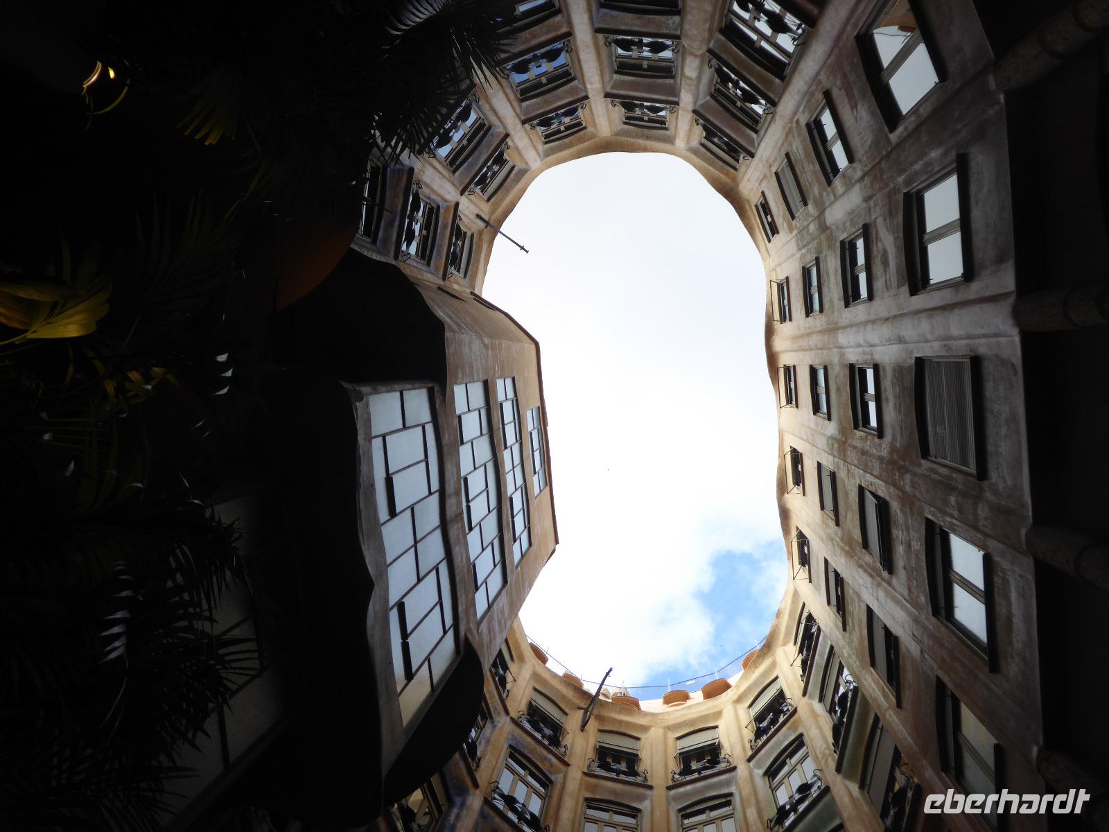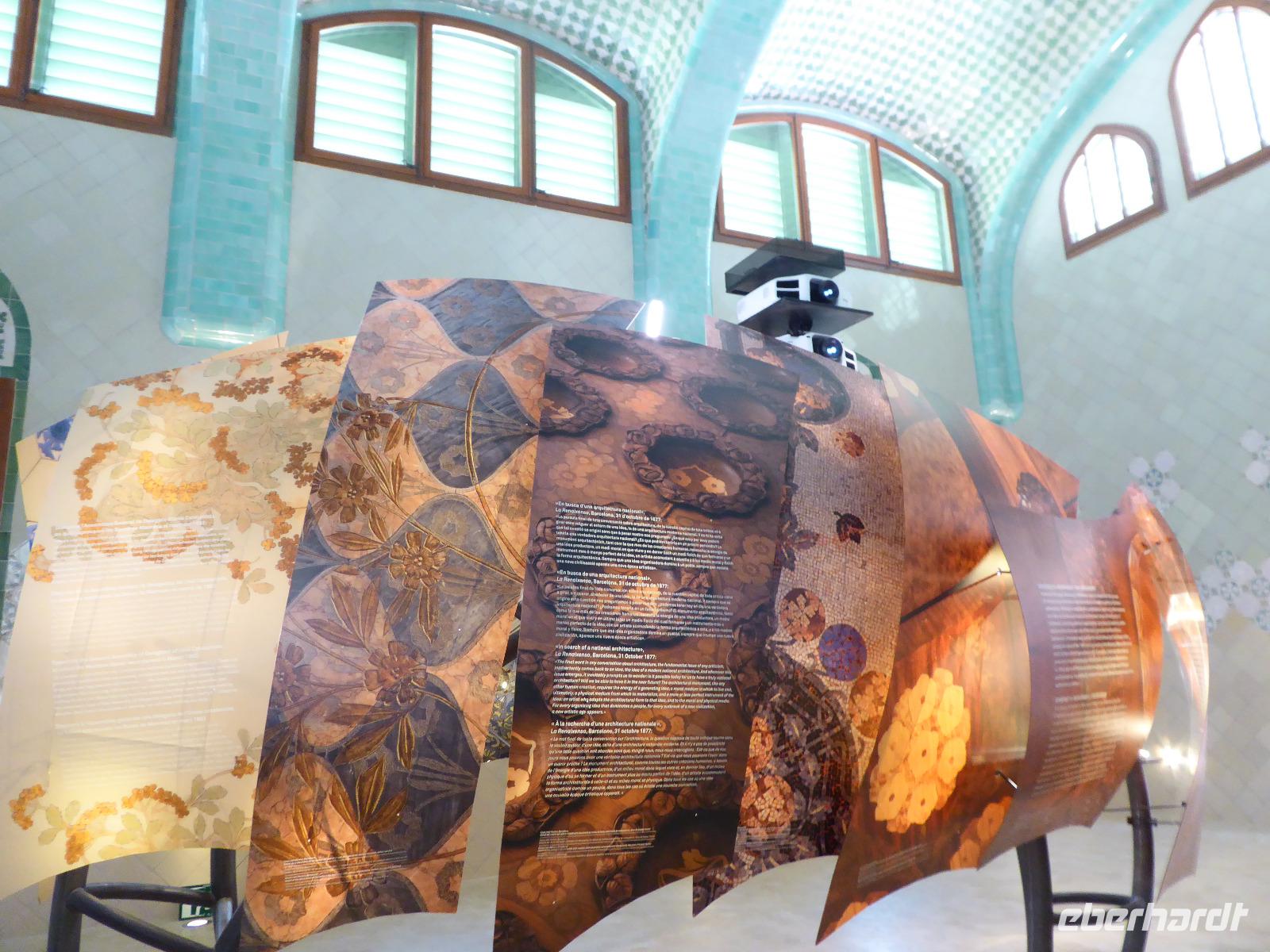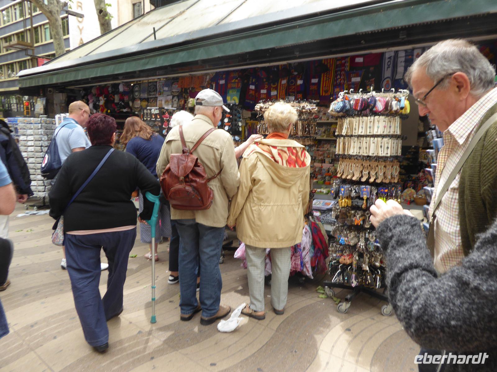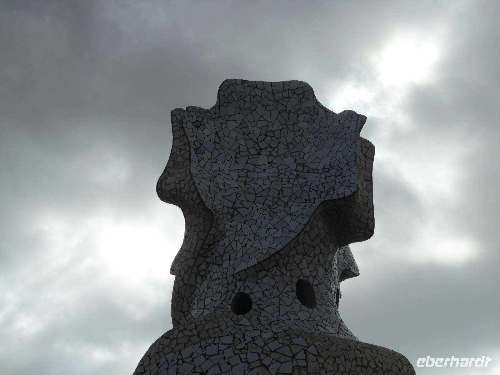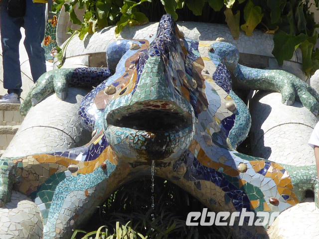 Nach einem ausgiebigen Frühstück treffen wir uns punkt Neun mit Lorenzo in der Lobby. Der Bus ist auch schon da und mit José , unserem Busfahrer, geht es heute kreuz und quer durch Barcelona. Zunächst fahren wir auf der längsten Straße der schachbrettangeordneten Stadt, der La Grande bis ins Zentrum. Auffällig sind die wunderschönen Fassaden der Häuser. Wir besuchen die Casa Mila. Die Wartezeit verkürzt uns unterhaltend eine Dame aus einer anderen Gruppe, die auf Krawall gebürstet ist und sich mit Carlos anlegt, weil sie meint, wir hätten uns vorgedrängelt. Da ist sie aber an den Richtigen geraten. Carlos lässt sich die Butter nicht vom Brot nehmen. Zu ihrer Beruhigung ist ihre Gruppe dann tatsächlich vor uns dran. Es dauert ein bisschen, aber bald schluckt auch uns dieses ungewöhnliche Haus. Wir bekommen Audioguides und fahren in kleinen Grüppchen mit dem Fahrstuhl auf die Terrasse. Was für eine grandiose Anlage. Die Bewohner hatten es hier wirklich gut. Nachdem wir die Aussicht nach allen Seiten genossen haben, geht es treppab durch das ganze Haus. Wir bewundern die Konstruktion des Dachbodens, schlendern an den Zimmern vorbei, deren Einrichtung so manche Erinnerung weckt. Obwohl wir so viel Zeit hatten, müssen wir uns jetzt doch sputen, denn wir haben bald den nächsten Termin. Um 11.30 Uhr werden wir im Musikpalast erwartet. Hier treffen wir auch auf die andere Eberhardt-Gruppe mit meinem lieben Kollegen Benjamin. Zunächst sehen wir einen Film über die Geschichte des Hauses, der zwar in Spanisch ist, aber durch die Bilder trotz Sprachunkenntnis, verstanden werden kann. Bei der Führung ist es dann etwas anders. Wir werden aufgefordert, einer spanisch sprechenden Führerin zu folgen, die unserem Lorenzo aber keine Chance lässt, für uns zu übersetzen. Wir beobachten die Auseinandersetzung der Beiden, aber diese Dame ist unerbittlich, sie hat für das Anliegen der deutschen Gäste kein Verständnis. Lorenzo tut was er kann und informiert uns trotzdem über das Geschehen im Musikpalast. Zu aller Überraschung bringt uns Benjamin ein Ständchen und erfreut damit nicht nur uns, sondern auch die Gäste der unnahbaren Reiseführerin. Anschließend genießen wir während der Mittagspause Tappas, Kaffee oder Bier je nach Bedarf. Eine ganze Stunde ist Zeit für Müßiggang. Nun fahren wir zum Park Güell. Wir haben so ein Glück, die Sonne scheint, der Himmel ist strahlend blau und die Fliesenscherben, die die Säulen schmücken, funkeln und glitzern. Wir spazieren durch die traumhafte Anlage und haben ausreichend Zeit, uns satt zu fotografieren. Auch unser Gruppenfoto entsteht hier.