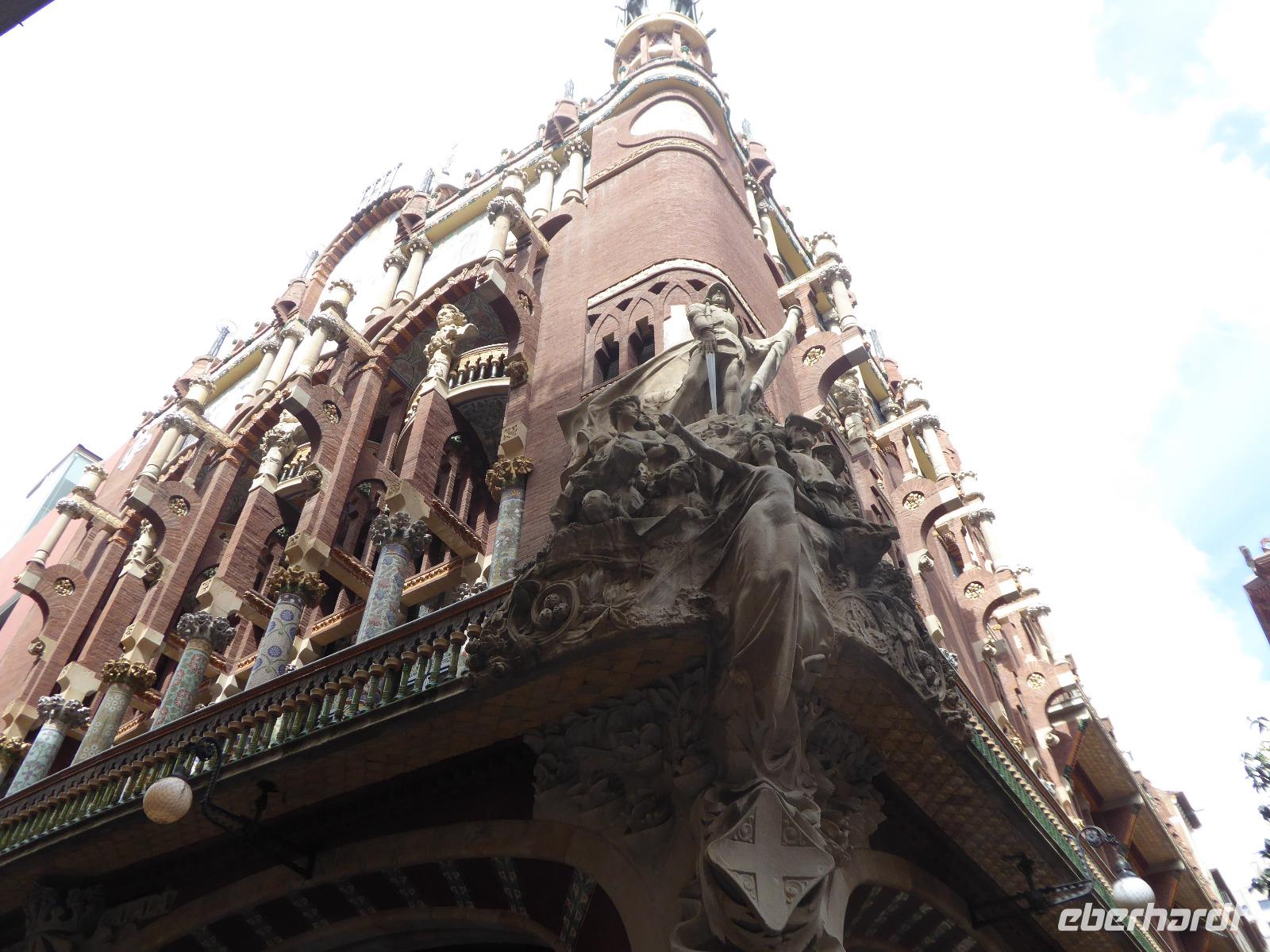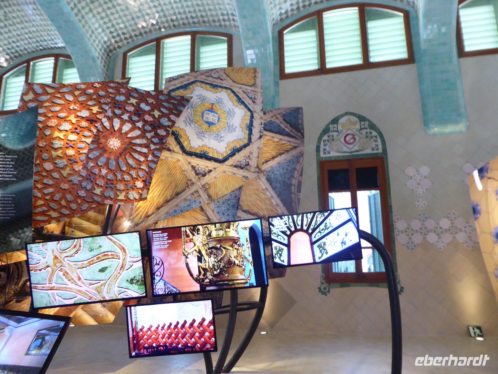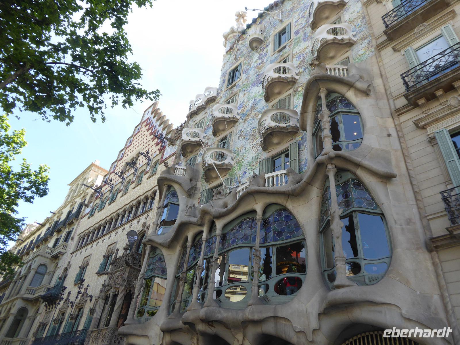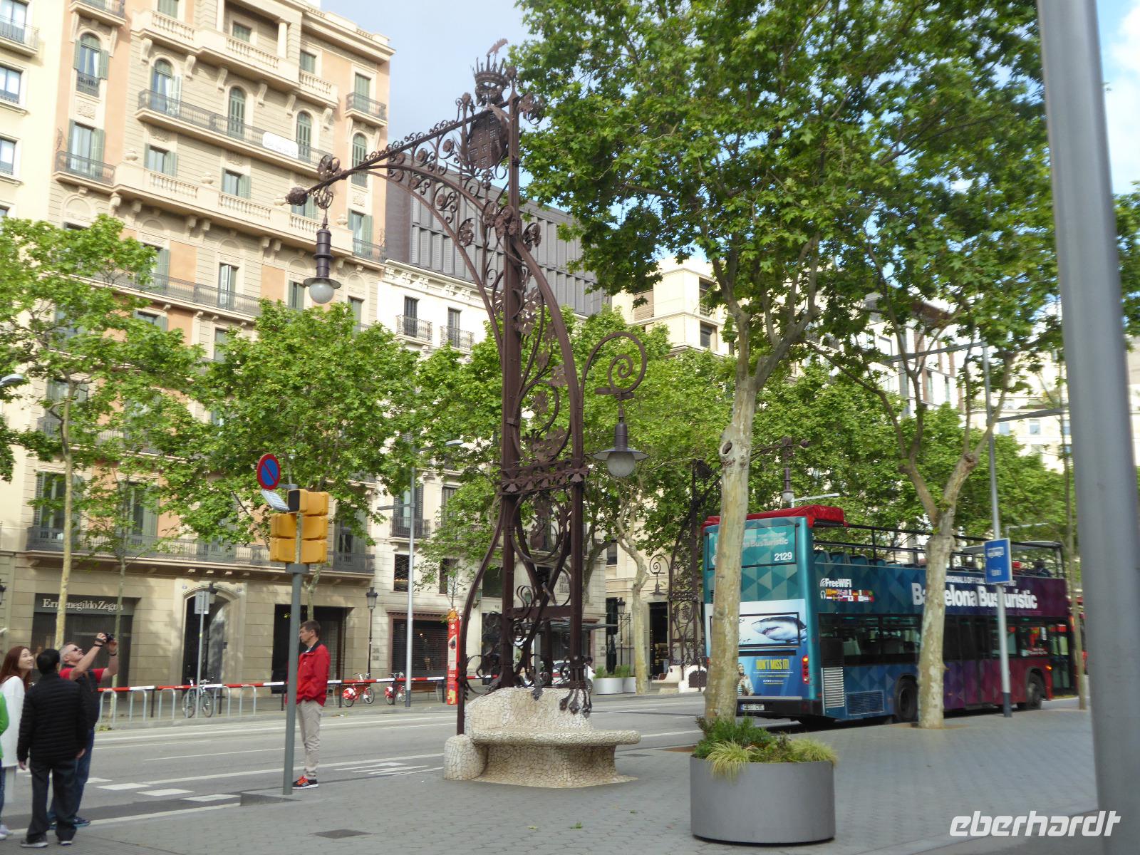 Nach einem ausgiebigen Frühstück treffen wir uns punkt Neun mit Lorenzo in der Lobby. Der Bus ist auch schon da und mit José , unserem Busfahrer, geht es heute kreuz und quer durch Barcelona. Zunächst fahren wir auf der längsten Straße der schachbrettangeordneten Stadt, der La Grande bis ins Zentrum. Auffällig sind die wunderschönen Fassaden der Häuser. Wir besuchen die Casa Mila. Die Wartezeit verkürzt uns unterhaltend eine Dame aus einer anderen Gruppe, die auf Krawall gebürstet ist und sich mit Carlos anlegt, weil sie meint, wir hätten uns vorgedrängelt. Da ist sie aber an den Richtigen geraten. Carlos lässt sich die Butter nicht vom Brot nehmen. Zu ihrer Beruhigung ist ihre Gruppe dann tatsächlich vor uns dran. Es dauert ein bisschen, aber bald schluckt auch uns dieses ungewöhnliche Haus. Wir bekommen Audioguides und fahren in kleinen Grüppchen mit dem Fahrstuhl auf die Terrasse. Was für eine grandiose Anlage. Die Bewohner hatten es hier wirklich gut. Nachdem wir die Aussicht nach allen Seiten genossen haben, geht es treppab durch das ganze Haus. Wir bewundern die Konstruktion des Dachbodens, schlendern an den Zimmern vorbei, deren Einrichtung so manche Erinnerung weckt. Obwohl wir so viel Zeit hatten, müssen wir uns jetzt doch sputen, denn wir haben bald den nächsten Termin. Um 11.30 Uhr werden wir im Musikpalast erwartet. Hier treffen wir auch auf die andere Eberhardt-Gruppe mit meinem lieben Kollegen Benjamin. Zunächst sehen wir einen Film über die Geschichte des Hauses, der zwar in Spanisch ist, aber durch die Bilder trotz Sprachunkenntnis, verstanden werden kann. Bei der Führung ist es dann etwas anders. Wir werden aufgefordert, einer spanisch sprechenden Führerin zu folgen, die unserem Lorenzo aber keine Chance lässt, für uns zu übersetzen. Wir beobachten die Auseinandersetzung der Beiden, aber diese Dame ist unerbittlich, sie hat für das Anliegen der deutschen Gäste kein Verständnis. Lorenzo tut was er kann und informiert uns trotzdem über das Geschehen im Musikpalast. Zu aller Überraschung bringt uns Benjamin ein Ständchen und erfreut damit nicht nur uns, sondern auch die Gäste der unnahbaren Reiseführerin. Anschließend genießen wir während der Mittagspause Tappas, Kaffee oder Bier je nach Bedarf. Eine ganze Stunde ist Zeit für Müßiggang. Nun fahren wir zum Park Güell. Wir haben so ein Glück, die Sonne scheint, der Himmel ist strahlend blau und die Fliesenscherben, die die Säulen schmücken, funkeln und glitzern. Wir spazieren durch die traumhafte Anlage und haben ausreichend Zeit, uns satt zu fotografieren. Auch unser Gruppenfoto entsteht hier.