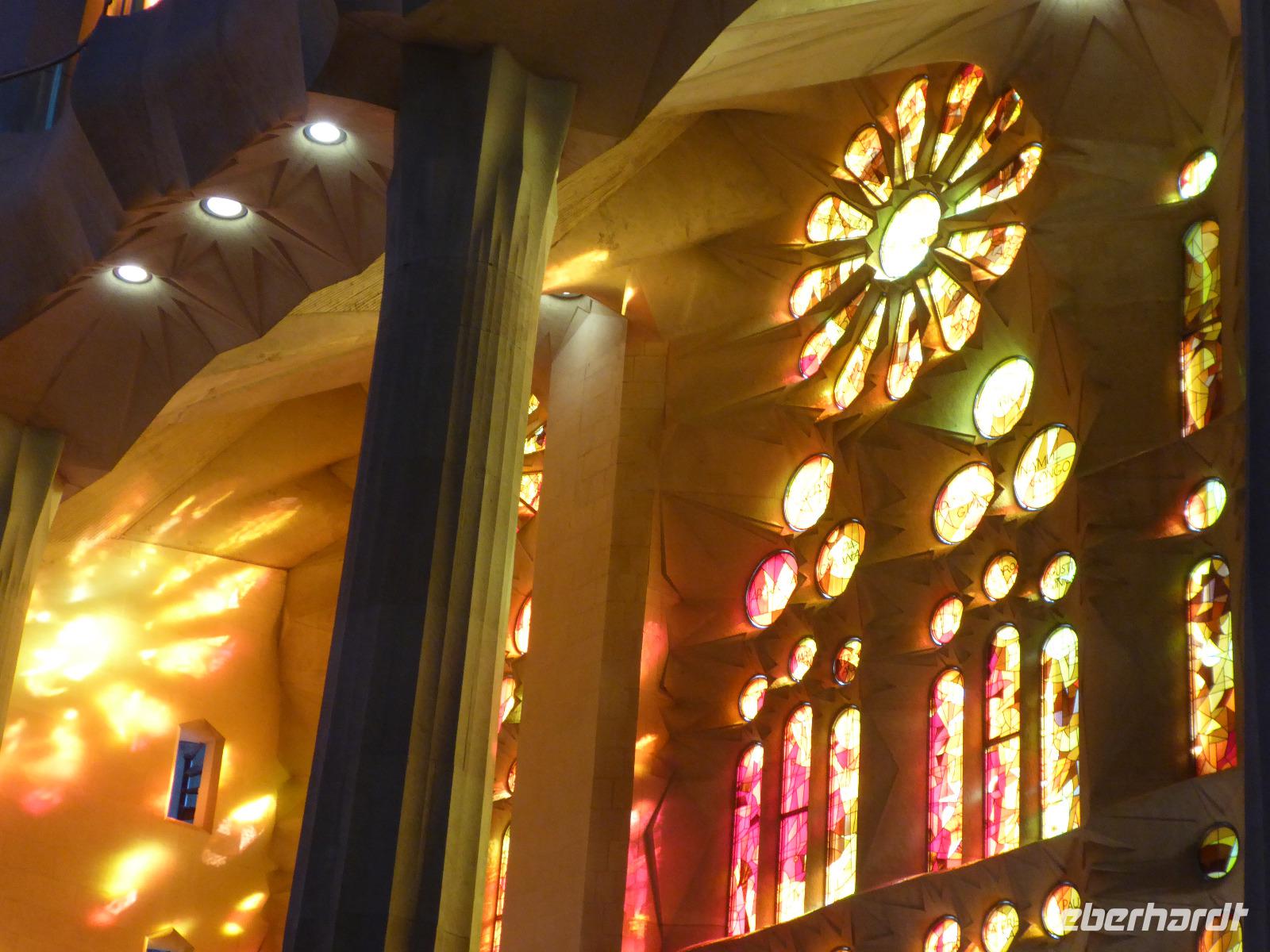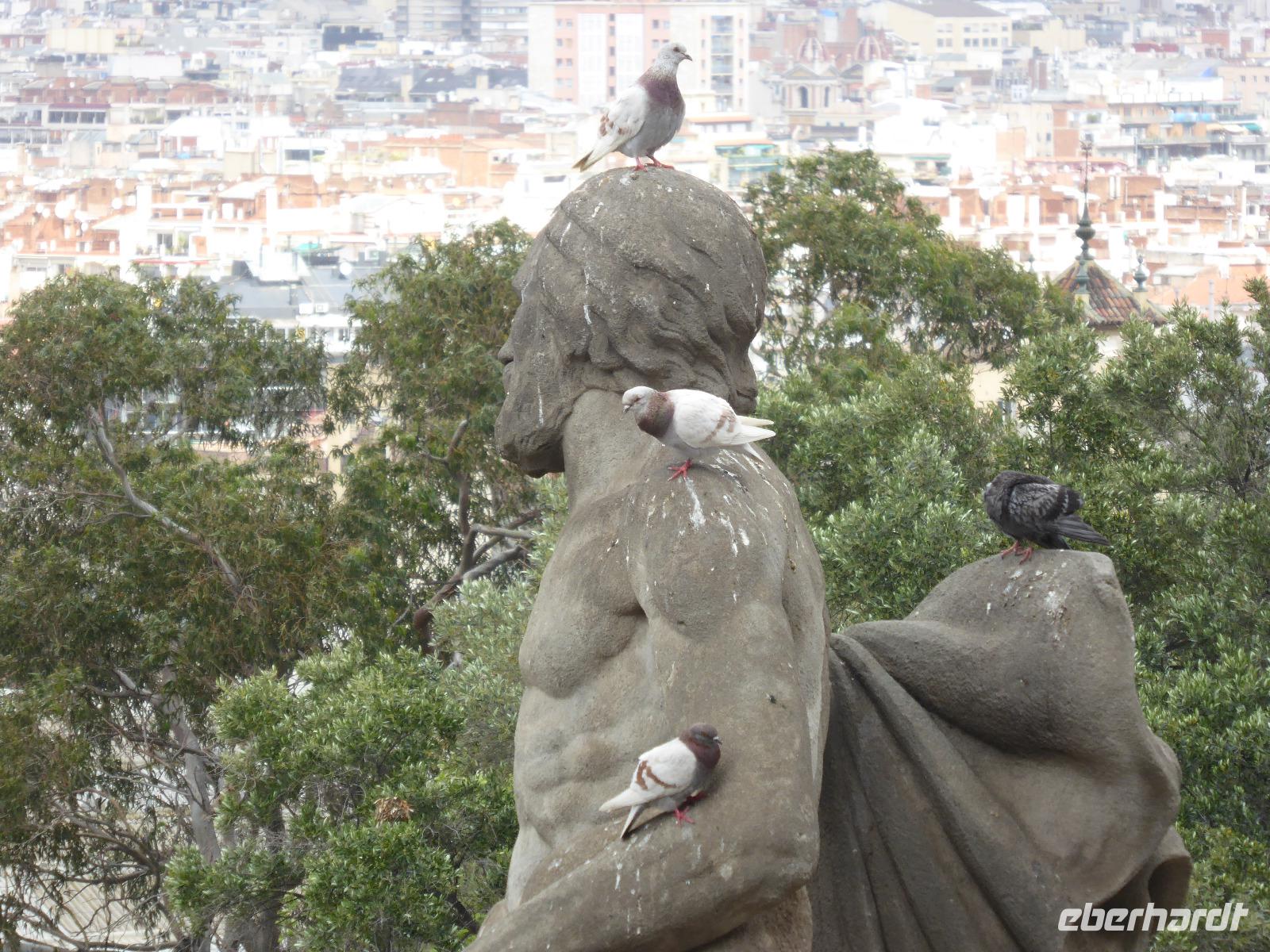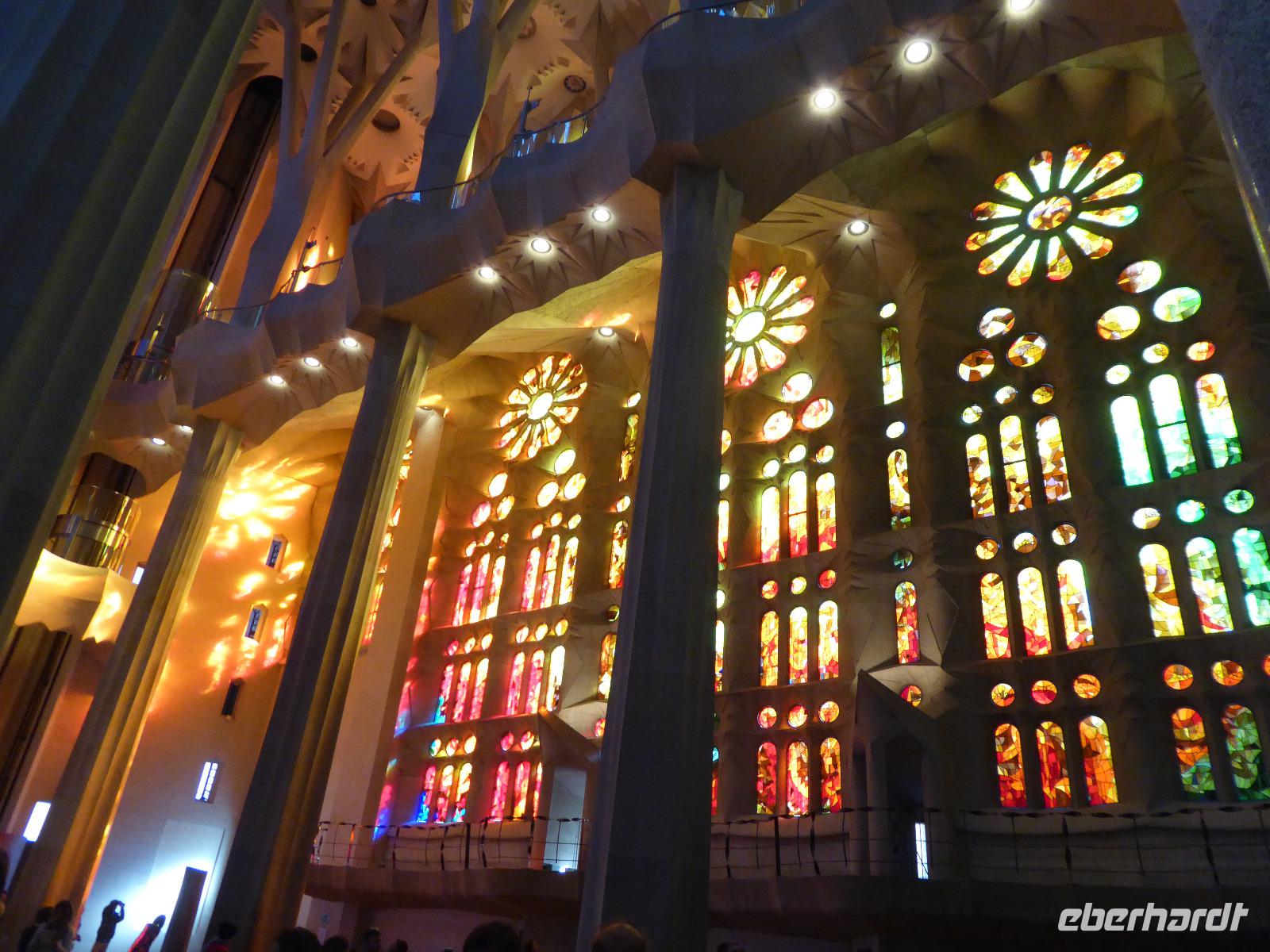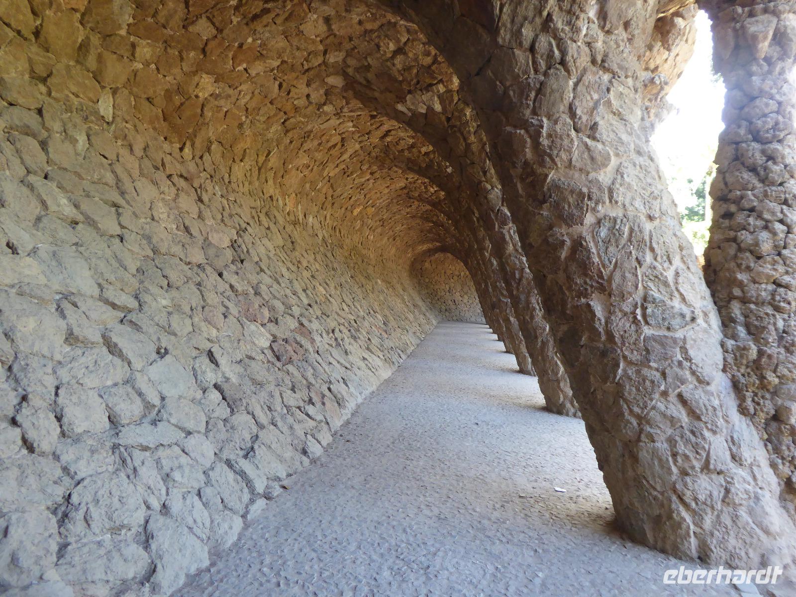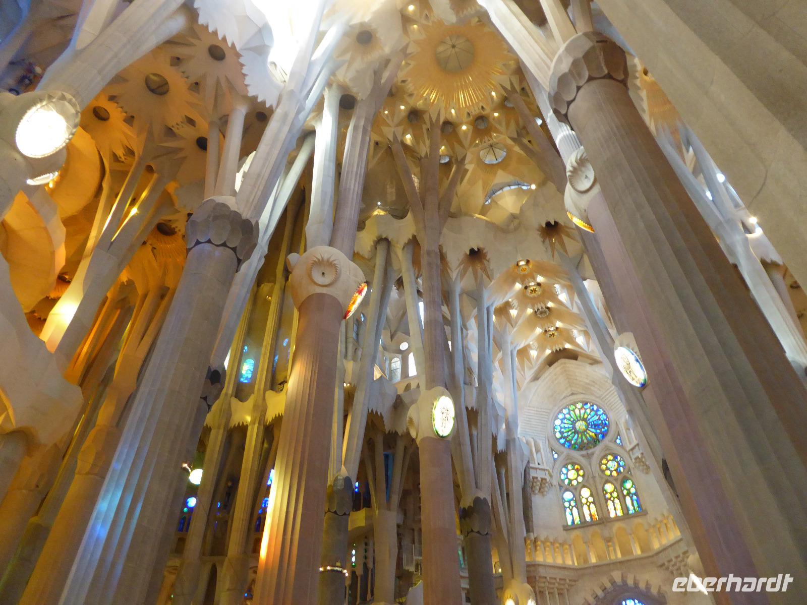 Nach einem ausgiebigen Frühstück treffen wir uns punkt Neun mit Lorenzo in der Lobby. Der Bus ist auch schon da und mit José , unserem Busfahrer, geht es heute kreuz und quer durch Barcelona. Zunächst fahren wir auf der längsten Straße der schachbrettangeordneten Stadt, der La Grande bis ins Zentrum. Auffällig sind die wunderschönen Fassaden der Häuser. Wir besuchen die Casa Mila. Die Wartezeit verkürzt uns unterhaltend eine Dame aus einer anderen Gruppe, die auf Krawall gebürstet ist und sich mit Carlos anlegt, weil sie meint, wir hätten uns vorgedrängelt. Da ist sie aber an den Richtigen geraten. Carlos lässt sich die Butter nicht vom Brot nehmen. Zu ihrer Beruhigung ist ihre Gruppe dann tatsächlich vor uns dran. Es dauert ein bisschen, aber bald schluckt auch uns dieses ungewöhnliche Haus. Wir bekommen Audioguides und fahren in kleinen Grüppchen mit dem Fahrstuhl auf die Terrasse. Was für eine grandiose Anlage. Die Bewohner hatten es hier wirklich gut. Nachdem wir die Aussicht nach allen Seiten genossen haben, geht es treppab durch das ganze Haus. Wir bewundern die Konstruktion des Dachbodens, schlendern an den Zimmern vorbei, deren Einrichtung so manche Erinnerung weckt. Obwohl wir so viel Zeit hatten, müssen wir uns jetzt doch sputen, denn wir haben bald den nächsten Termin. Um 11.30 Uhr werden wir im Musikpalast erwartet. Hier treffen wir auch auf die andere Eberhardt-Gruppe mit meinem lieben Kollegen Benjamin. Zunächst sehen wir einen Film über die Geschichte des Hauses, der zwar in Spanisch ist, aber durch die Bilder trotz Sprachunkenntnis, verstanden werden kann. Bei der Führung ist es dann etwas anders. Wir werden aufgefordert, einer spanisch sprechenden Führerin zu folgen, die unserem Lorenzo aber keine Chance lässt, für uns zu übersetzen. Wir beobachten die Auseinandersetzung der Beiden, aber diese Dame ist unerbittlich, sie hat für das Anliegen der deutschen Gäste kein Verständnis. Lorenzo tut was er kann und informiert uns trotzdem über das Geschehen im Musikpalast. Zu aller Überraschung bringt uns Benjamin ein Ständchen und erfreut damit nicht nur uns, sondern auch die Gäste der unnahbaren Reiseführerin. Anschließend genießen wir während der Mittagspause Tappas, Kaffee oder Bier je nach Bedarf. Eine ganze Stunde ist Zeit für Müßiggang. Nun fahren wir zum Park Güell. Wir haben so ein Glück, die Sonne scheint, der Himmel ist strahlend blau und die Fliesenscherben, die die Säulen schmücken, funkeln und glitzern. Wir spazieren durch die traumhafte Anlage und haben ausreichend Zeit, uns satt zu fotografieren. Auch unser Gruppenfoto entsteht hier.