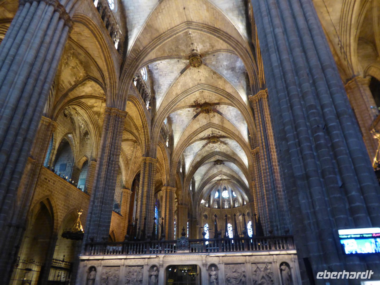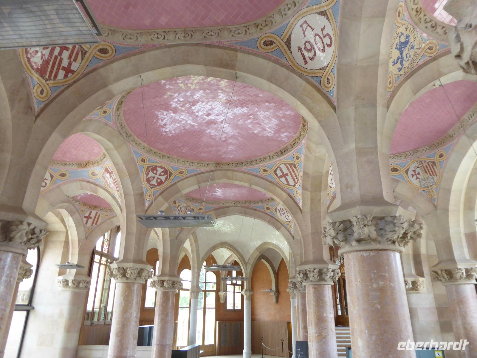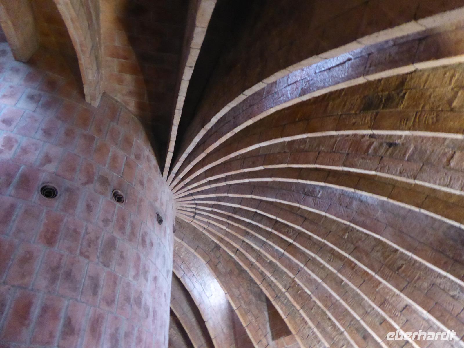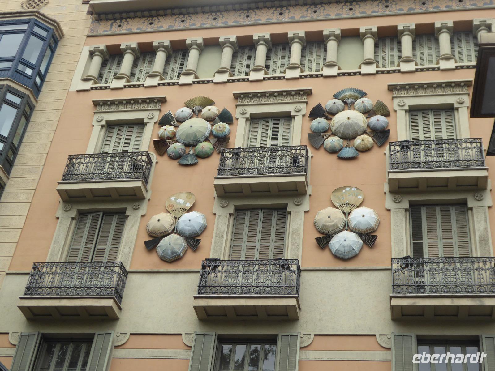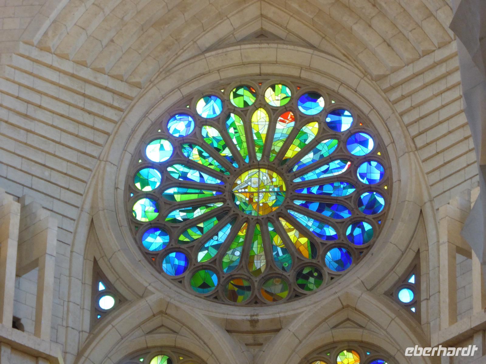 Nach einem ausgiebigen Frühstück treffen wir uns punkt Neun mit Lorenzo in der Lobby. Der Bus ist auch schon da und mit José , unserem Busfahrer, geht es heute kreuz und quer durch Barcelona. Zunächst fahren wir auf der längsten Straße der schachbrettangeordneten Stadt, der La Grande bis ins Zentrum. Auffällig sind die wunderschönen Fassaden der Häuser. Wir besuchen die Casa Mila. Die Wartezeit verkürzt uns unterhaltend eine Dame aus einer anderen Gruppe, die auf Krawall gebürstet ist und sich mit Carlos anlegt, weil sie meint, wir hätten uns vorgedrängelt. Da ist sie aber an den Richtigen geraten. Carlos lässt sich die Butter nicht vom Brot nehmen. Zu ihrer Beruhigung ist ihre Gruppe dann tatsächlich vor uns dran. Es dauert ein bisschen, aber bald schluckt auch uns dieses ungewöhnliche Haus. Wir bekommen Audioguides und fahren in kleinen Grüppchen mit dem Fahrstuhl auf die Terrasse. Was für eine grandiose Anlage. Die Bewohner hatten es hier wirklich gut. Nachdem wir die Aussicht nach allen Seiten genossen haben, geht es treppab durch das ganze Haus. Wir bewundern die Konstruktion des Dachbodens, schlendern an den Zimmern vorbei, deren Einrichtung so manche Erinnerung weckt. Obwohl wir so viel Zeit hatten, müssen wir uns jetzt doch sputen, denn wir haben bald den nächsten Termin. Um 11.30 Uhr werden wir im Musikpalast erwartet. Hier treffen wir auch auf die andere Eberhardt-Gruppe mit meinem lieben Kollegen Benjamin. Zunächst sehen wir einen Film über die Geschichte des Hauses, der zwar in Spanisch ist, aber durch die Bilder trotz Sprachunkenntnis, verstanden werden kann. Bei der Führung ist es dann etwas anders. Wir werden aufgefordert, einer spanisch sprechenden Führerin zu folgen, die unserem Lorenzo aber keine Chance lässt, für uns zu übersetzen. Wir beobachten die Auseinandersetzung der Beiden, aber diese Dame ist unerbittlich, sie hat für das Anliegen der deutschen Gäste kein Verständnis. Lorenzo tut was er kann und informiert uns trotzdem über das Geschehen im Musikpalast. Zu aller Überraschung bringt uns Benjamin ein Ständchen und erfreut damit nicht nur uns, sondern auch die Gäste der unnahbaren Reiseführerin. Anschließend genießen wir während der Mittagspause Tappas, Kaffee oder Bier je nach Bedarf. Eine ganze Stunde ist Zeit für Müßiggang. Nun fahren wir zum Park Güell. Wir haben so ein Glück, die Sonne scheint, der Himmel ist strahlend blau und die Fliesenscherben, die die Säulen schmücken, funkeln und glitzern. Wir spazieren durch die traumhafte Anlage und haben ausreichend Zeit, uns satt zu fotografieren. Auch unser Gruppenfoto entsteht hier.