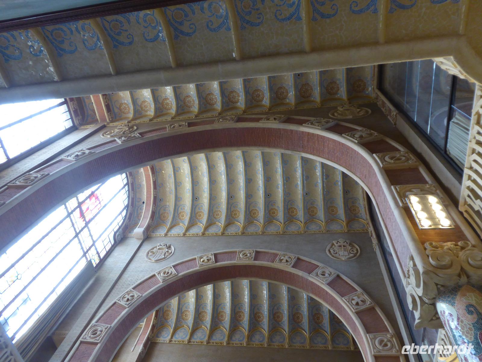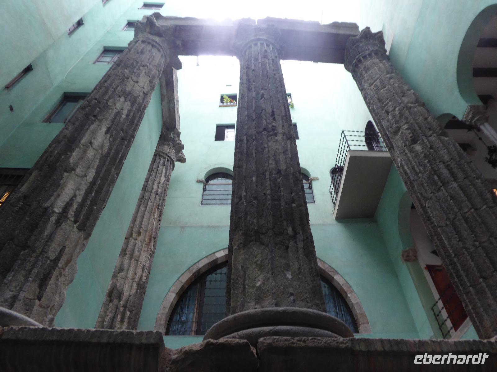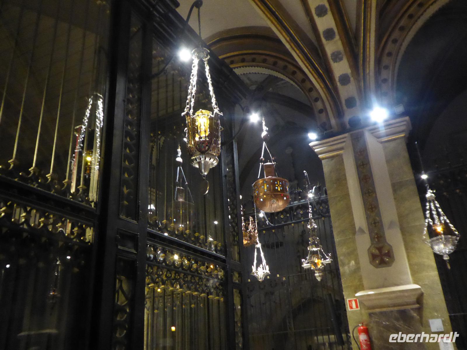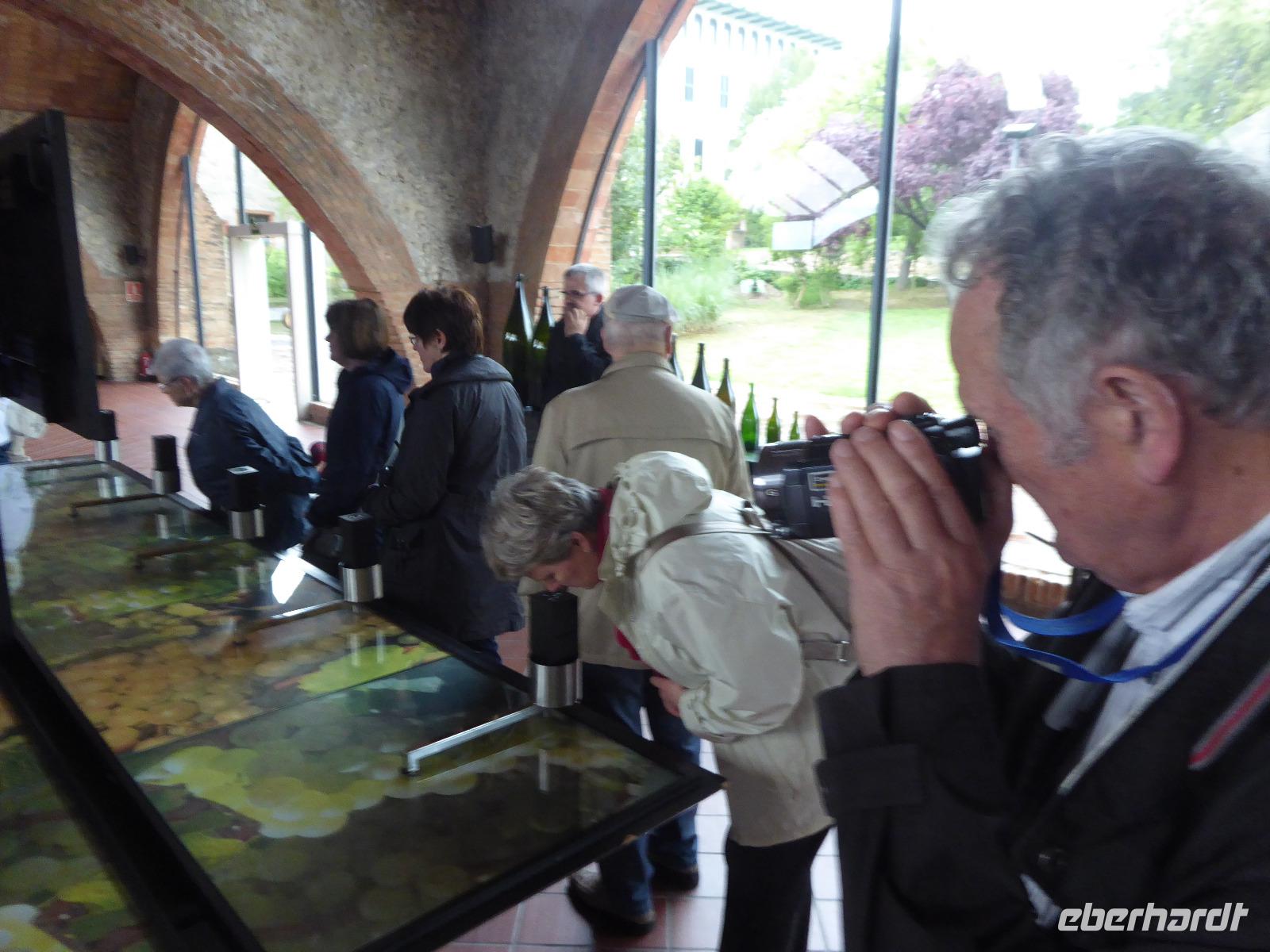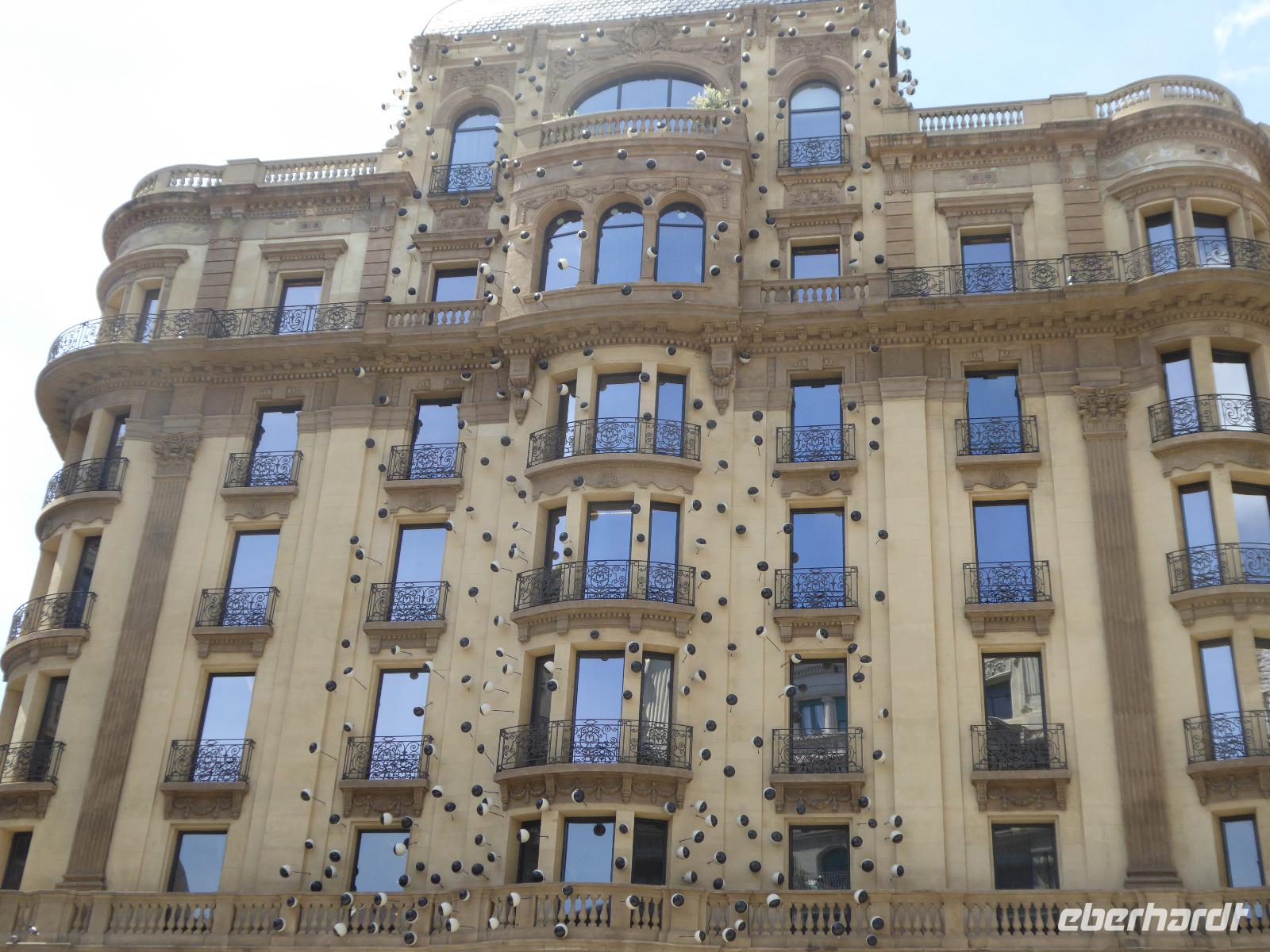 Nach einem ausgiebigen Frühstück treffen wir uns punkt Neun mit Lorenzo in der Lobby. Der Bus ist auch schon da und mit José , unserem Busfahrer, geht es heute kreuz und quer durch Barcelona. Zunächst fahren wir auf der längsten Straße der schachbrettangeordneten Stadt, der La Grande bis ins Zentrum. Auffällig sind die wunderschönen Fassaden der Häuser. Wir besuchen die Casa Mila. Die Wartezeit verkürzt uns unterhaltend eine Dame aus einer anderen Gruppe, die auf Krawall gebürstet ist und sich mit Carlos anlegt, weil sie meint, wir hätten uns vorgedrängelt. Da ist sie aber an den Richtigen geraten. Carlos lässt sich die Butter nicht vom Brot nehmen. Zu ihrer Beruhigung ist ihre Gruppe dann tatsächlich vor uns dran. Es dauert ein bisschen, aber bald schluckt auch uns dieses ungewöhnliche Haus. Wir bekommen Audioguides und fahren in kleinen Grüppchen mit dem Fahrstuhl auf die Terrasse. Was für eine grandiose Anlage. Die Bewohner hatten es hier wirklich gut. Nachdem wir die Aussicht nach allen Seiten genossen haben, geht es treppab durch das ganze Haus. Wir bewundern die Konstruktion des Dachbodens, schlendern an den Zimmern vorbei, deren Einrichtung so manche Erinnerung weckt. Obwohl wir so viel Zeit hatten, müssen wir uns jetzt doch sputen, denn wir haben bald den nächsten Termin. Um 11.30 Uhr werden wir im Musikpalast erwartet. Hier treffen wir auch auf die andere Eberhardt-Gruppe mit meinem lieben Kollegen Benjamin. Zunächst sehen wir einen Film über die Geschichte des Hauses, der zwar in Spanisch ist, aber durch die Bilder trotz Sprachunkenntnis, verstanden werden kann. Bei der Führung ist es dann etwas anders. Wir werden aufgefordert, einer spanisch sprechenden Führerin zu folgen, die unserem Lorenzo aber keine Chance lässt, für uns zu übersetzen. Wir beobachten die Auseinandersetzung der Beiden, aber diese Dame ist unerbittlich, sie hat für das Anliegen der deutschen Gäste kein Verständnis. Lorenzo tut was er kann und informiert uns trotzdem über das Geschehen im Musikpalast. Zu aller Überraschung bringt uns Benjamin ein Ständchen und erfreut damit nicht nur uns, sondern auch die Gäste der unnahbaren Reiseführerin. Anschließend genießen wir während der Mittagspause Tappas, Kaffee oder Bier je nach Bedarf. Eine ganze Stunde ist Zeit für Müßiggang. Nun fahren wir zum Park Güell. Wir haben so ein Glück, die Sonne scheint, der Himmel ist strahlend blau und die Fliesenscherben, die die Säulen schmücken, funkeln und glitzern. Wir spazieren durch die traumhafte Anlage und haben ausreichend Zeit, uns satt zu fotografieren. Auch unser Gruppenfoto entsteht hier.