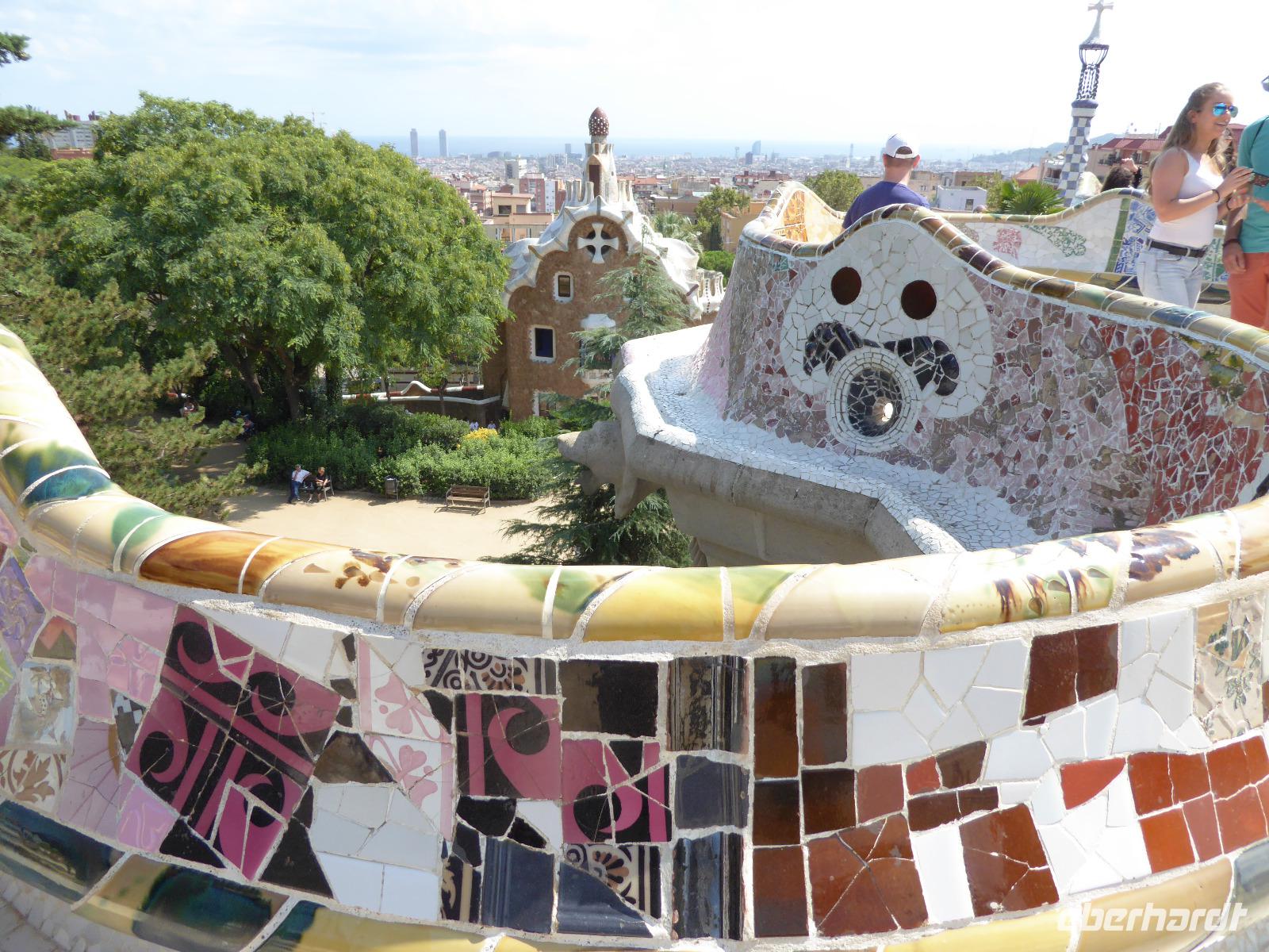 sollte es noch reichlich Gelegenheit geben). Vom Montjuic aus gesehen, dem Aussichtspunkt Mirador del Alcalde, breitet sich die Stadt in einem großen Tal aus, eingerahmt von den Bergen um den Tipitabo und in der Ferne dem Park Güell sowie weiteren bewaldeten Hängen. Cosimo zeigte uns einige herausragende Gebäude sowie die ausgedehnten Hafenanlagen der Stadt.