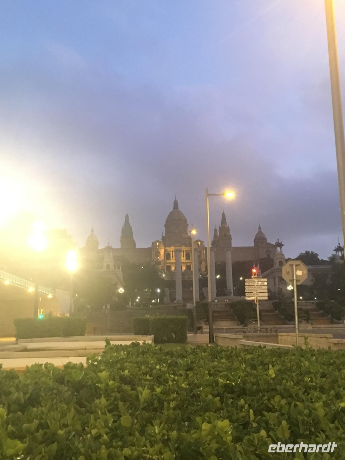 Ein Großteil unserer Reisegruppe trifft sich bereits am Morgen am Dresdner Flughafen, um gemeinsam in Richtung Barcelona zu starten. Doch bevor uns die Hauptstadt Kataloniens Willkommen heißen darf, legen wir einen kurzen Zwischenhalt in Frankfurt ein. Der Flieger bringt uns binnen einer Stunde nach Frankfurt, schon rasch beginnt die Landung und wir sehen die beeindruckende Skyline von Frankfurt. Dort angekommen, treffen wir auf zwei weitere aus Leipzig kommende Gäste. Gemeinsam fliegen wir sodann nach Barcelona und erreichen nach einem angenehmen Flug mit toller Aussicht den Flughafen Barcelona El Prat im Süden der Stadt. Wir werden zum Plaza Catalunya, dem Hauptplatz der Metropole gebracht, und erreichen sodann unser Hotel HCC Montblanc. Unsere Berliner und Hamburger Gäste sind bereits heute Vormittag angereist. So hatten sie bereits die Gelegenheit, erste Erkundungen im Stadtzentrum anzustellen. Am Abend trifft sich unsere nun vollständige Eberhardt-Gruppe und startet gemeinsam zu einer ersten Stadtrundfahrt. Hierbei begleitet uns unsere örtliche Reiseleiterin Vanessa. Wir lassen die Fahrt am Plaza Catalunya beginnen, wo die Altstadt mit dem neuen Teil der Stadt durch den imposanten Platz miteinander verbunden wird. Wir fahren weiter in Richtung Plaza Espanya, wo nicht nur die alte Stierkampfarena steht, sondern auch der prächtige Nationalpalast in Sichtweite ist. Wir steuern den Montjüic, den höchsten Berg Barcelonas mit 173m an. Auf dem Aussichtsplatz Mirador de Alcalde legen wir einen Stopp ein und bestaunen die faszinierende Aussicht über die Stadt und den Hafen. Leider ist es etwas diesig, aber die Prachtbauten der Stadt - wie die Sagrada Familia - lassen sich dennoch erkennen. Auf dem Weg nach unten passieren wir das Stadion, das einst für die Weltausstellung im Jahre 1929 erbaut wurde und für die olympischen Sommerspiele 1992 vergrößert wurde. Ebenfalls passieren wir das Pueblo Español, das spanische Dorf. Auch einst für die olympischen Spiele errichtet, werden dort noch heute die 17 autonomen Gemeinschaften Spaniens repräsentiert und verleihen Besuchern einen Eindruck von der Vielfalt Spaniens.
