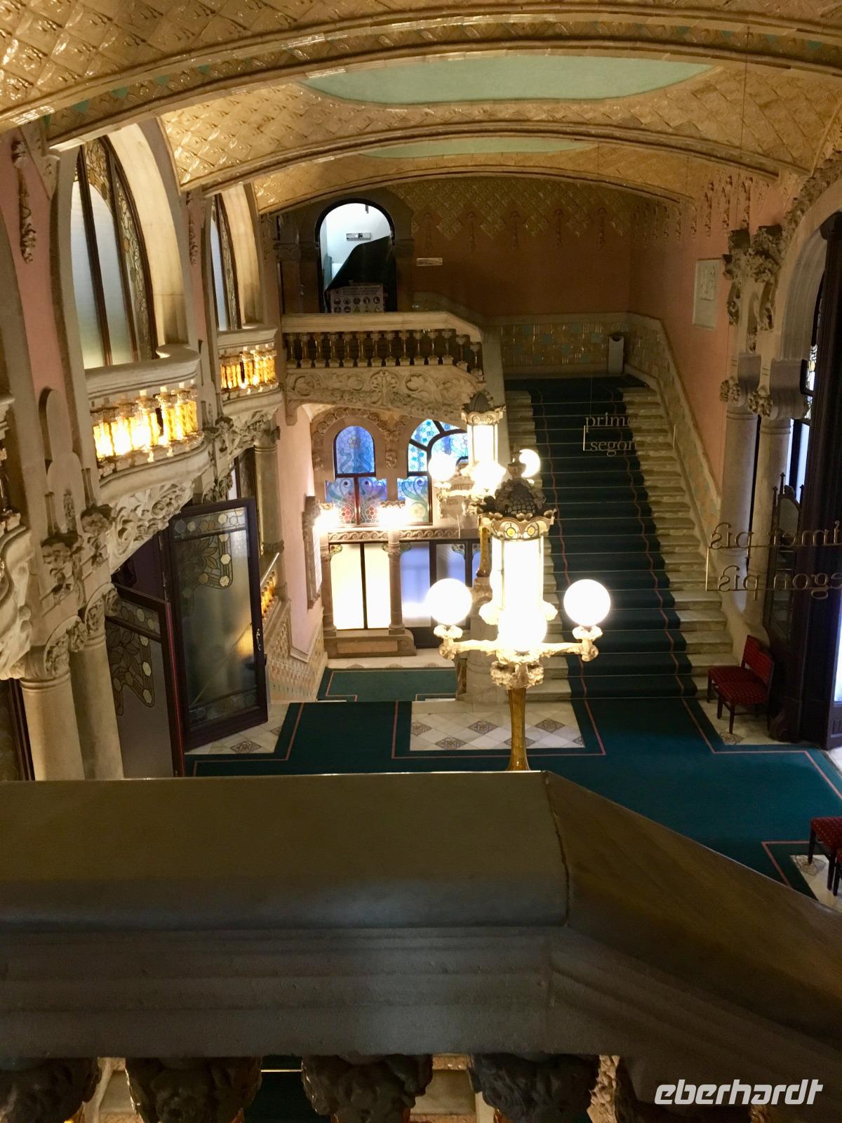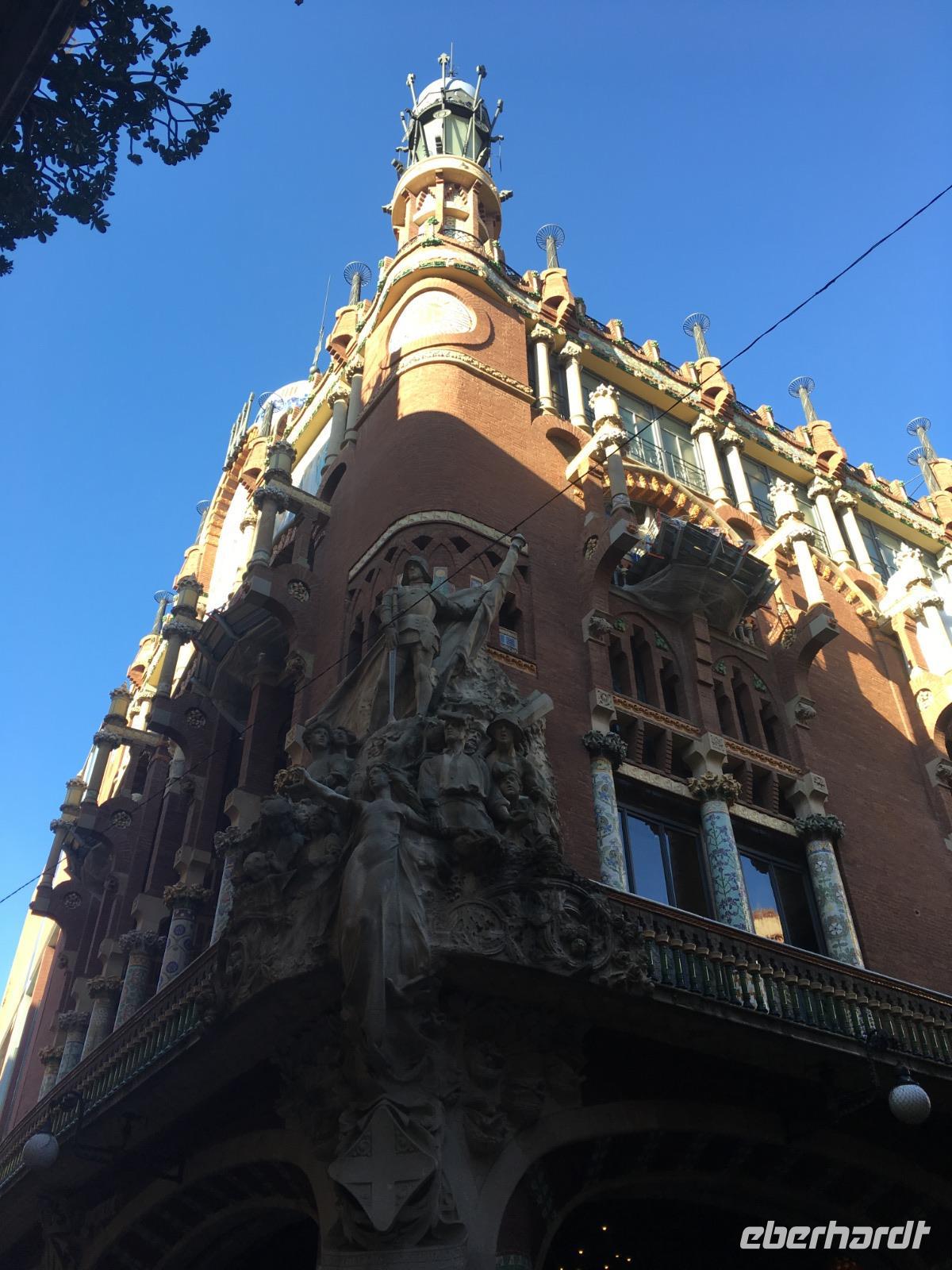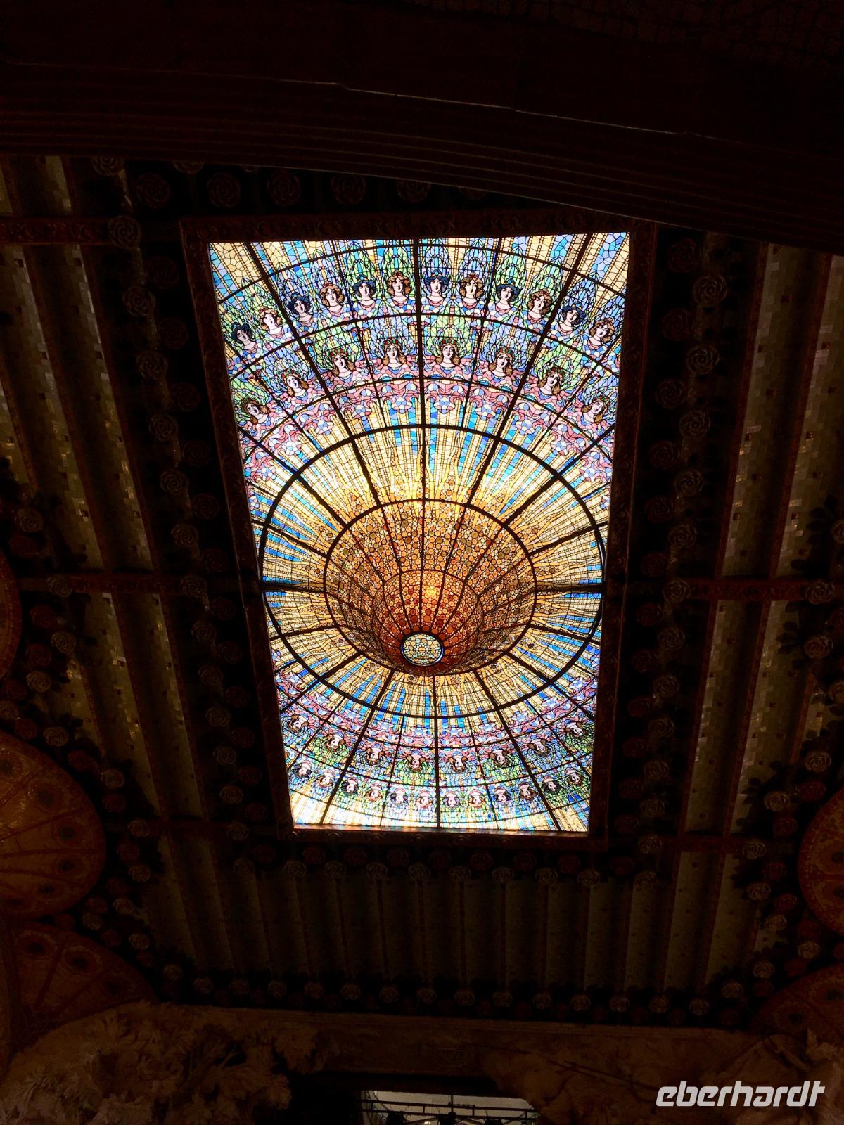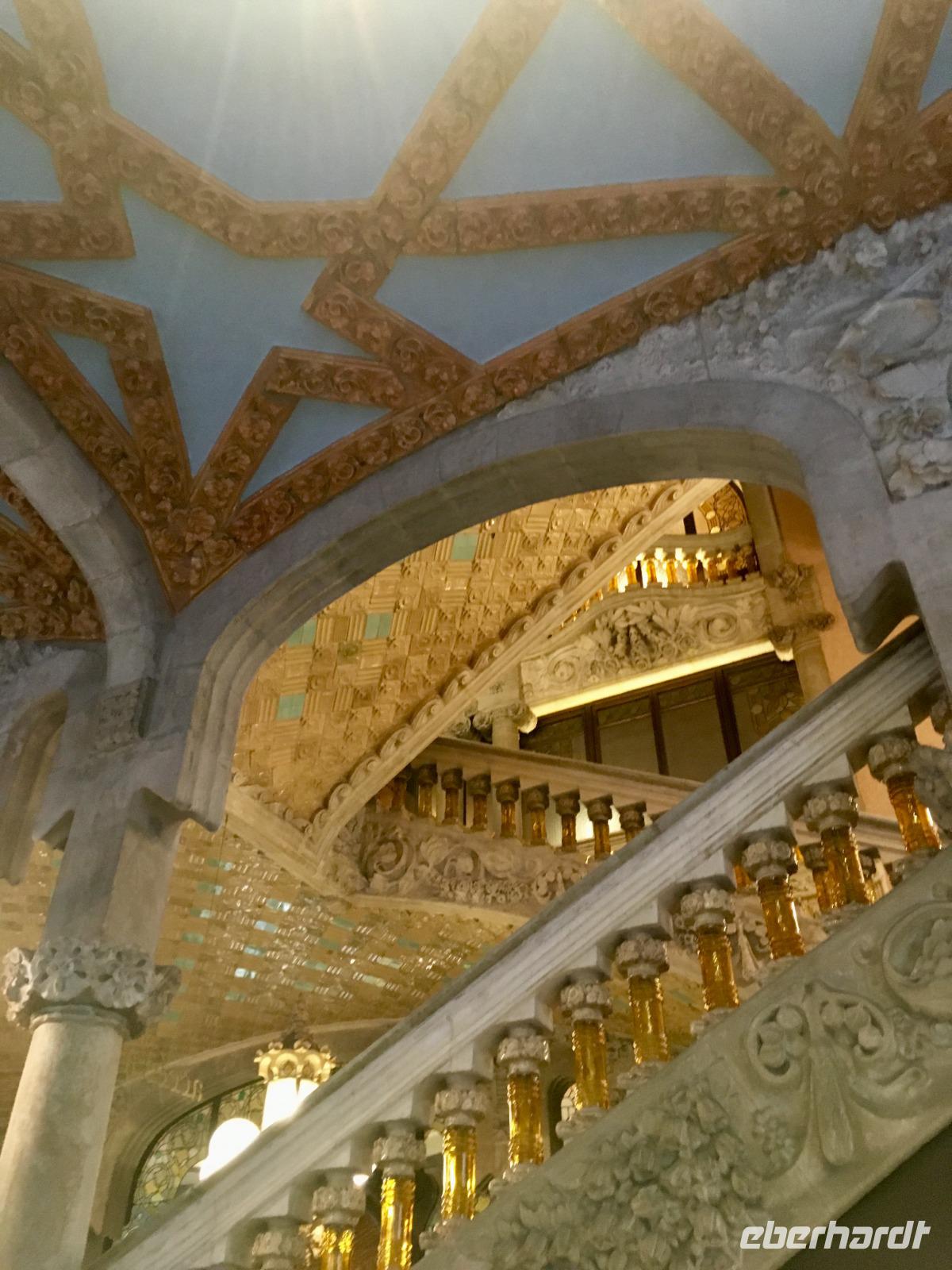 Der Blick aus dem Fenster verrät, dass heute ein sonniger Tag in Barcelona werden wird. Nach einem gemütlichen Frühstück erwartet uns auch schon unsere Reiseleiterin Vanessa, die mit uns Barcelona heute zu Fuß erkunden möchte. Zunächst spazieren wir in Richtung des Plaza Catalunyas, von wo aus wir in die Altstadt einbiegen. In einer kleinen Querstraße ist das berühmte Künstlercafé Cuatre gats (vier Katzen) gelegen, wo nicht zuletzt Picasso einst einzukehren pflegte. Im Anschluss gelangen wir zu den Überresten der alten römischen Stadtmauer, die an der Kathedrale vorzufinden sind. So ermöglicht uns Vanessa eine Vorstellung davon, wie es wohl zu römischen Zeiten im Kern Barcelonas ausgesehen haben mag. Wir legen einen Zeitsprung von etwa 2000 Jahren hin und erreichen den Palau de la Musica. Der Konzertsaal ist ein weiteres Prachtstück des katalanischen Modernisme und wurde von dem Architekten Montaner i Domenech im Jahre 1908 entworfen. Bei der Besichtigung des Inneren schauen wir uns zunächst den den Konzertsaal an, wo wir sogar eine kleine Hörprobe erhalten. Außerdem betreten wir den Balkon, der mit Säulen aus buntem Mosaik ein Hingucker ist.