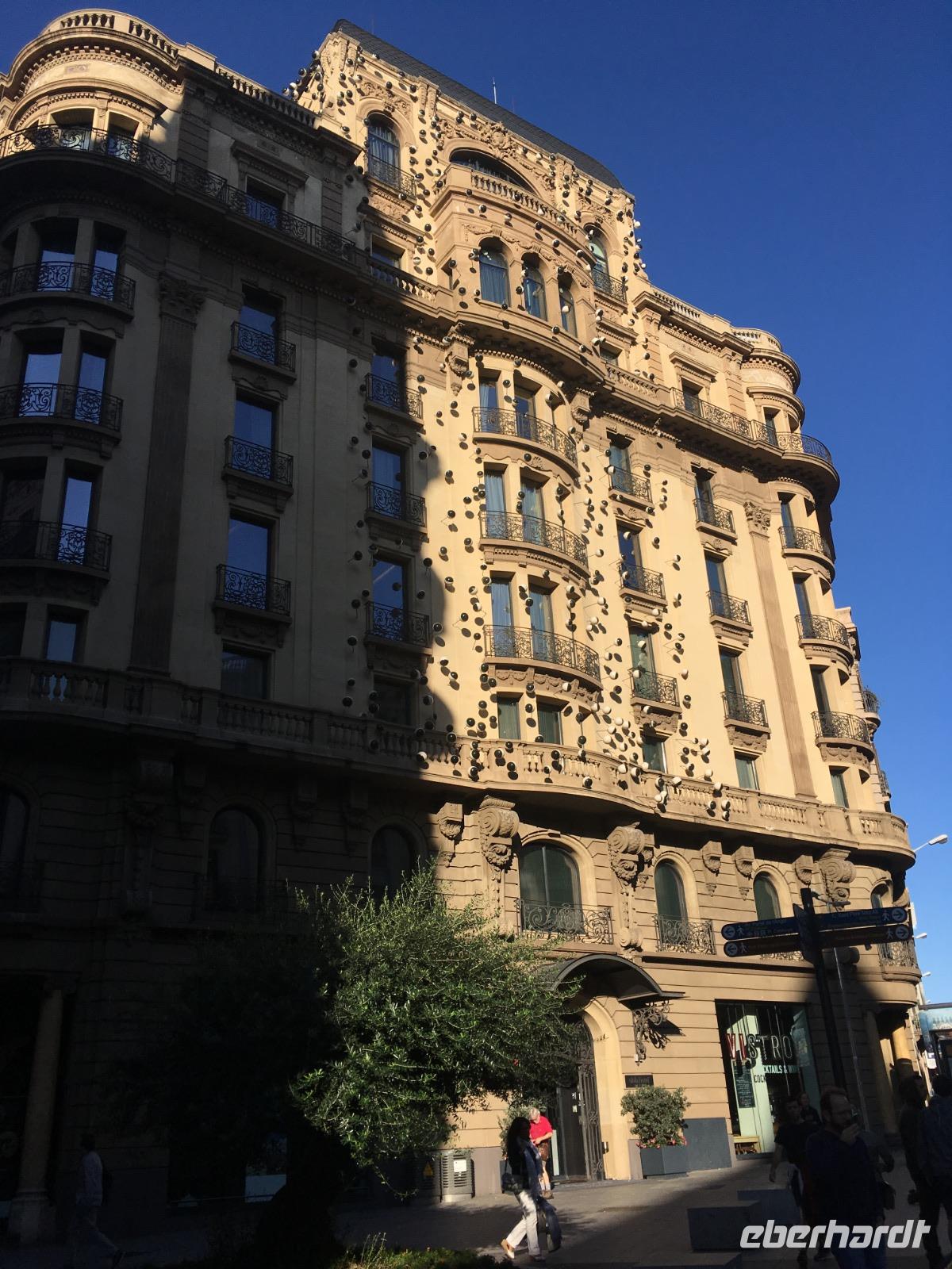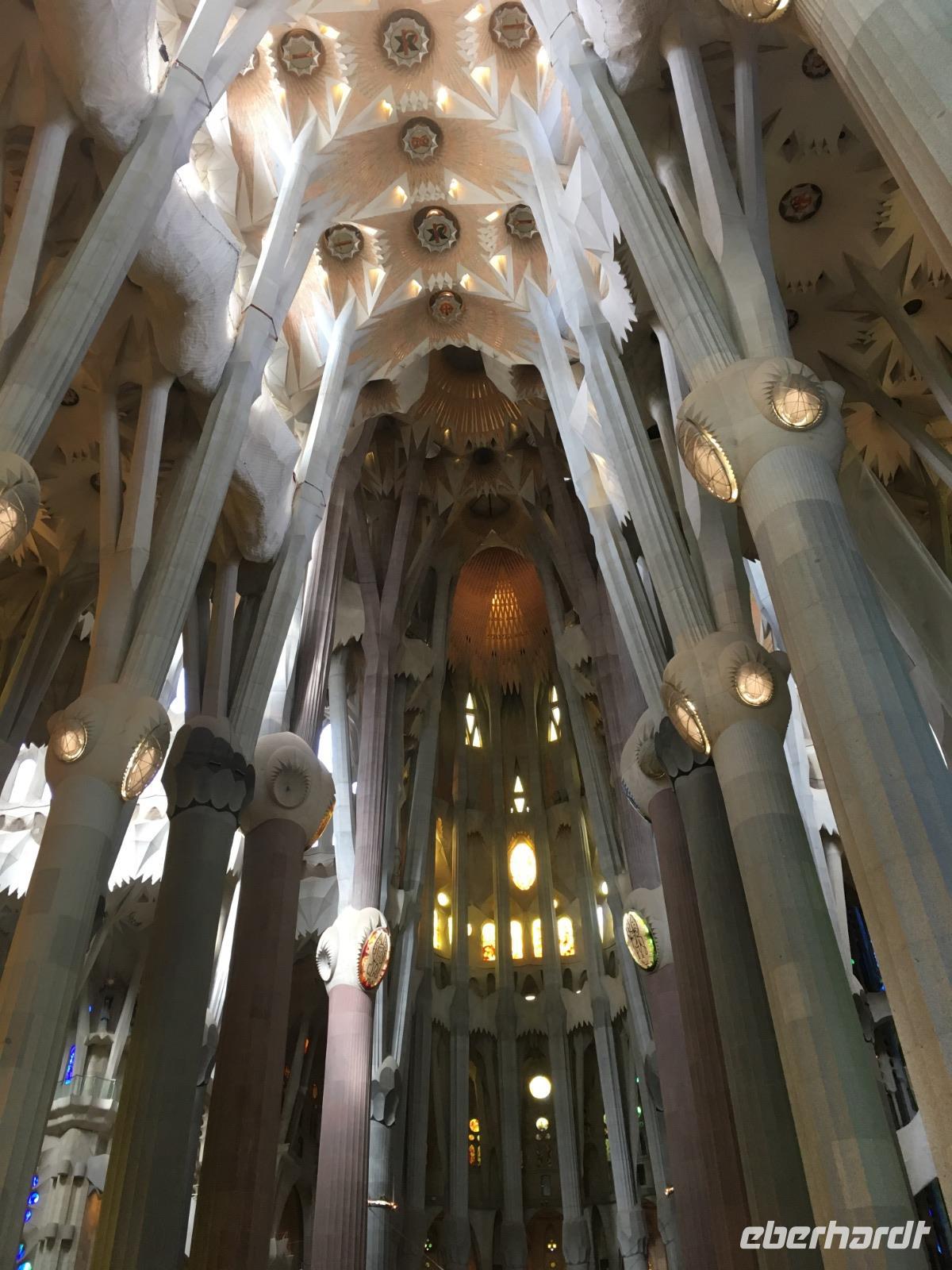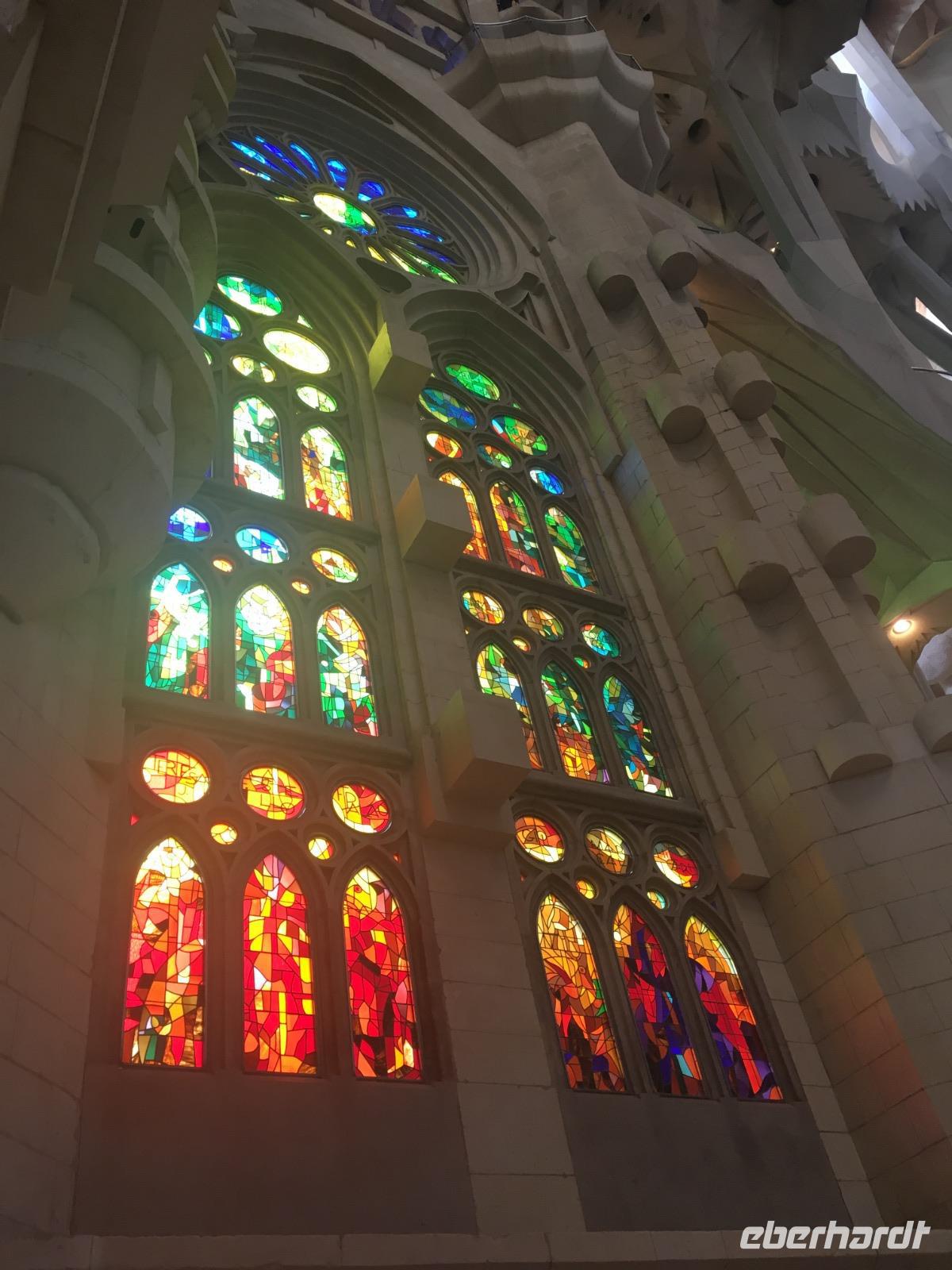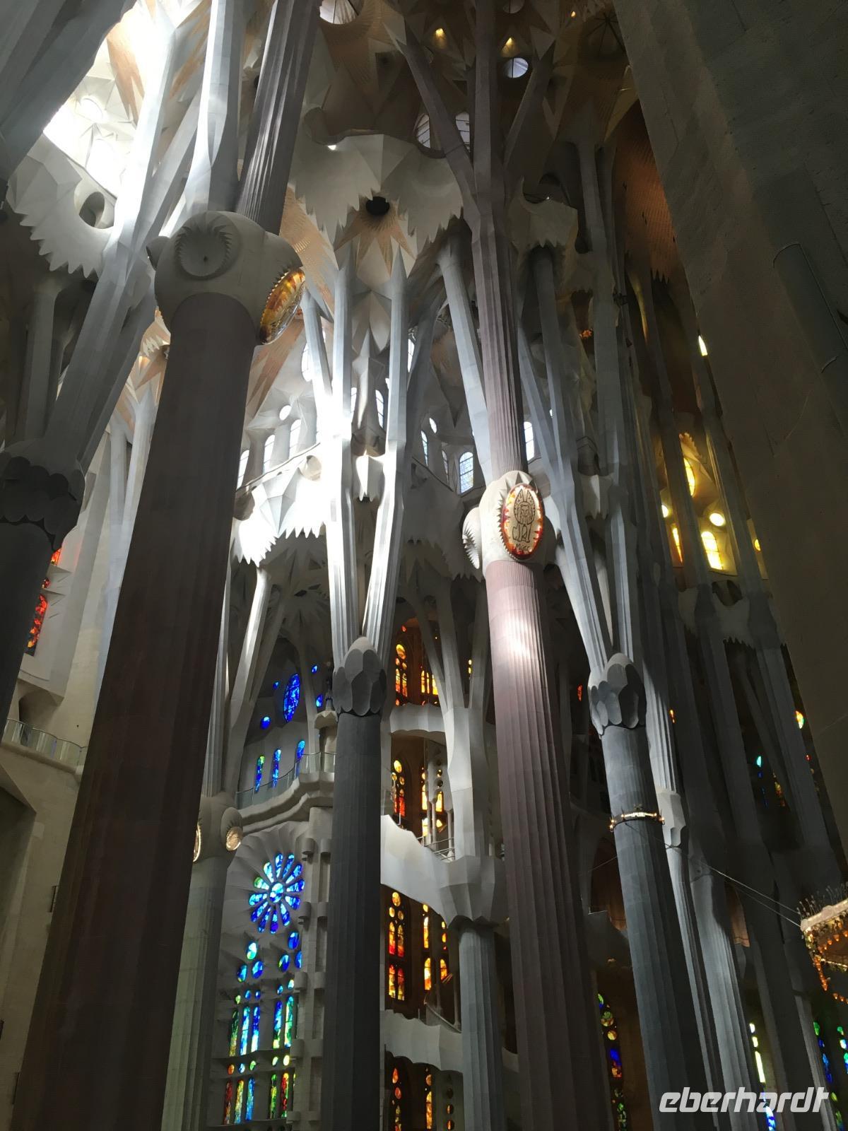 Der Blick aus dem Fenster verrät, dass heute ein sonniger Tag in Barcelona werden wird. Nach einem gemütlichen Frühstück erwartet uns auch schon unsere Reiseleiterin Vanessa, die mit uns Barcelona heute zu Fuß erkunden möchte. Zunächst spazieren wir in Richtung des Plaza Catalunyas, von wo aus wir in die Altstadt einbiegen. In einer kleinen Querstraße ist das berühmte Künstlercafé Cuatre gats (vier Katzen) gelegen, wo nicht zuletzt Picasso einst einzukehren pflegte. Im Anschluss gelangen wir zu den Überresten der alten römischen Stadtmauer, die an der Kathedrale vorzufinden sind. So ermöglicht uns Vanessa eine Vorstellung davon, wie es wohl zu römischen Zeiten im Kern Barcelonas ausgesehen haben mag. Wir legen einen Zeitsprung von etwa 2000 Jahren hin und erreichen den Palau de la Musica. Der Konzertsaal ist ein weiteres Prachtstück des katalanischen Modernisme und wurde von dem Architekten Montaner i Domenech im Jahre 1908 entworfen. Bei der Besichtigung des Inneren schauen wir uns zunächst den den Konzertsaal an, wo wir sogar eine kleine Hörprobe erhalten. Außerdem betreten wir den Balkon, der mit Säulen aus buntem Mosaik ein Hingucker ist.
