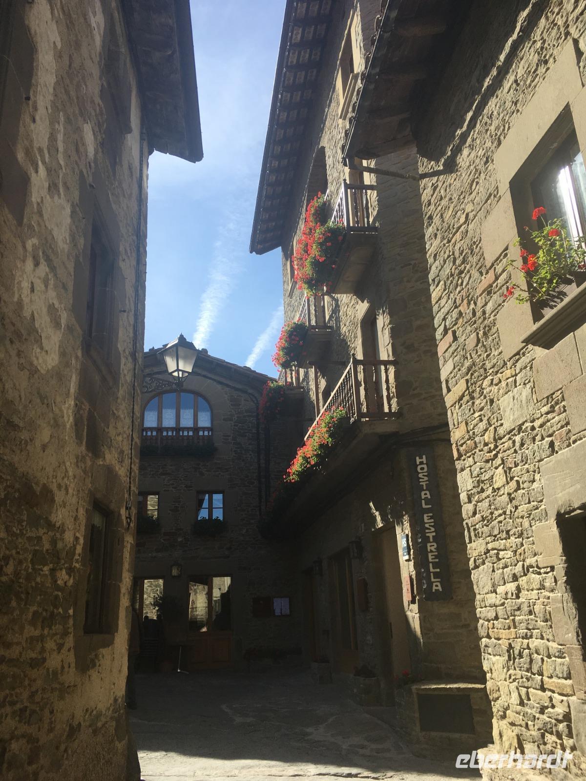 Nach dem Frühstück begeben wir uns in das Benediktinerkloster und erhaschen einen Blick auf die schwarze Madonna (La Moreneta). Wir haben Glück - tagsüber zieht es hunderte Touristen nach Montserrat, doch am frühen Morgen kann unsere Eberhardt-Gruppe den besinnlichen Ort in aller Ruhe für sich genießen. Bevor sich Montserrat füllt, sind wir bereits auf dem Weg nach Rupit. Das Bergdorf in den spanischen Pyrenäen zählt nicht einmal 300 Einwohner und begeistert uns durch seinen mittelalterlichen Charme. Wir passieren mit der Hängebrücke Puente Colgante de Rupit den Fluss Riera de Rupit und starten einen Spaziergang durch das beschauliche Dorf. Bunte Blumen zieren die Steinhäuser und die kleinen Läden mit lokalen Köstlichkeiten laden uns zum Stöbern ein.