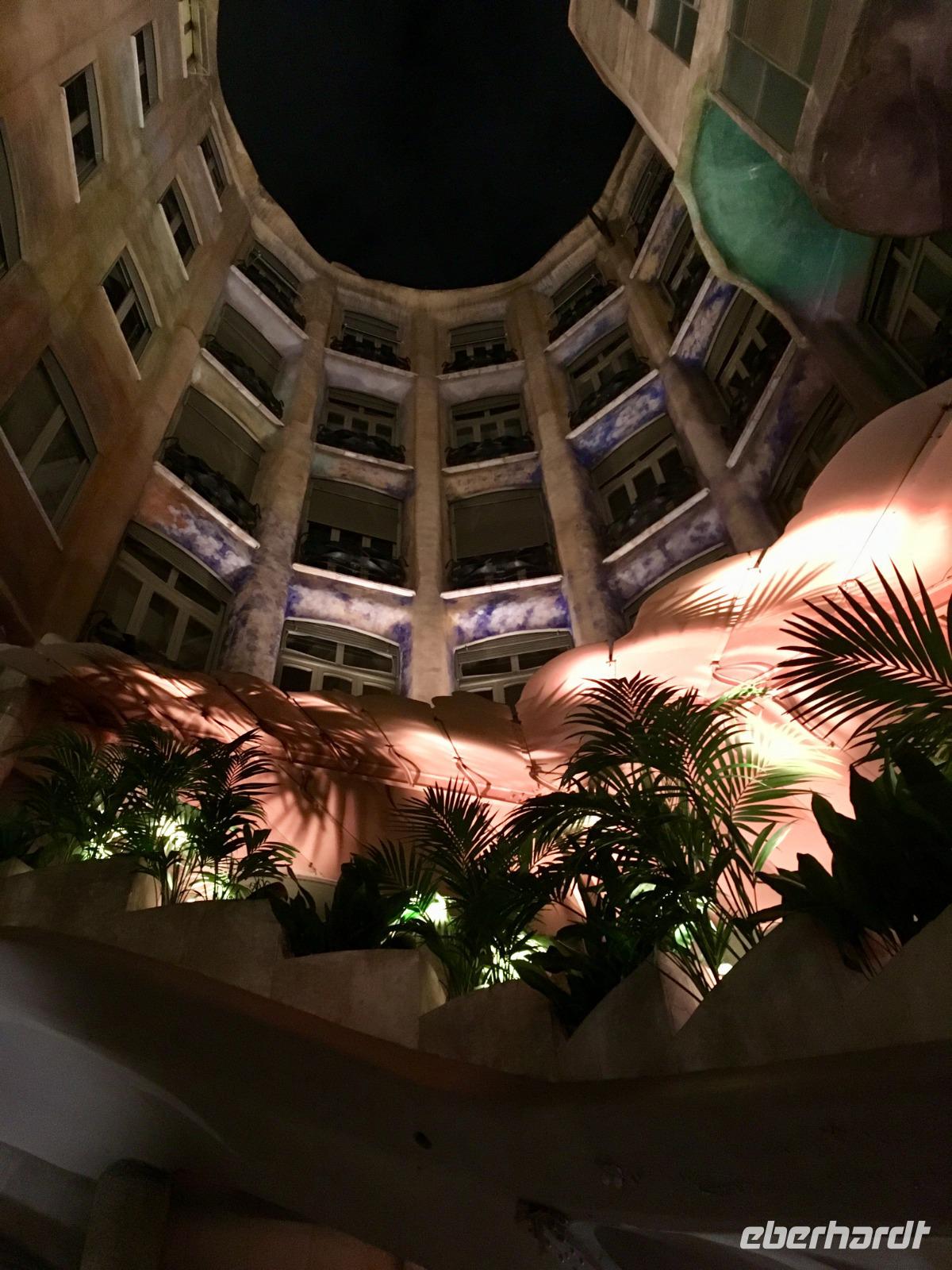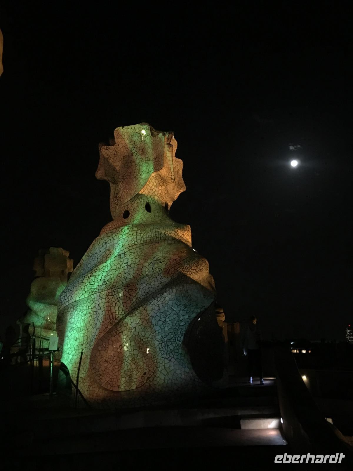 Als der Regen langsam aufhört, treffen wir uns am Abend und fahren mit der Metro zu unserem Restaurant Cinco Jotas. Hier bekommen wir ein köstlichen Menü serviert, das mit einer Schinkenplatte (spanischem Jamón) beginnt. Weiterhin wird uns gegrilltes Gemüse und zartes Schweinefleisch serviert, dem die typische Nachspeise Crema catalana folgt. In wenigen Minuten erreichen wir anschließend das Casa Mila, das wir bereits vormittags aus dem Bus heraus erspähen konnte. Doch am Abend kommen wir in den Genuss, an einer Führung durch das architektonische Meisterwerk teilzunehmen. Den Höhepunkt des Abends stellt die anschließende audiovisuelle Lichtershow auf der Dachterrasse dar, bei der eine freie Interpretation Gaudís Verständnis von Natur und Architektur folgt und wir einen großartigen Blick über die Straßen Barcelonas erhalten.