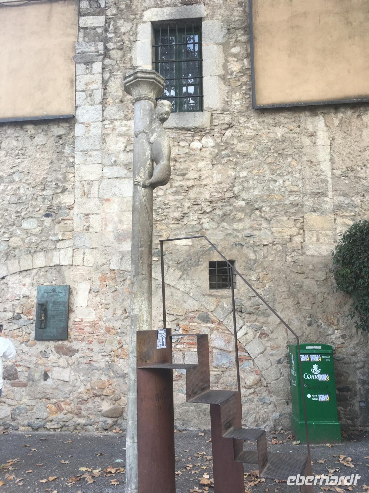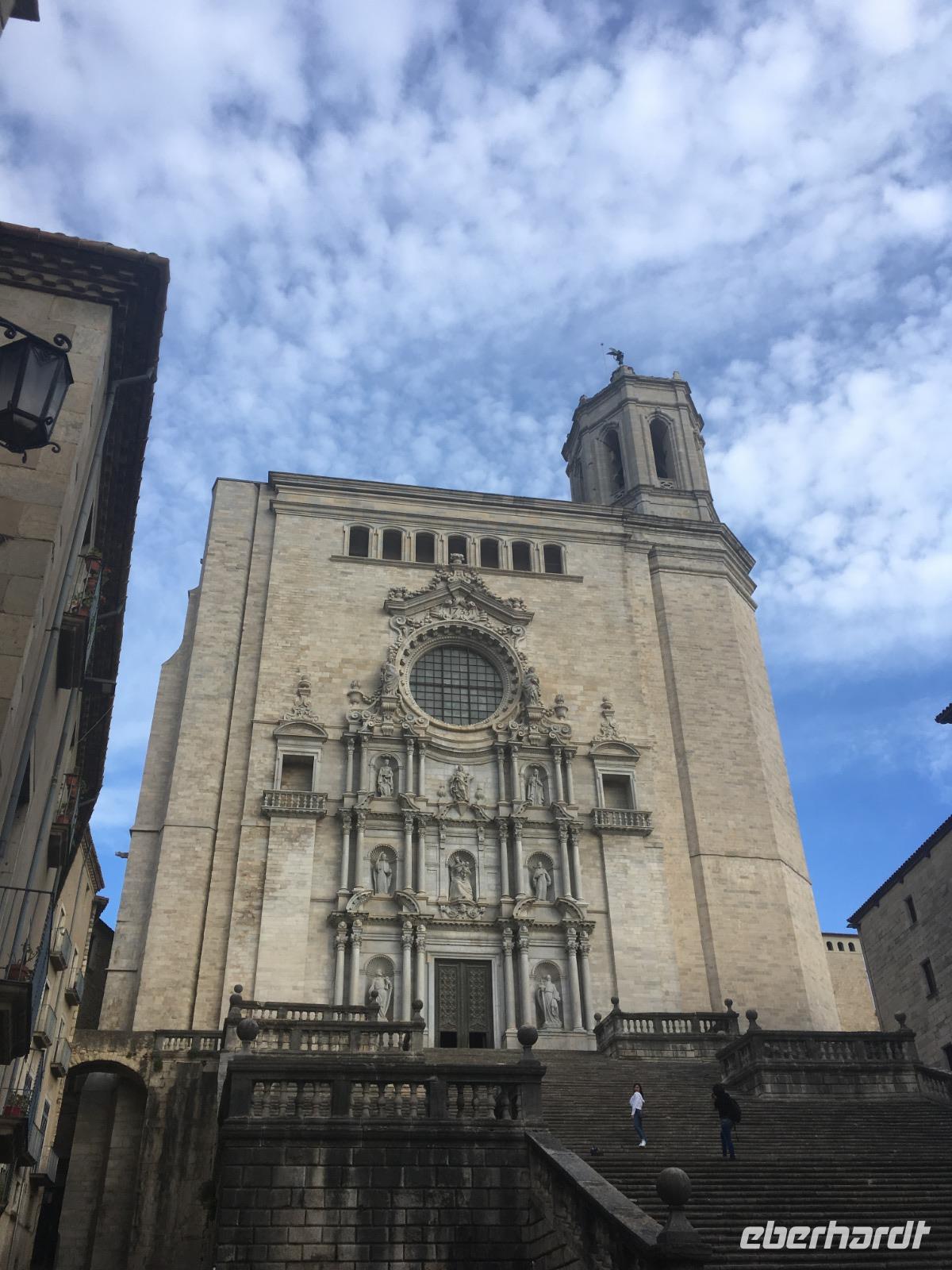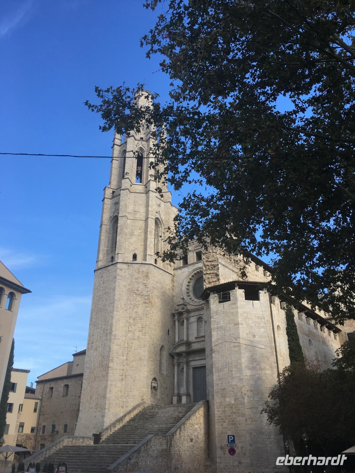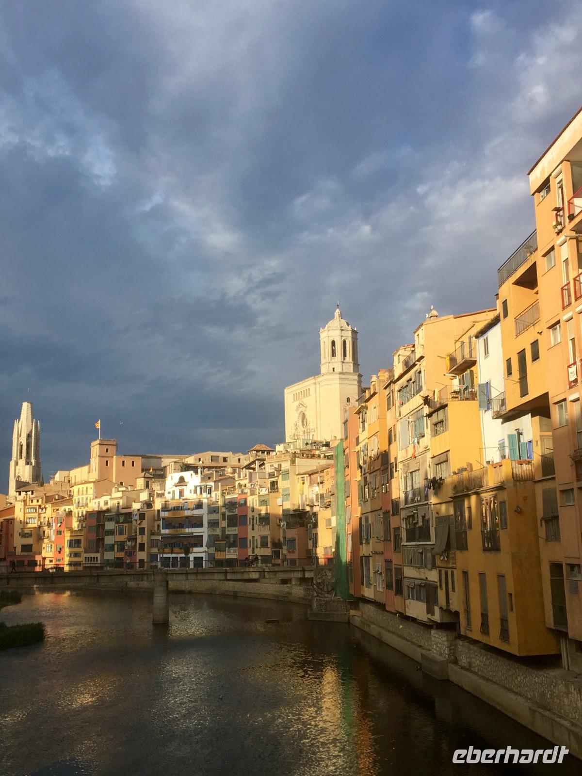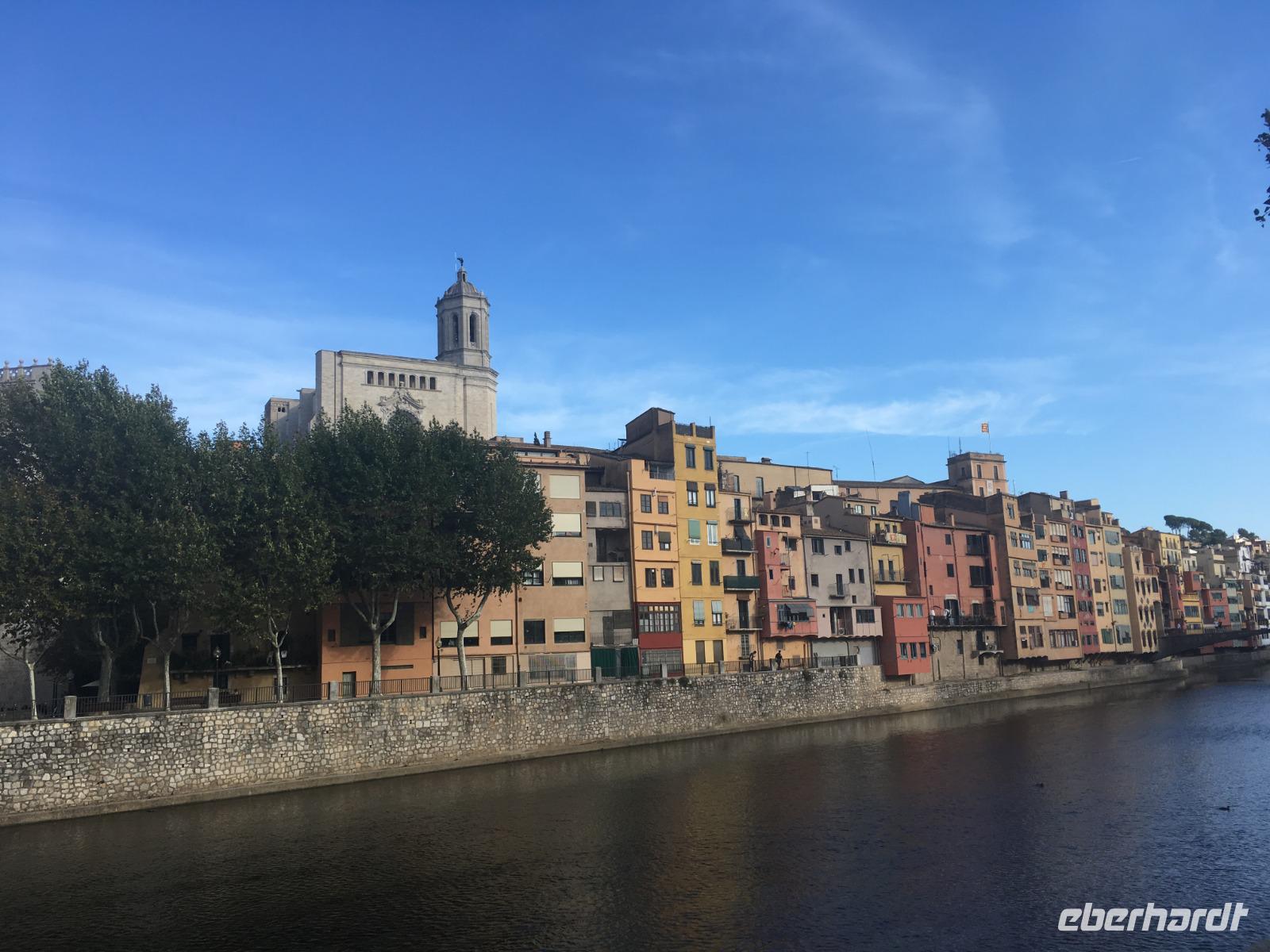 Wir passieren die Region Garrotxa, die ein Landschaftnaturschutzgebiet darstellt und vulkanisch geprägt ist. Über 40 Vulkane sind in dieser Gegend angesiedelt, die allerdings inaktiv sind und deren letzter Ausbruch über 10.000 Jahre zurückliegt. Sodann erreichen wir die mittelalterliche Kleinstadt Besalú. Wir beginnen unseren Spaziergang durch das beschauliche Städtchen an der romanischen Steinbrücke Pont Vella, unter der der Fluß Fluvia entlangfließt. Nachdem wir die kleinen Gassen passiert haben, gelangen wir rasch zum Plaza de la Libertad, wo sich die Mehrheit von uns in einem der zahlreichen Cafés niederlässt. Am Nachmittag geht es für uns nach Girona und wir gelangen in den Nord-Osten Kataloniens. Dort treffen wir auf den Stadtführer Joaquín, der uns Girona näherbringt. Nach einem Spaziergang durch den Platanenpark gelangen wir zu der Kathedrale von Girona. Vorbei an den Banyes Arabes (arabischen Bädern) spazieren wir durch das ehemalige jüdische Viertel, wo auch noch heute eine Synagoge zu finden ist. Von dort aus gelangen wir zu der Promenade Gironas, der belebten Rambla. Wir überqueren die rote Brücke, konstruiert von keinem anderen als Gustave Eiffel, und erhalten einen malerischen Blick auf die bunten Häsuerfassaden, die sich im Fluss Onyar spiegeln.