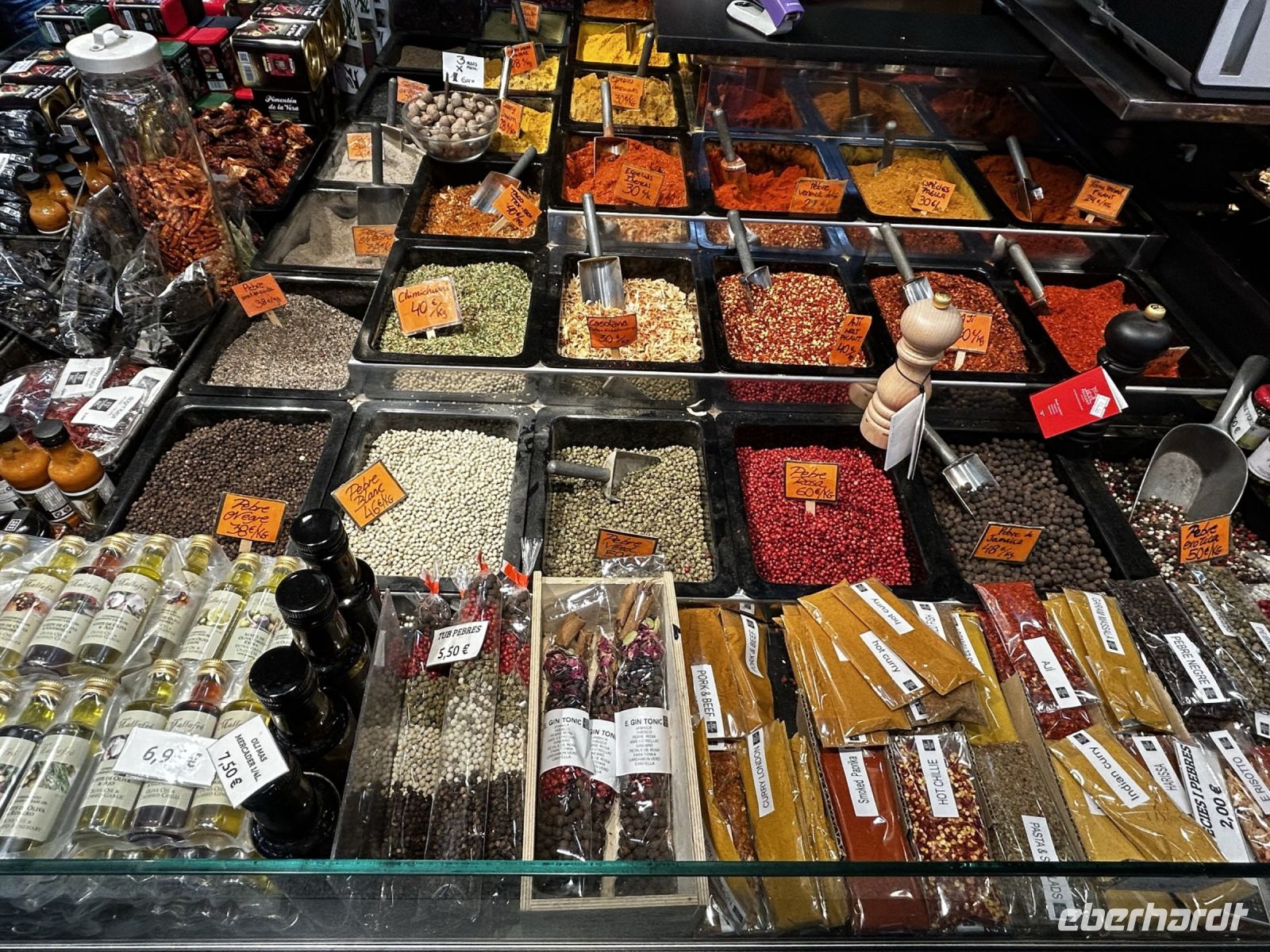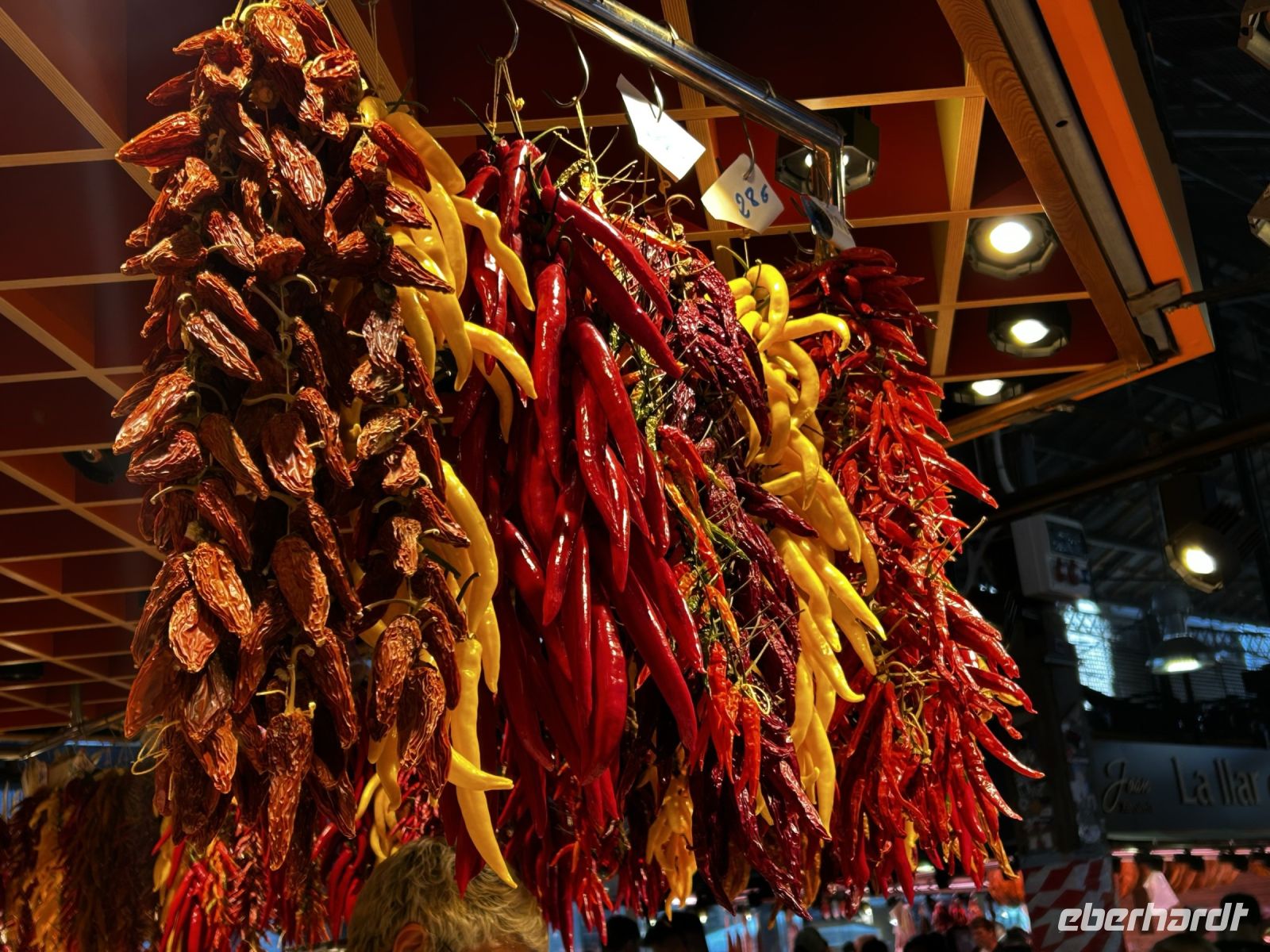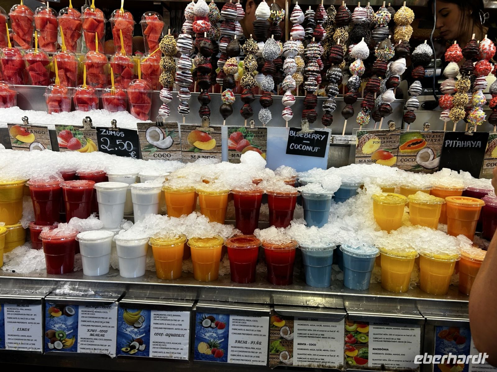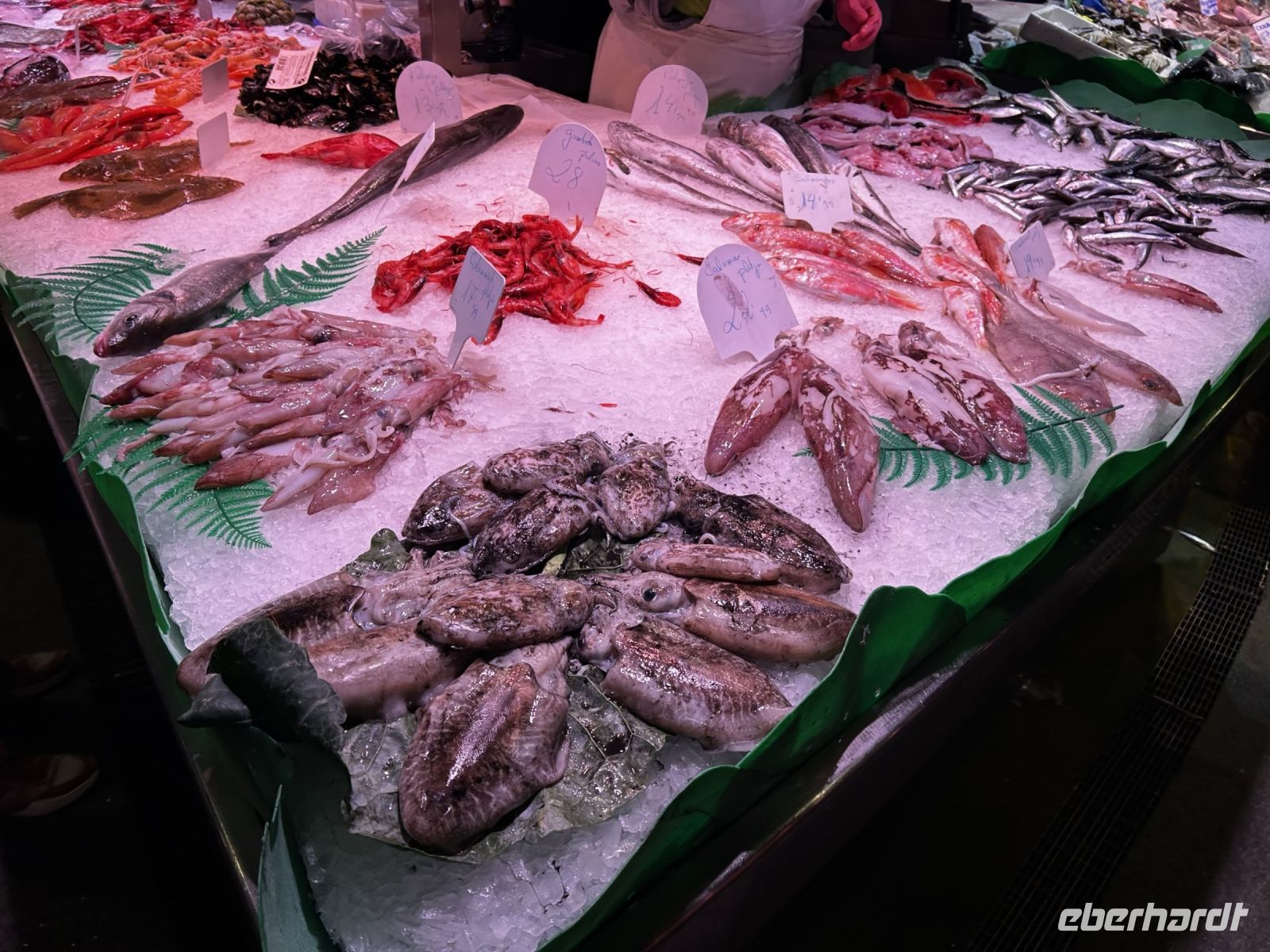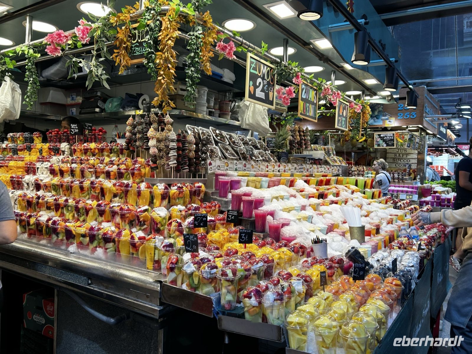 Wieder an unserem Startpunkt der La Rambla angekommen, entlässt uns Ingo in die Mittagspause, welche wir in der Markthalle La Boqueria verbringen. Hierbei handelt es sich nicht um eine klassische Markthalle, sondern eher um einen großen Marktplatz mit verschiedenen Händlern die ein vielfältiges Angebot an frischen Fisch, frisches Obst, gepressten Säften, Gewürzen und natürlich verschiedene Tapas anbieten.