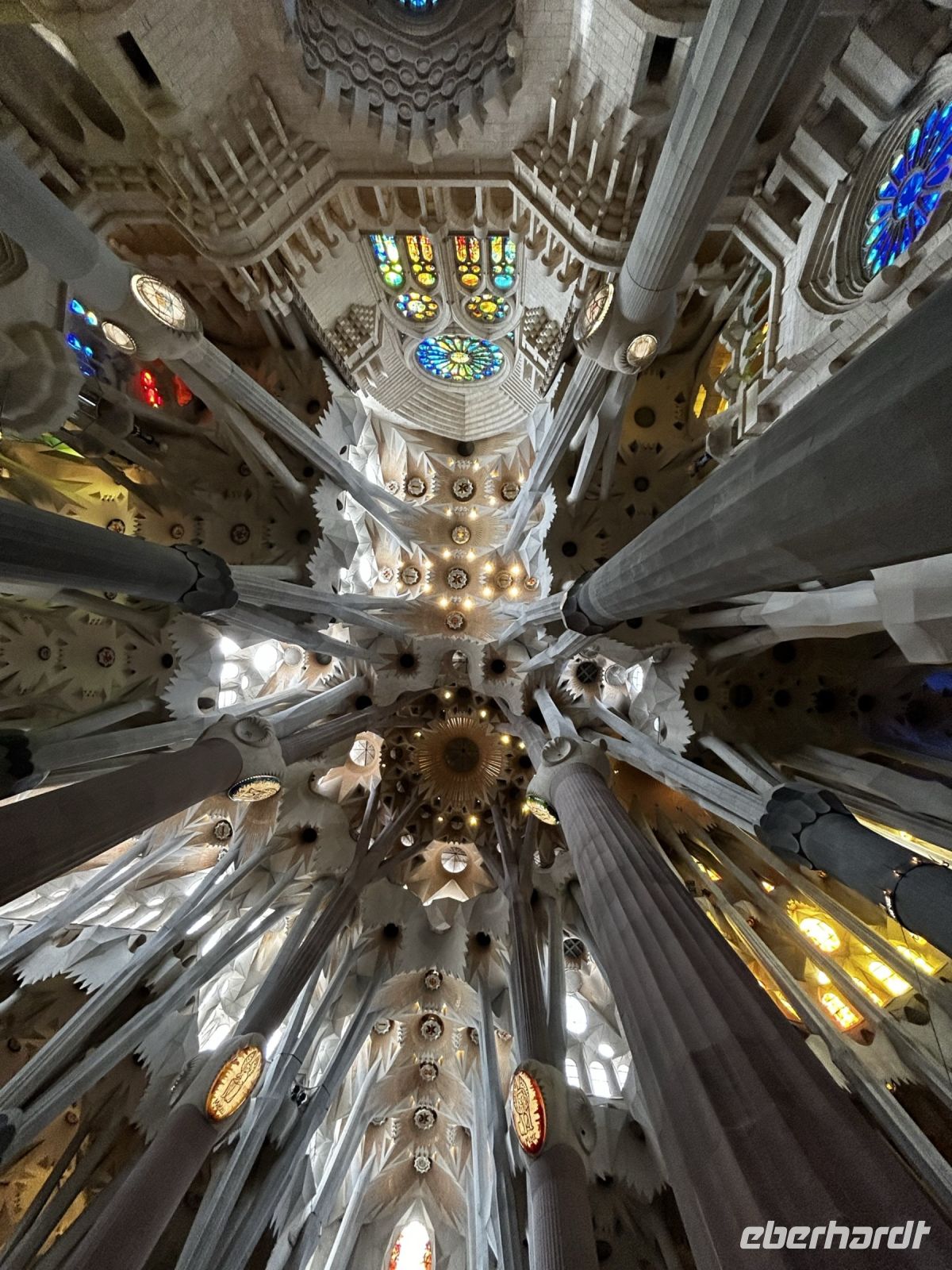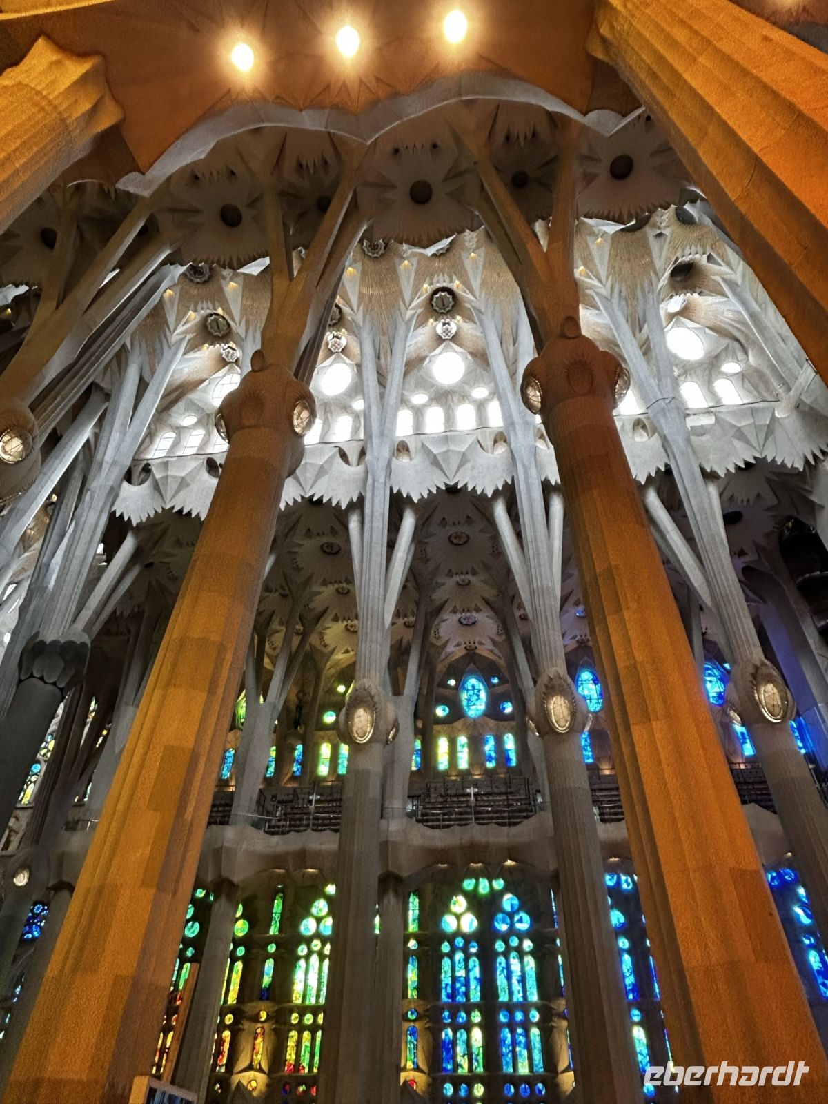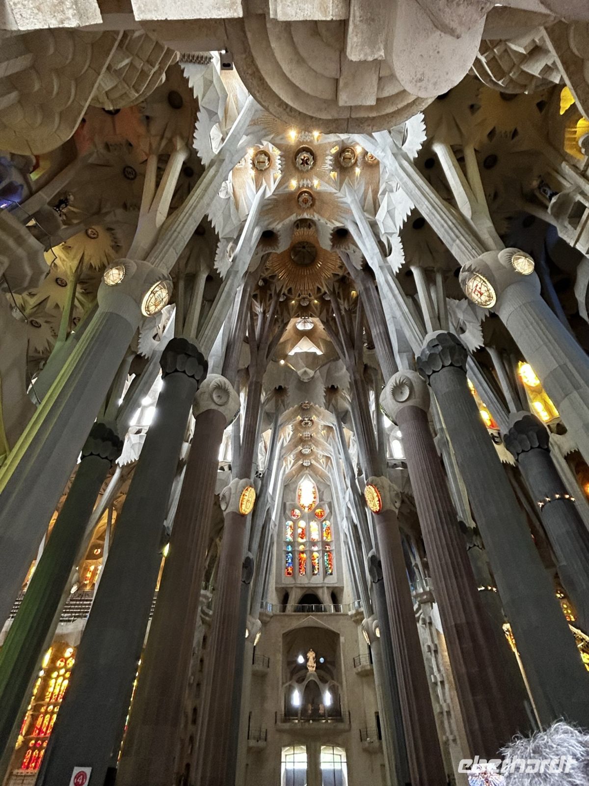 Der Innenraum der Kirche faszinierte durch eine einzigartige Bauweise. So stellen die besonderen Säulen Bäume und Äste dar, die das Dach des Tempels tragen und somit wird auch noch für eine perfekte Verteilung von Licht und Ton gesorgt. Die verschieden- farbige Kirchenfenster kreieren einen magischen Farb- und Lichteffekt und damit entsteht ein besonderes Gefühl von Ruhe in Gaudis Meisterwerk. Wir konnten uns gar nicht satt sehen und knipsten und staunten was das Zeug hält.