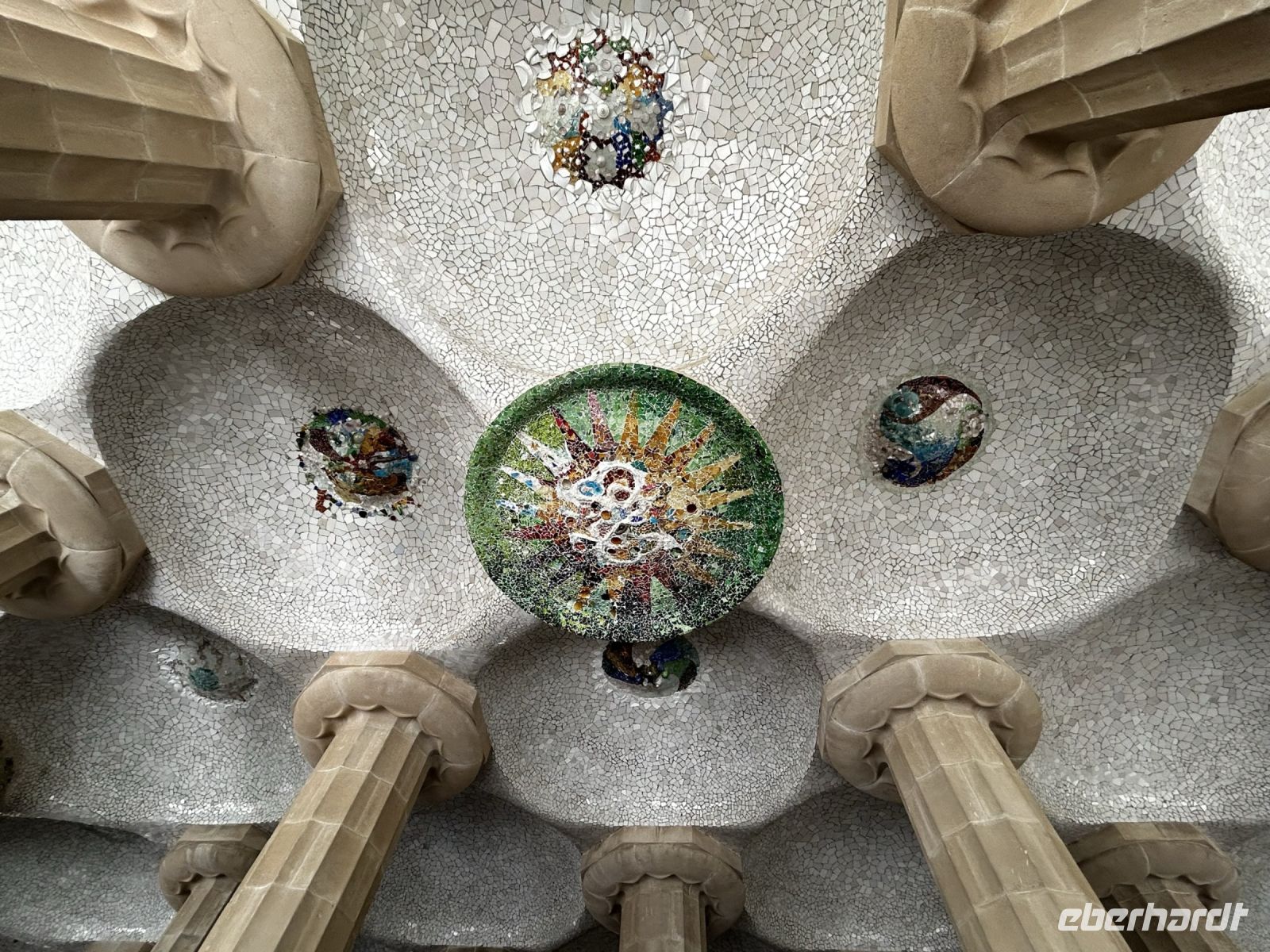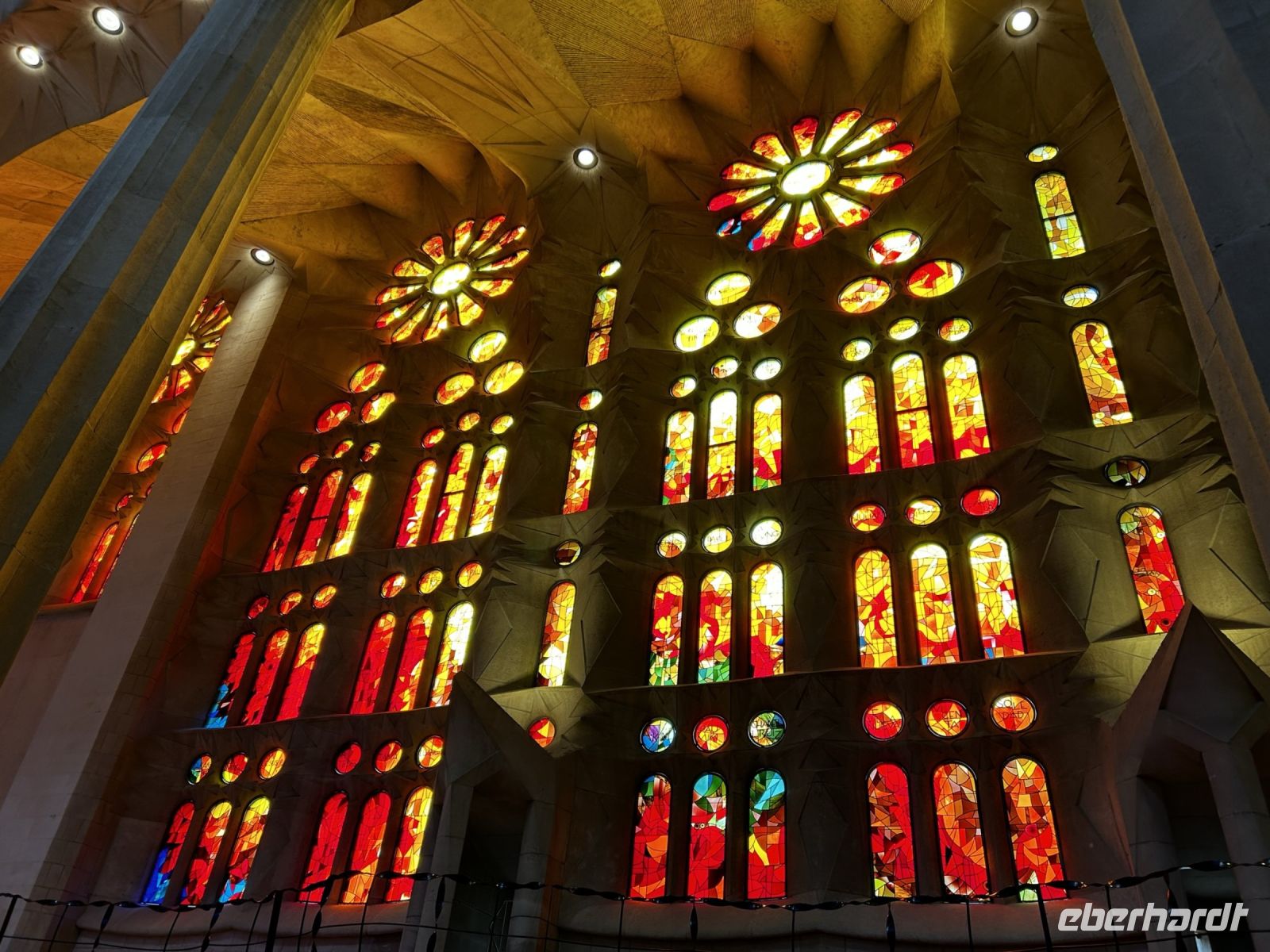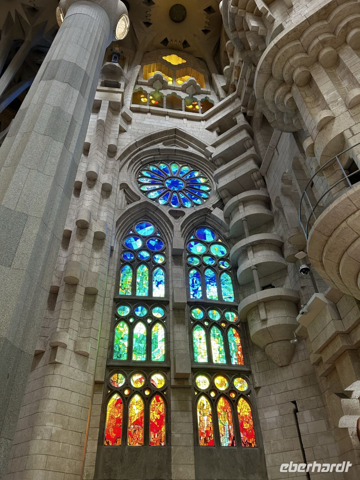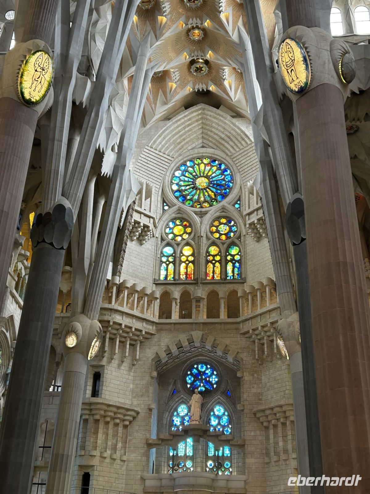 Der Innenraum der Kirche faszinierte durch eine einzigartige Bauweise. So stellen die besonderen Säulen Bäume und Äste dar, die das Dach des Tempels tragen und somit wird auch noch für eine perfekte Verteilung von Licht und Ton gesorgt. Die verschieden- farbige Kirchenfenster kreieren einen magischen Farb- und Lichteffekt und damit entsteht ein besonderes Gefühl von Ruhe in Gaudis Meisterwerk. Wir konnten uns gar nicht satt sehen und knipsten und staunten was das Zeug hält.