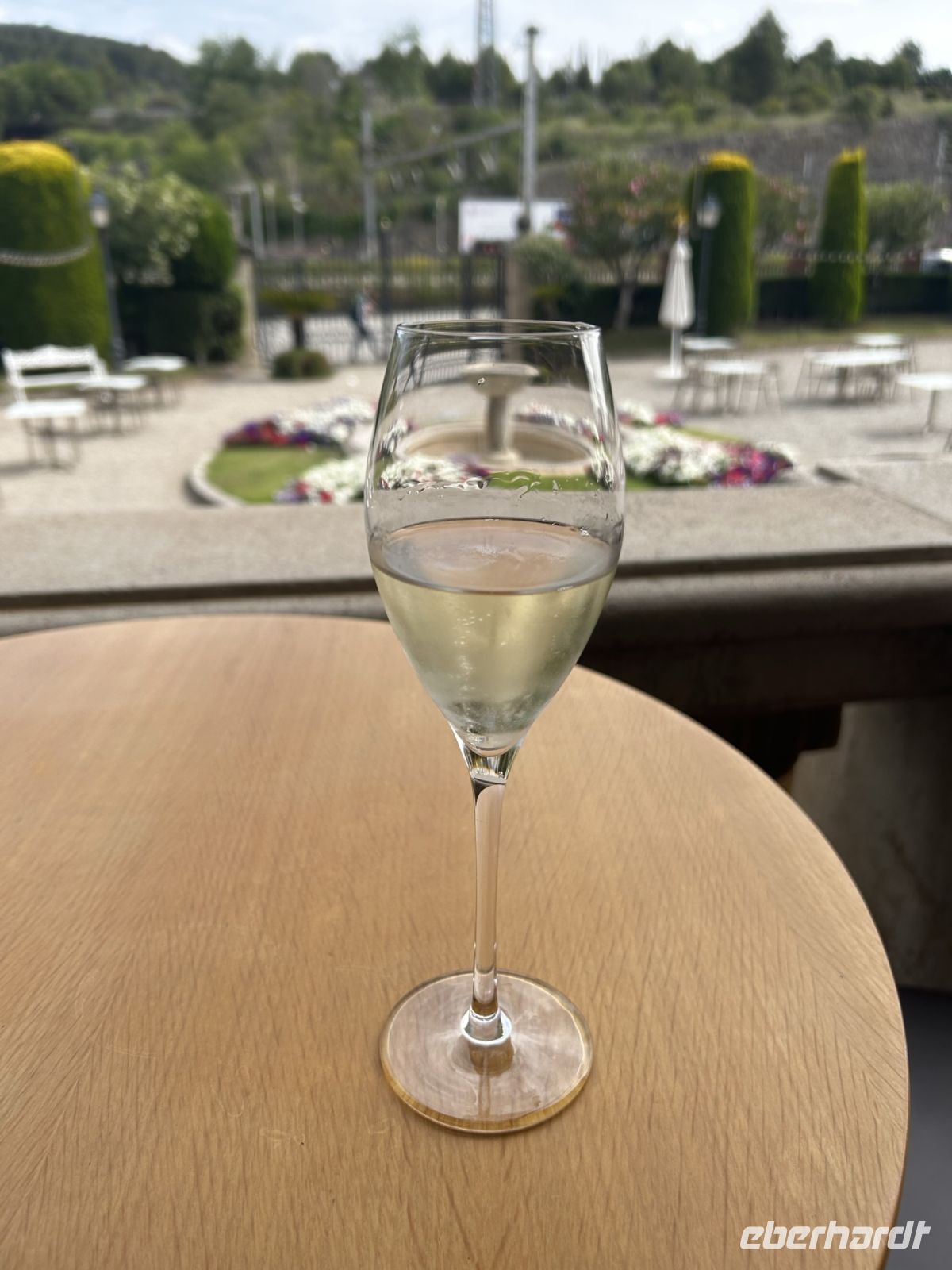 So sitzen wir also bei strahlendem Sonnenschein und netten Gesprächen auf der begrünten Terrasse und lassen uns 2 prickelnde Schaumweine schmecken.