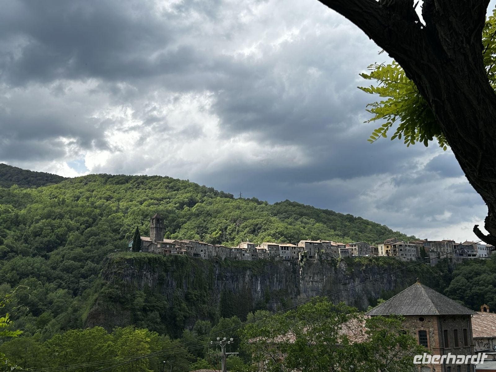 Auf unserer Busfahrt dorthin genießen wir den atemberaubenden Blick auf die schneebedeckten Pyrenäen in der Ferne sowie die Fahrt durch die Vulkanlandschaft der Comarca Garrotxa. Bei einem kleinen Abstecher nach Castellfollit de la Roca kann man sogar perfekt die Lavazunge sehen, auf der sich die Stadt angesiedelt hat. Ein Fotostopp durfte hier natürlich nicht fehlen.