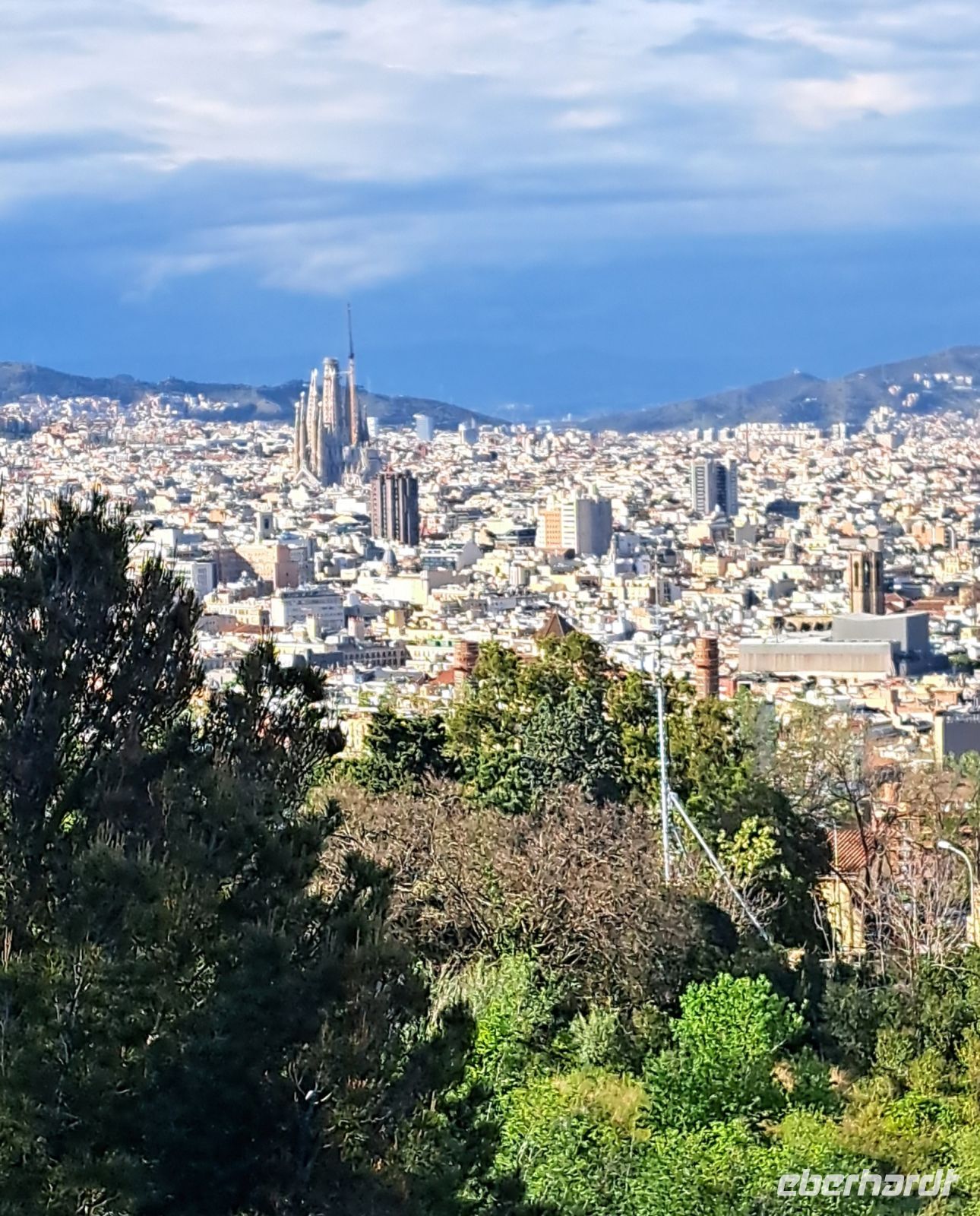 Anschließend fahren wir auf den "Hausberg" von Barcelona immerhin 173m hoch. Er ist aufgrund seiner vielen Sehenswürdigkeiten ein Anziehungspunkt für Touristen und Einheimische. Wir fahren zum Mirador Alcalde eine wunderschön gestaltete Terrasse mit Brunnen (leider ohne Wasser) und einer schönen Gartenanlage. Von hier haben wir einen fantastischen Rundum Blick über die Stadt und das Meer. Wir können von hier oben sogar die Sagrada Familia entdecken. Die Abendsonne verwöhnt uns und wir lassen den Blick über die schweifen.