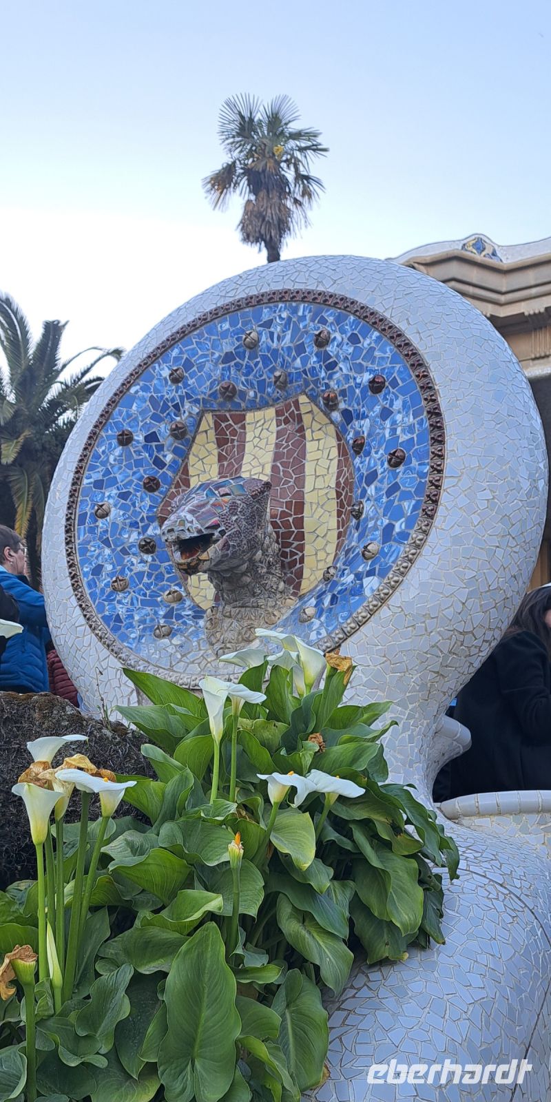 Am Nachmittag fahren die meisten von uns mit Daniel dem Reiseführer zum Park Güell. Der Park ist eines der bekanntesten Werke von Gaudi und gehört zu UNESCO Weltkulturerbe (seit 1984). Er ist zwischen 1900-1914 entstanden. Die ursprüngliche Idee war es eine Wohnsiedlung für reiche Bürger, finanziert von Eusebi Güell zu errichten. Dieses Projekt scheiterte. Es wurden nur zwei Häuser gebaut. Den Bürgern lag es zu weit vom Stadtkern entfernt. 1926 ist es dann zum Park Güell, einem öffentlichen Park geworden. Die Hauptsehenswürdigkeiten sind unter anderem die Hypostylhalle mit 86 Säulen. Darüber liegt die große Terrasse mit riesigen geschwungenen Mosaikbänken. Man hat von hier eine herrliche Aussicht über Barcelona bis zum Meer. Es gibt im Park schattige Wegen, Brücken und Stützen alles im organischen Stil von Gaudi. Er hat hier in seinem Wohnhaus von 1906-1925 gelebt und ist jeden morgen zu seiner Baustelle der Sagrada Familia gelaufen. Des weiteren gibt es am Eingangsbereich Häuschen, die niedlich wie Zuckerbäckerhäuschen anmuten. Bunt und rund. Eine große bunte Mosaik-Echse ist das Symbol des Parks. Wir schlendern beeindruckt durch den auch mit vielen exotischen Pflanzen bestückten Park zurück zum Bus.