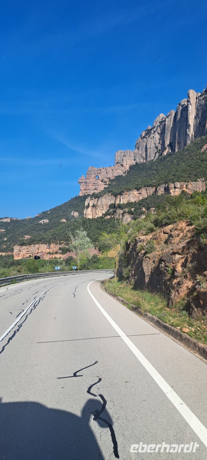 Am späten Nachmittag nach einer wunderschönen Fahrt durch die Natur mit Blick auf das "zersägte Gebirge"(Montserrat) erreichen wir unser heutiges Ziel das Kloster Montserrat. Es ist ein berühmtes Benediktinerkloster und liegt auf einem Berggipfel (721m). Es ist bekannt für seine atemberaubende Lage, die beeindruckende Felsformationen und die spirituelle Atmosphäre. Das Kloster wurde im 11. Jahrhundert gegründet und ist heute ein beliebtes Pilgerziel sowie ein touristischer Anziehungspunkt. Besonders bekannt ist die Statue der Jungfrau von Montserrat, auch "La Moreneta" (Die schwarze Madonna) genannt, die als Schutzpatronin Kataloniens gilt. Wir können dort die wunderschöne Basilika besichtigen. Wir hören die singenden Mönche kurz nach Ankunft im Kloster. Es ist ein Ort voller Geschichte, Kultur und Natur. Wir freuen uns, dass wir die Möglichkeit haben im angrenzenden Hotel Abat Cisneros zu übernachten. Wir genießen die Atmosphäre ohne Touristen. Allerdings werden vor dem Kloster Stuhlreihen aufgebaut, da am nächsten Abend eine der vielen Veranstaltungen der 1000 Jahr Feier stattfindet.