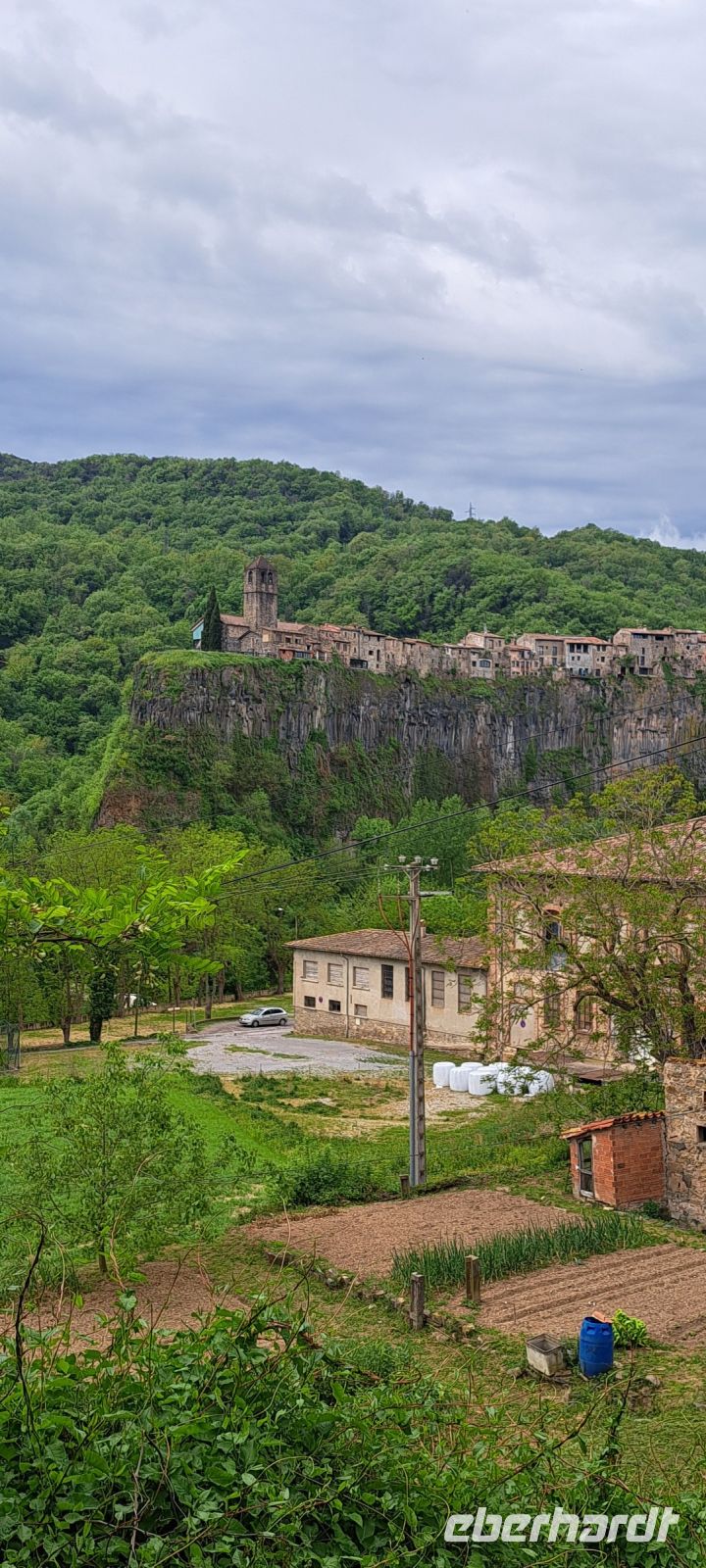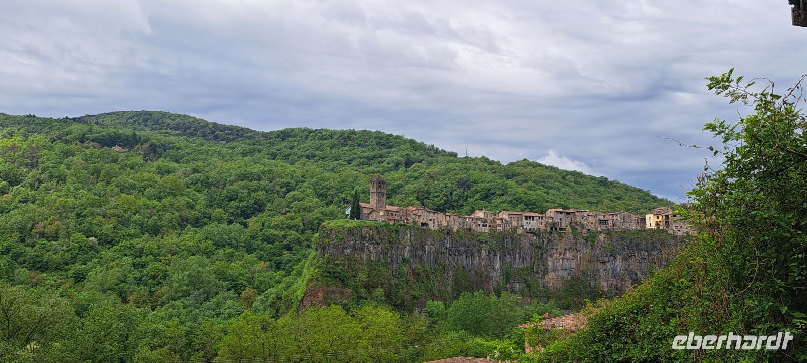 Dann geht es weiter mit dem Bus in Richtung Besalú. Kurz vorher machen wir noch einen kurzen Fotostop . Wir schauen von weitem auf das Dörfchen Castellfollit de la Roca. Der Ort liegt auf einem mehr als 50m hohen Felsmassiv aus Basaltgestein. Ein sehr beeindruckendes Fotomotiv.