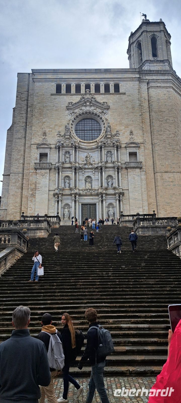 Wir verbringen die Mittagspause auf der lebendigen Placa de la Independencia, sie ist von hohen Häusern mit Arkaden umsäumt. Es gibt viele Tapas Bars, man sitzt gemütlich unter Schirmen und probiert die leckeren Tapas. Girona ist berühmt für ihre gut erhaltene Altstadt (Barri Vell) mit römischen, arabischen und mittelalterlichen Einflüssen. Es gibt eine erhaltene Stadtmauer, enge Gassen und eine imposante Kathedrale. Wir gehen durch das jüdische Viertel "El Call". Es ist eines der besterhaltenen in ganz Europa. Die bunten Häuser entlang des Flusses Onyar prägen das Stadtbild. Girona bietet auch moderne Aspekte, eine lebendige Kulturszene viele Cafes und Restaurants. Es gibt ca. 14000 Studenten in der Stadt. Lorenzo kann uns viel berichten, es ist seine Heimatstadt.