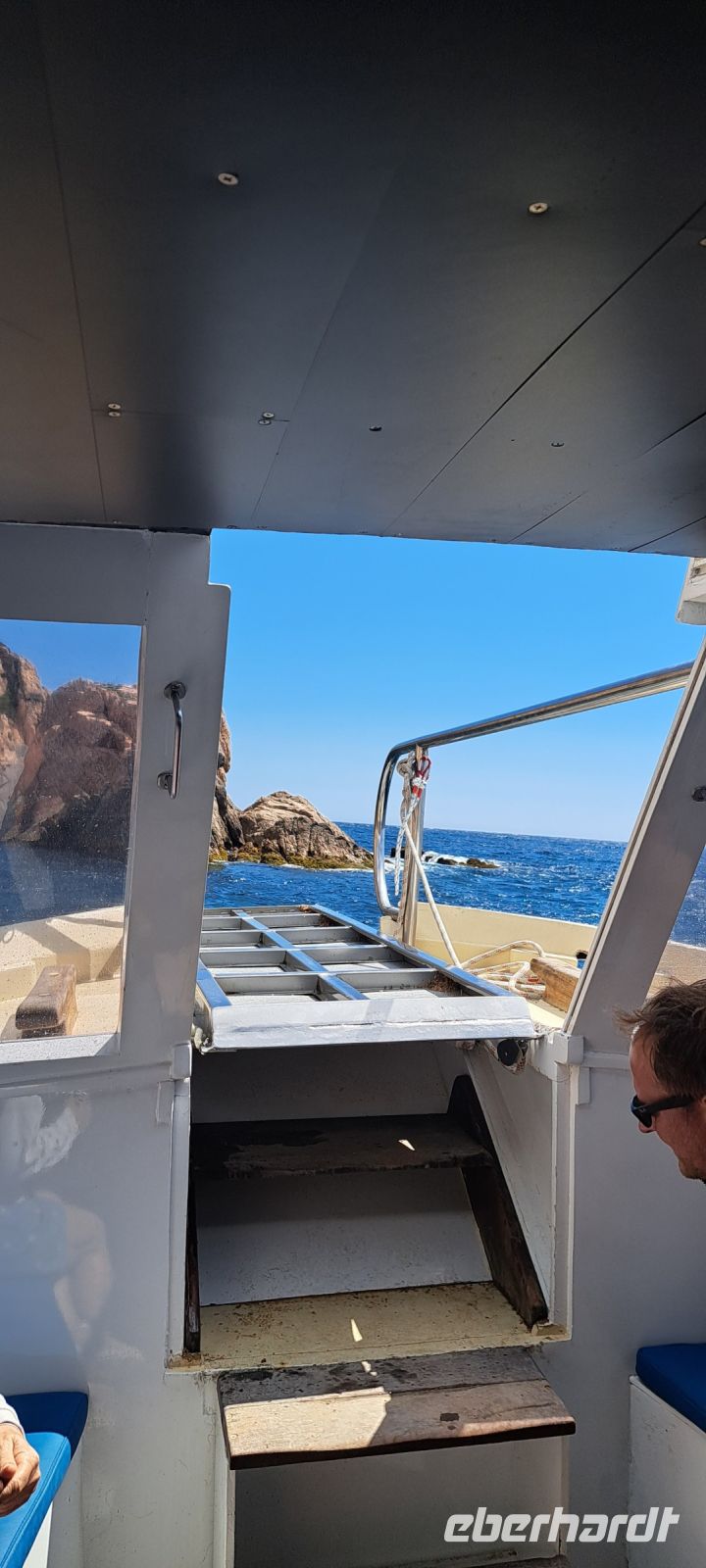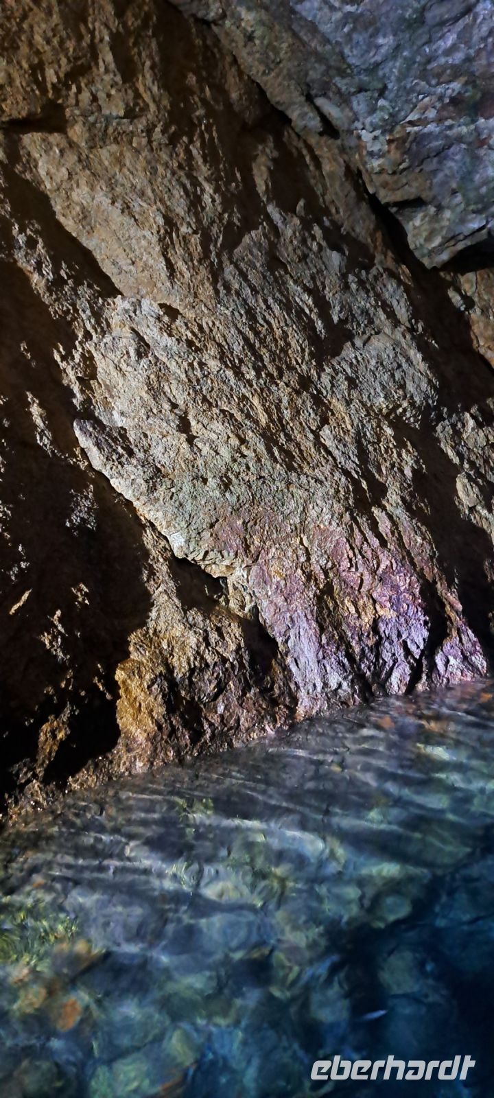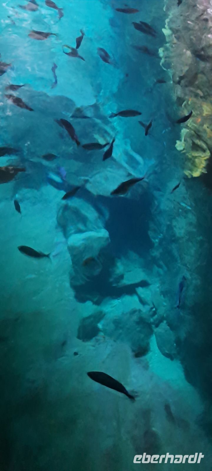 Um Punkt 12h geht unsere Fahrt mit den Glasbodenboot los. Wir fahren entlang der zerklüfteten Küste und hinein in sehr enge Höhlen. Hier beobachten wir die Fische die sich dort tummeln. Ein spannendes Abenteuer bei teilweise recht hohem Wellengang. Wir haben viel Spaß. Nach einer Stunde kommen wir wohlbehalten wieder am Strand an.