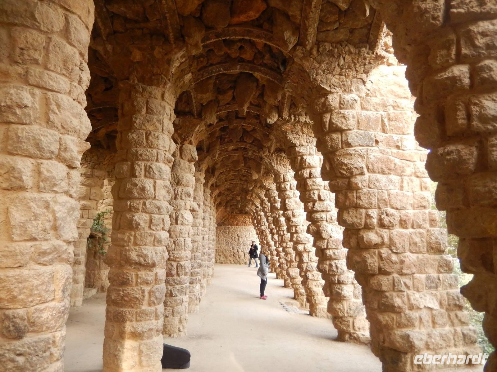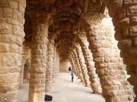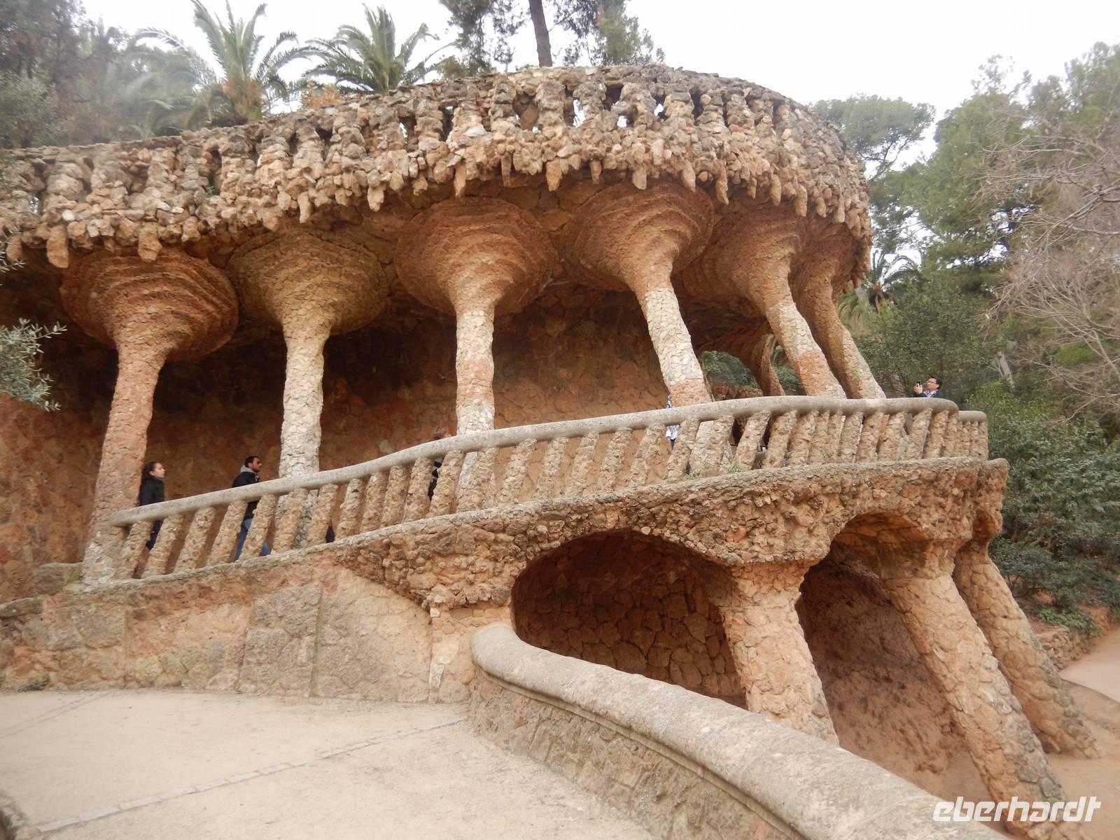 Von hier aus fuhren wir weiter vorbei an Casa Mila, einem Wohnhauskomplex, den Gaudi entwarf, zum Parc Güell. Der Park, der von dem Künstler Antonio Gaudi - ein berühmter spanischer Künstler des Modernisme - zwischen 1900 und 1914 erbaut wurde, sollte Ähnlichkeiten zu den englischen Gartenanlagen aufweisen. Die riesige Parkanlage, mit deren Ausgestaltung Gaudi vom Industriellen Eusebi Güell beauftragt worden war, sollte ehemals als Wohngebiet mit über 60 Villen dienen. Dieses Vorhaben scheiterte jedoch und somit ist die Anlage uns heute als Touristen zugänglich. Die Anlage beeindruckt vorallem mit der schlangenförmigen Sitzbank aus Mosaiken, welche sich auf einem riesigen Platz befindet, der von Säulen getragen wird.