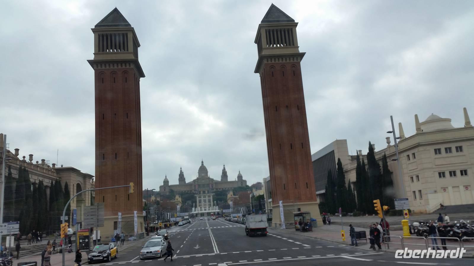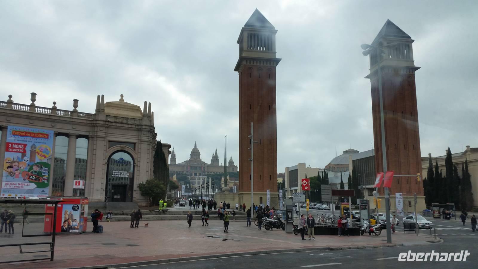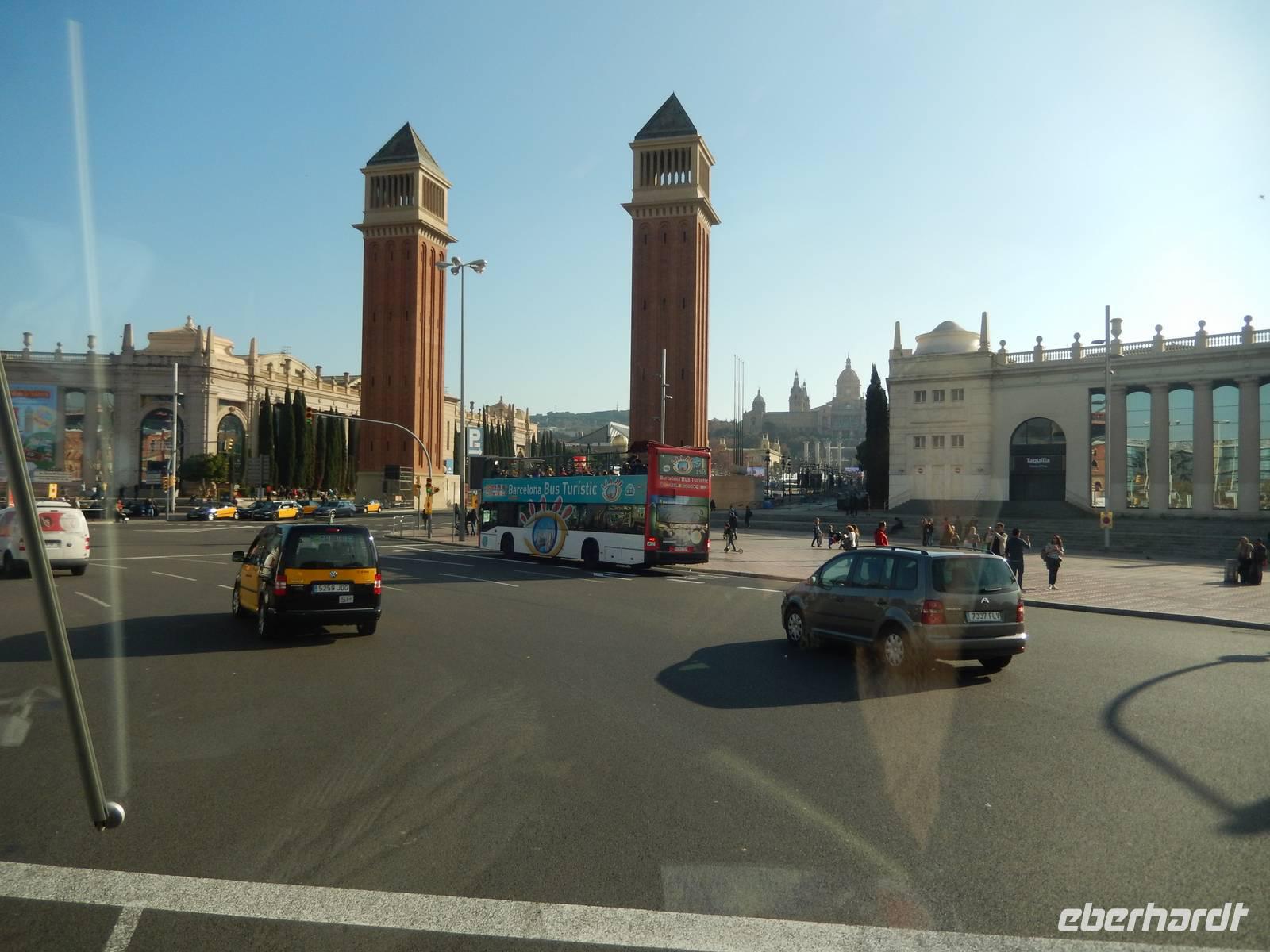 Mit guter Laune im Gepäck waren wir etwa gegen 12:10 in Barcelona gelandet und erhielten unsere Koffer zurück. Susanne begrüßte uns anschließend am Flughafen und war unsere Reiseleitung und Ansprechpartnerin mit lokalen Kenntnissen für unsere gemeinsame Reise. Susanne war schon da mit 4 Gäste aus München, die eine Stunde eher gelandet waren. Noch 4 Gäste aus Stuttgart und Düsseldorf landeten heute früh und waren schon in unserem 4 Sterne Pestana Arena Hotel. Wir fuhren dort vorbei und holten sie ab. Bereits um 13:30 startete unsere erste Besichtigungstour von Barcelona Flughafen in Richtung Montjuic, wo wir die ersten Schnappschüsse mit unseren Kameras einfangen konnten.