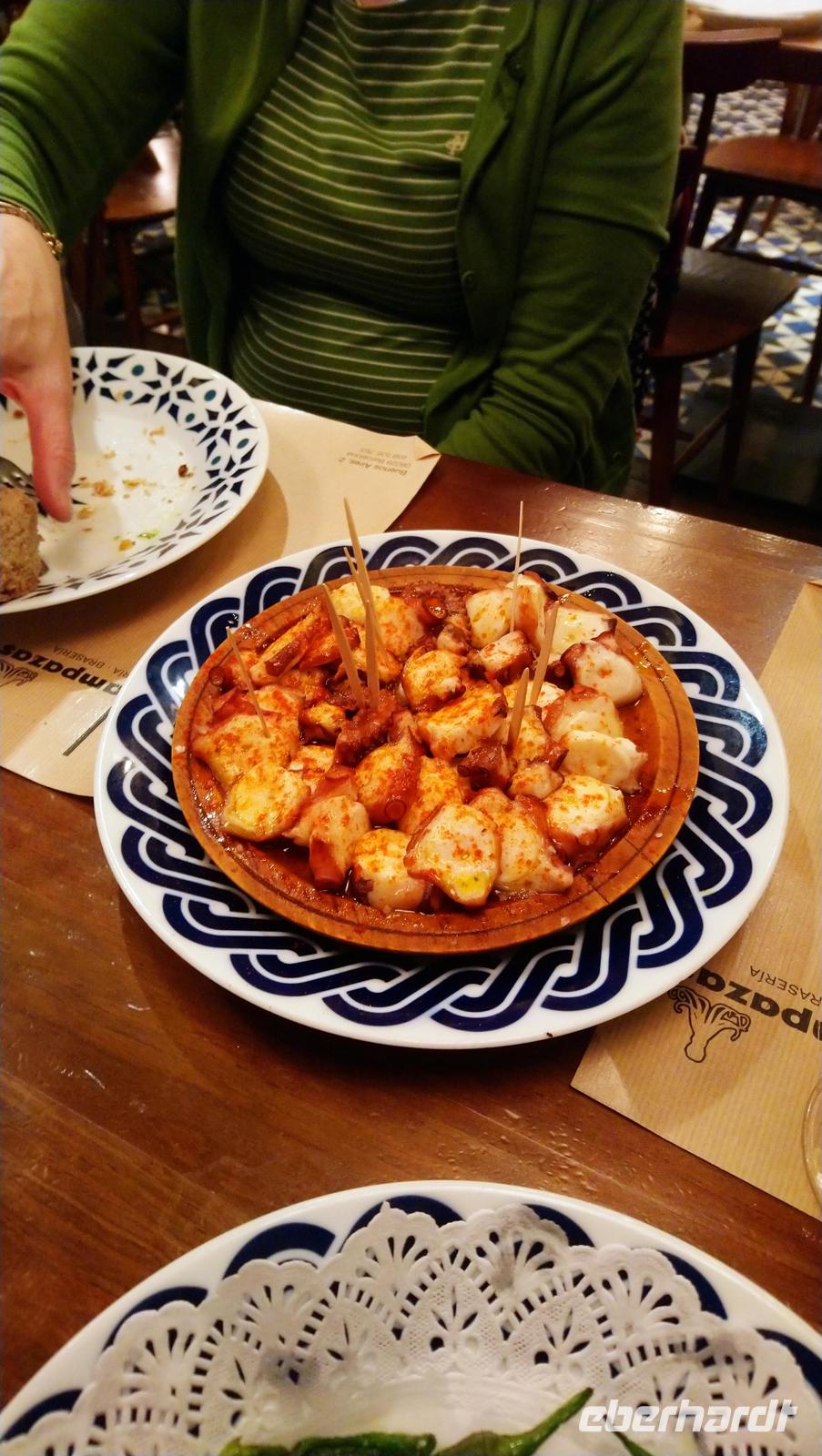 Der heutige sollte uns einen Überblick über Barcelona verschaffen. Zunächst verschafften wir uns allerdings einen Überblick über das reichhaltige Angebot beim Frühstücksbuffet, wo für jeden Geschmack etwas zu finden war: frisch zubereitete Eier, iberischer Schinken und cremiger Käse aus Spanien, kleine Puddingschnecken und selbst zusammengestelltes Müsli sind hier nur einige Beispiele für die Vielfalt an dargebotenen Speisen. Gegen 10 Uhr trafen wir uns dann mit unserer örtlichen Reiseleiterin Susanne und starteten mit einem Kleinbus zur Stadtrundfahrt. Zunächst fuhren wir auf den Hausberg der Stadt, den Montjuic. Diese "grüne Lunge der Stadt" diente unter anderem 1992 als Austragungsstätte bei den Olympischen Sommerspielen. Im Zuge dessen besichtigten wir das dortige Stadion, bevor wir unseren Blick über den Hafen der Stadt schweifen ließen. Anschließend bestiegen wir die Gondeln der städtischen Seilbahn. Von diesen aus konnten wir nicht nur unser Hotel in der Ferne sehen, sondern auch die Baukräne der Sagrada Familia. Um einen ersten Eindruck von Barcelona zu bekommen, gibt es wohl keinen schöneren Ort als diesen. Nachdem wir noch eine kleine Runde vor dem historischen Fort der Stadt gegangen waren, bestiegen wir wieder unseren Kleinbus und fuhren nach Barcelonetta. Dort schlenderten wir im Sonnenschein entlang der Strandpromenade und legten eine kleine Kaffeepause ein, bevor wir uns wieder in das emsige Treiben der Stadt stürzten. Über die bekannten Einkaufsstraßen Las Ramblas führte uns Susanne weiter in die verwinkelten Gassen des gotischen Viertels, zum Rathaus, dem Placa del Rei und der Kirche Santa Cruz y Santa Eulalia. Die anschließenden Nachmittagsstunden konnten für Einkäufe in der Stadt genutzt werden, ehe wir uns am Abend zum gemeinsamen Essen trafen. Vom Hotel aus spazierten wir zur "Pulperia Can Lampazas", wo uns Muscheln, Oktopus, grüne Paprika und zahlreiche weitere kleine Speisen zum Tagesausklang serviert wurden.