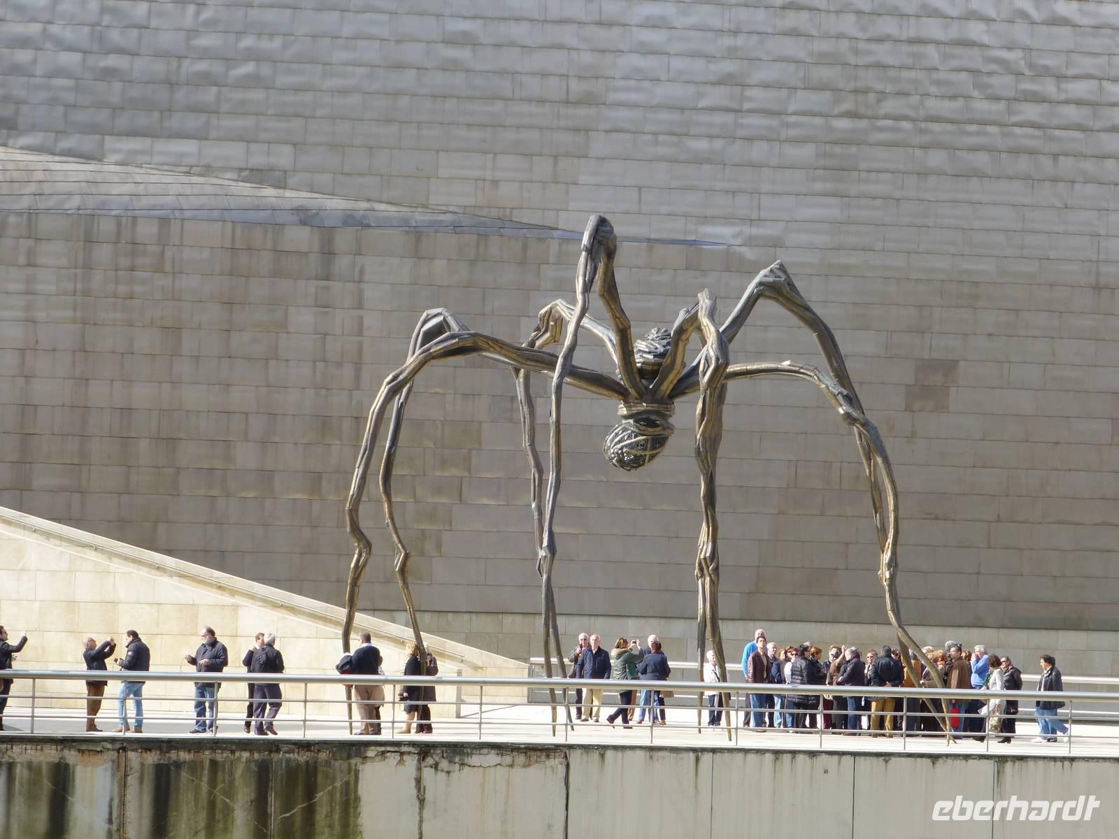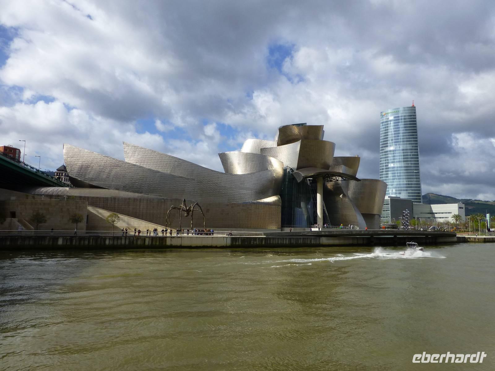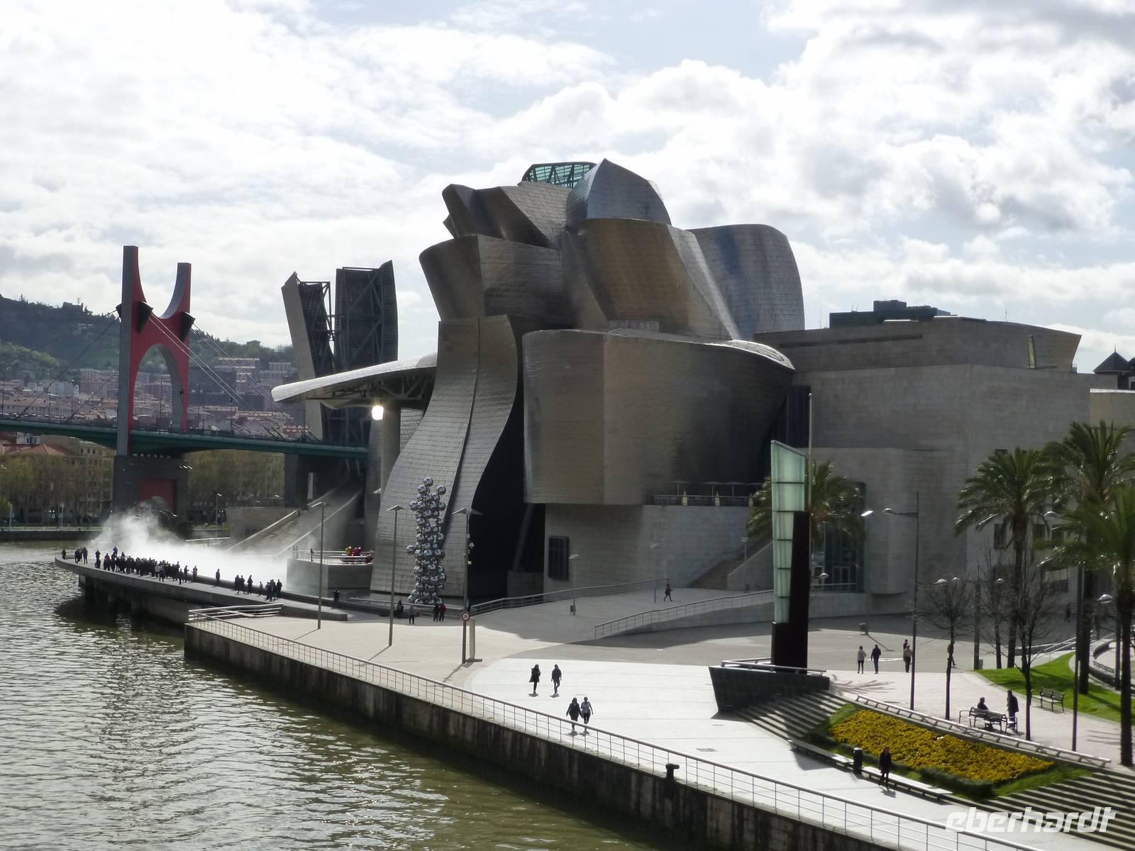 Gestärkt durch das reichhaltige Frühstücksbuffet besichtigten wir am Vormittag das Guggenheim Museum. Das Guggenheim Bilbao rief eine der tiefgreifendsten Umwandlungen hervor, die eine europäische Stadt je erlebte. Nach dem Zusammenbruch der Industrie von Bilbao in den 80er Jahren setzten sich die baskischen Verwaltungsorgane mit der Guggenheim Foundation in Verbindung. Seit der Eröffnung 1997 hat sich Frank O. Gehrys einzigartiges Meisterwerk zu einem neuen Anziehungspunkt der Stadt entwickelt. Nicht nur von außen auch von innen faszinierte uns dieses Gebäude.