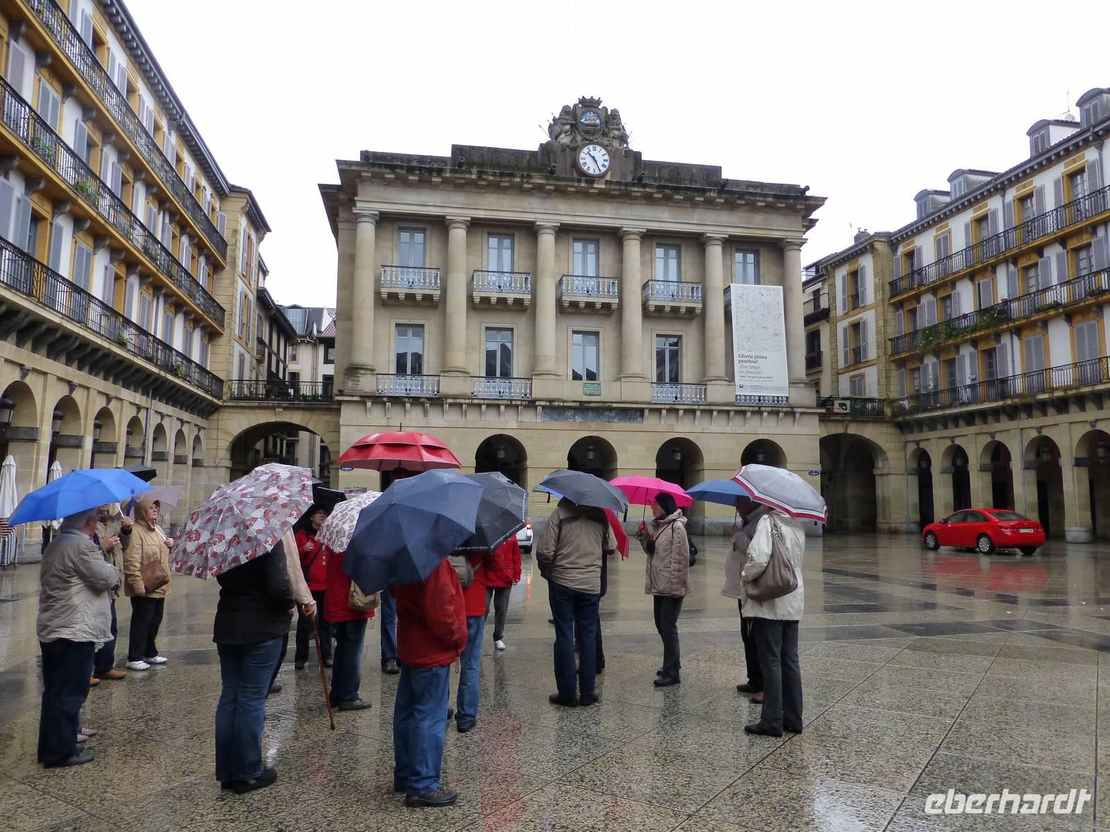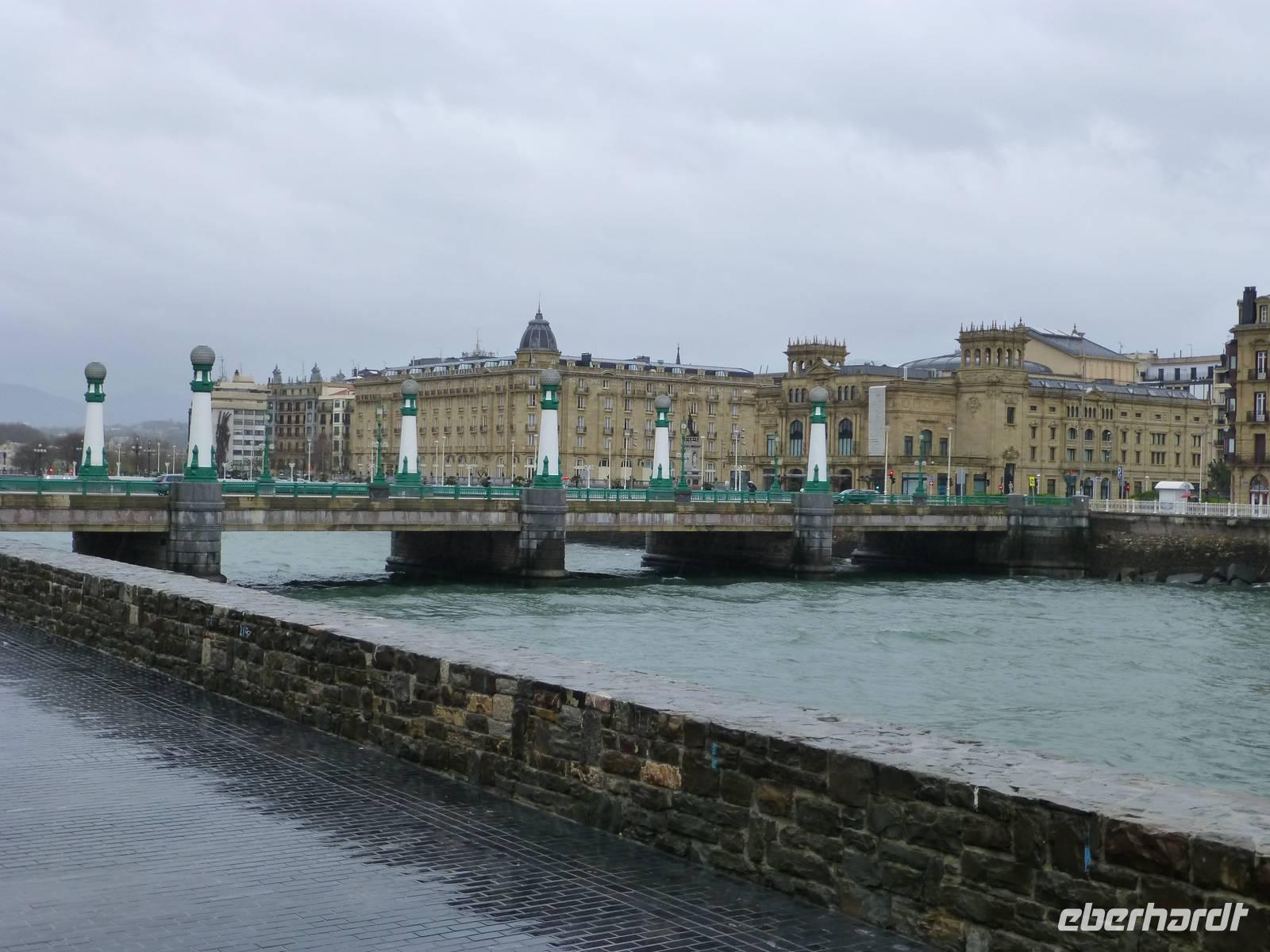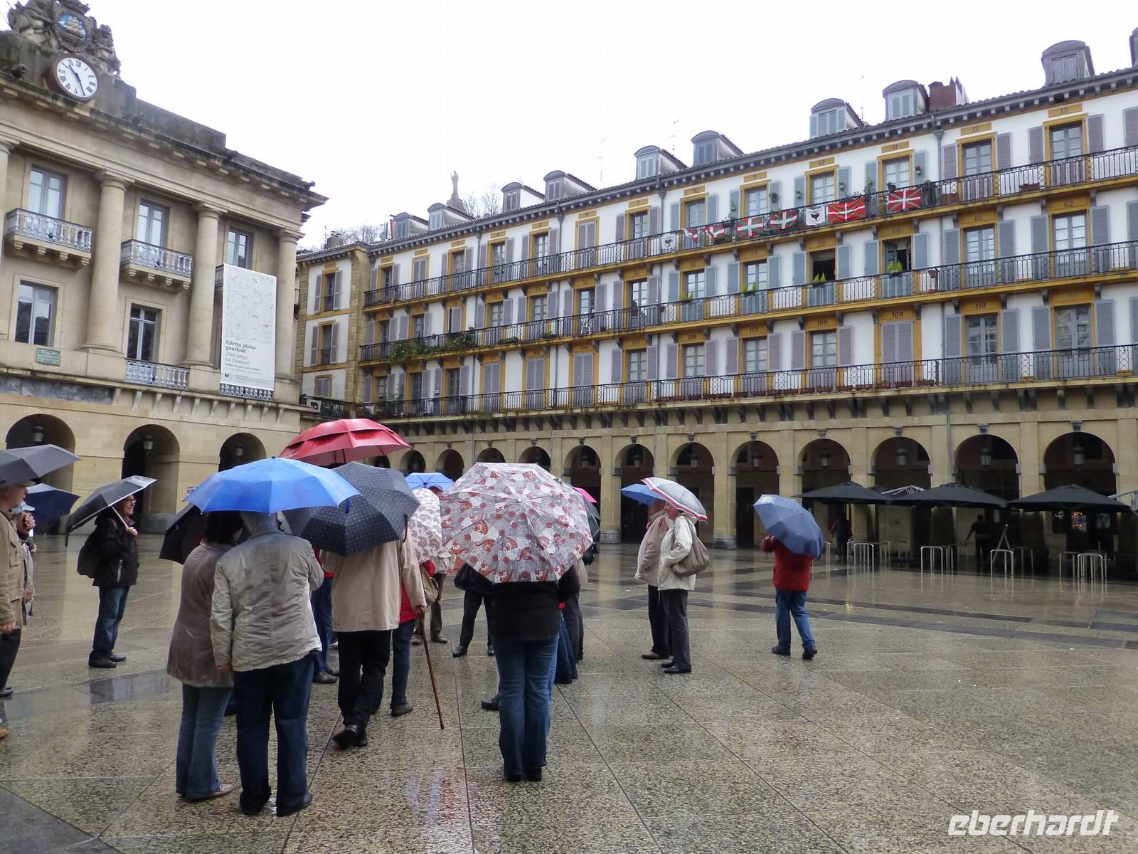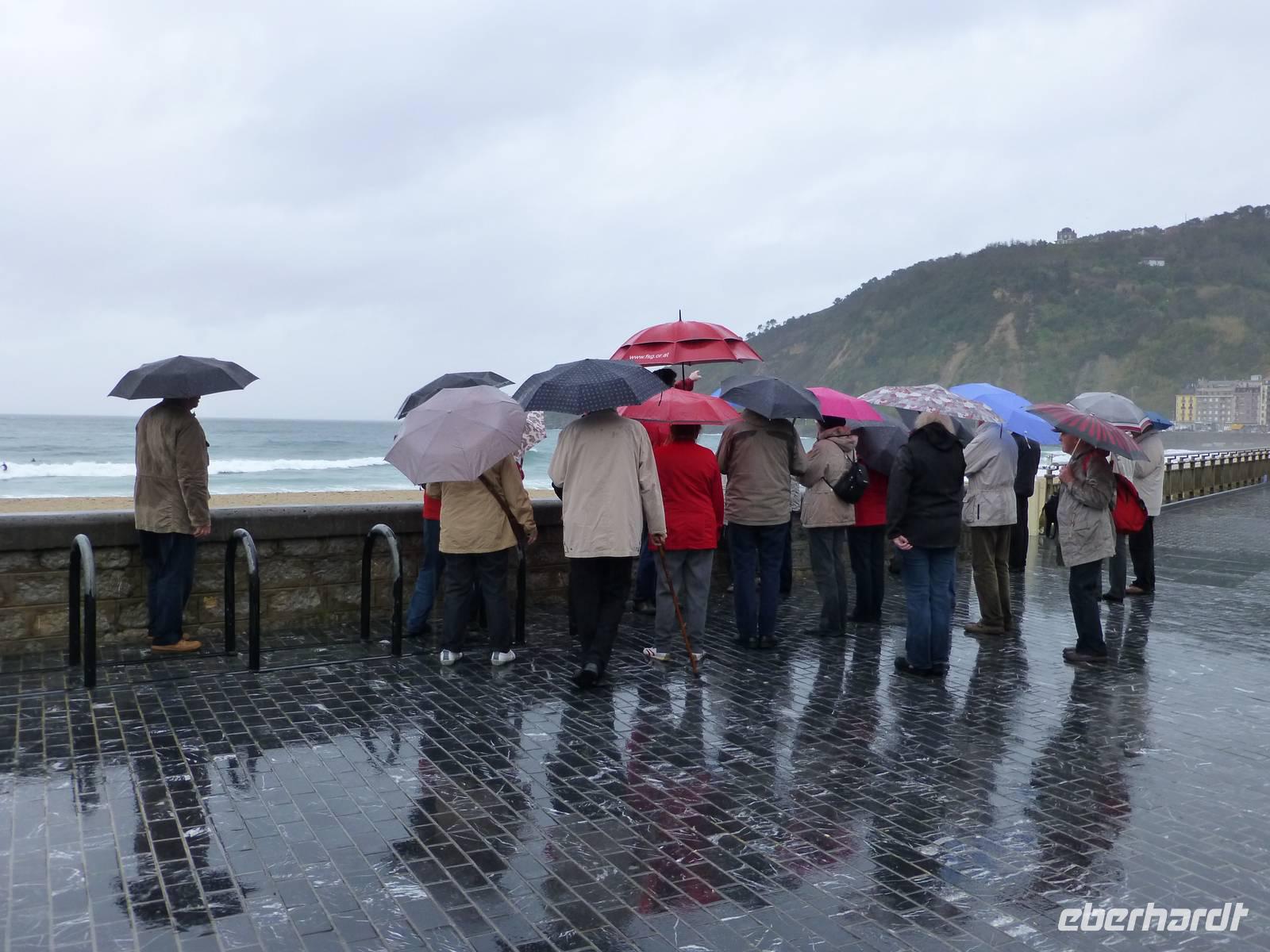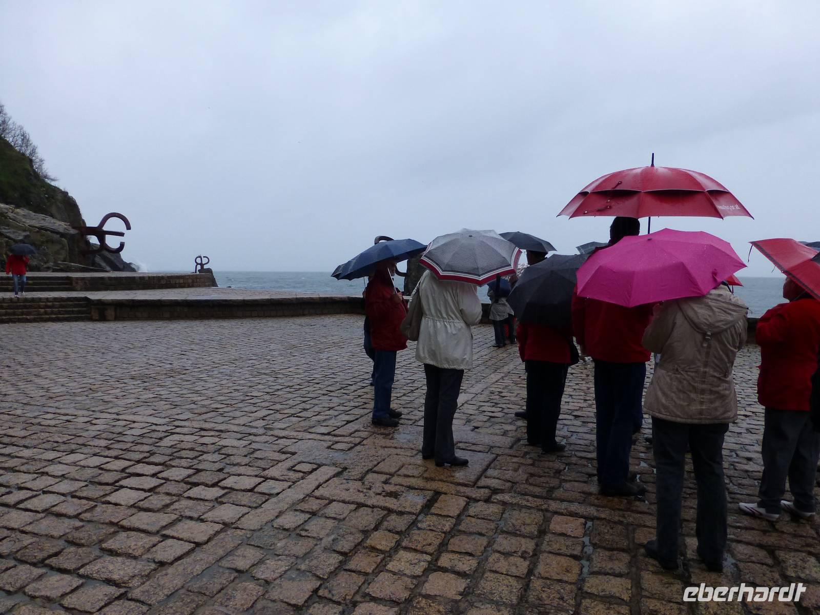 Mit dem Bus setzten wir unsere Stadtrundfahrt entlang der La Concha fort und erreichten den Kursaal, das 1999 eröffnete Kongresszentrum. Der von hier beginnende Stadtrundgang führte uns zuerst über den Fluss Urumea in die Gassen der Altstadt. An der Barockfassade der Basilika Santa Maria vorbei erreichten wir noch einige typische baskische Häuser, die den Flächenbrand von 1813 überstanden hatten. Er erzählte uns über die gastronomischen Gesellschaften bzw. Kochklubs der Männer. Da er auch Mitglied eines solchen Klubs ist, hatten wir die Möglichkeit einen Blick in seinen Klub zu werfen. Küchentechnisch perfekt eingerichtet sind sie ausschließlich den Männern vorbehalten, die kochen und essen. Frauen werden nur zum Mittagessen zugelassen und dürfen sich nicht einmischen. Im Anschluss erklommen wir den Hausberg Monte Urgull. Der Regen ließ langsam nach und damit wurde auch die Sicht auf die Bucht sowie das Hinterland bessern. In der Bucht befindet sich die kleine Insel Santa Clara, welche alljährlich am 28.12. (dem 01. April in Spanien) besetzt und zur ersten südfriesischen Insel erklärt wird. Die Besetzung der Petersilieninsel war der Grund für diese lustige Idee, welche zwischenzeitlich zu einer festen Veranstaltung in San Sebastian geworden ist. Der Gipfel wird bekrönt von einer monumentalen Christusstatue. In den Überresten der Festung Castilo de Santa Cruz de la Mota befindet sich das Heimatmuseum, welches wir besichtigten. Wieder zurück in der Stadt kehrten wir alle in eine Bar ein und probierten von der riesigen Auswahl der pintxos. San Sebastian ist die nordspanische Hauptstadt der Tapas, die hier pintxos genannt werden. Die Auswahl war überwältigend. Nach dieser Stärkung verließen wir San Sebastian mit einem weinenden Auge und fuhren nach Bilbao. Dort erwartete uns bereits Cristina zur Stadtführung. Das erste Highlight war die Hängebrücke Puente Colgante an der Mündung des Rio Nervion. Bei diesem Brückenunikum handelt es sich um die älteste Schwebebrücke der Welt. In der Gondel überquerten wir den Fluss. Diese Brücke von 1893 ist heute immer noch ein wichtiges Transportmittel für die Einwohner. Bilbao war Jahrzehntelang ein Symbol für dampfende Schlote und graue Industriegebiet, welches sich zu einem modernen Zentrum mit hochkarätiger Architektur und Kunst gewandelt hat. Durch die Vororte fuhren wir am Rio Nervion zurück in die Stadt, um den Kern der Altstadt um die „Siete Calles" („Sieben Straßen") kennen zu lernen. Nach der Besichtigung der Altstadt fuhren wir in unser Hotel Gran Bilbao.