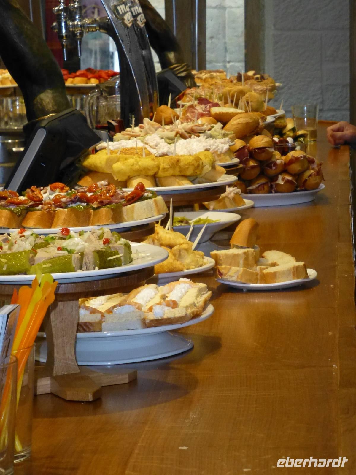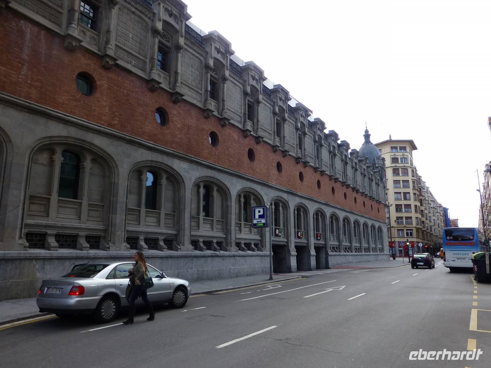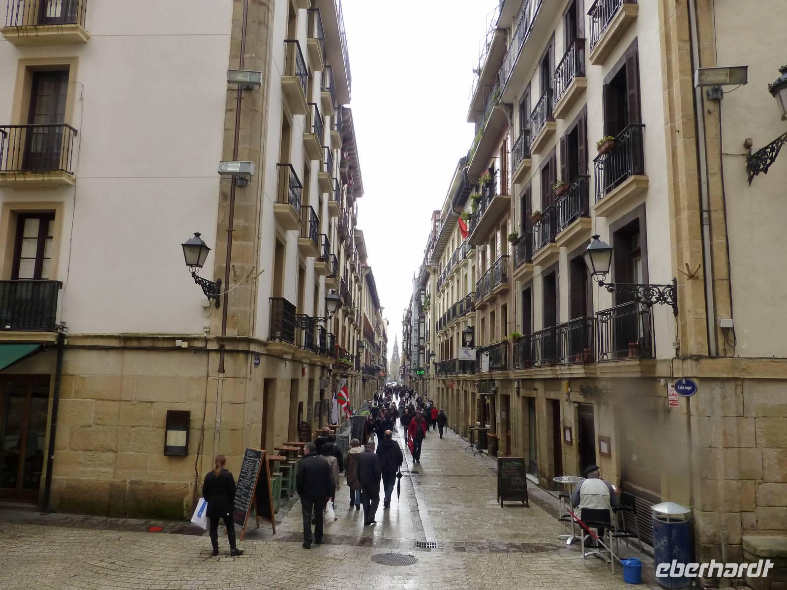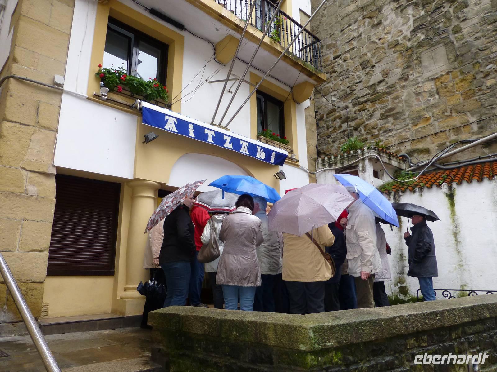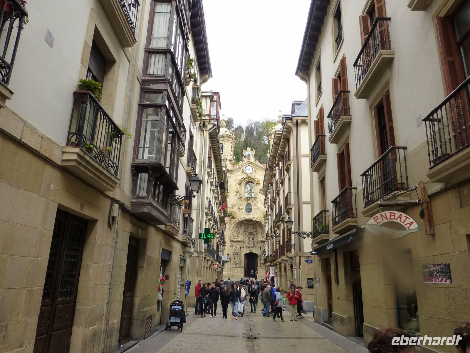 Mit dem Bus setzten wir unsere Stadtrundfahrt entlang der La Concha fort und erreichten den Kursaal, das 1999 eröffnete Kongresszentrum. Der von hier beginnende Stadtrundgang führte uns zuerst über den Fluss Urumea in die Gassen der Altstadt. An der Barockfassade der Basilika Santa Maria vorbei erreichten wir noch einige typische baskische Häuser, die den Flächenbrand von 1813 überstanden hatten. Er erzählte uns über die gastronomischen Gesellschaften bzw. Kochklubs der Männer. Da er auch Mitglied eines solchen Klubs ist, hatten wir die Möglichkeit einen Blick in seinen Klub zu werfen. Küchentechnisch perfekt eingerichtet sind sie ausschließlich den Männern vorbehalten, die kochen und essen. Frauen werden nur zum Mittagessen zugelassen und dürfen sich nicht einmischen. Im Anschluss erklommen wir den Hausberg Monte Urgull. Der Regen ließ langsam nach und damit wurde auch die Sicht auf die Bucht sowie das Hinterland bessern. In der Bucht befindet sich die kleine Insel Santa Clara, welche alljährlich am 28.12. (dem 01. April in Spanien) besetzt und zur ersten südfriesischen Insel erklärt wird. Die Besetzung der Petersilieninsel war der Grund für diese lustige Idee, welche zwischenzeitlich zu einer festen Veranstaltung in San Sebastian geworden ist. Der Gipfel wird bekrönt von einer monumentalen Christusstatue. In den Überresten der Festung Castilo de Santa Cruz de la Mota befindet sich das Heimatmuseum, welches wir besichtigten. Wieder zurück in der Stadt kehrten wir alle in eine Bar ein und probierten von der riesigen Auswahl der pintxos. San Sebastian ist die nordspanische Hauptstadt der Tapas, die hier pintxos genannt werden. Die Auswahl war überwältigend. Nach dieser Stärkung verließen wir San Sebastian mit einem weinenden Auge und fuhren nach Bilbao. Dort erwartete uns bereits Cristina zur Stadtführung. Das erste Highlight war die Hängebrücke Puente Colgante an der Mündung des Rio Nervion. Bei diesem Brückenunikum handelt es sich um die älteste Schwebebrücke der Welt. In der Gondel überquerten wir den Fluss. Diese Brücke von 1893 ist heute immer noch ein wichtiges Transportmittel für die Einwohner. Bilbao war Jahrzehntelang ein Symbol für dampfende Schlote und graue Industriegebiet, welches sich zu einem modernen Zentrum mit hochkarätiger Architektur und Kunst gewandelt hat. Durch die Vororte fuhren wir am Rio Nervion zurück in die Stadt, um den Kern der Altstadt um die „Siete Calles" („Sieben Straßen") kennen zu lernen. Nach der Besichtigung der Altstadt fuhren wir in unser Hotel Gran Bilbao.