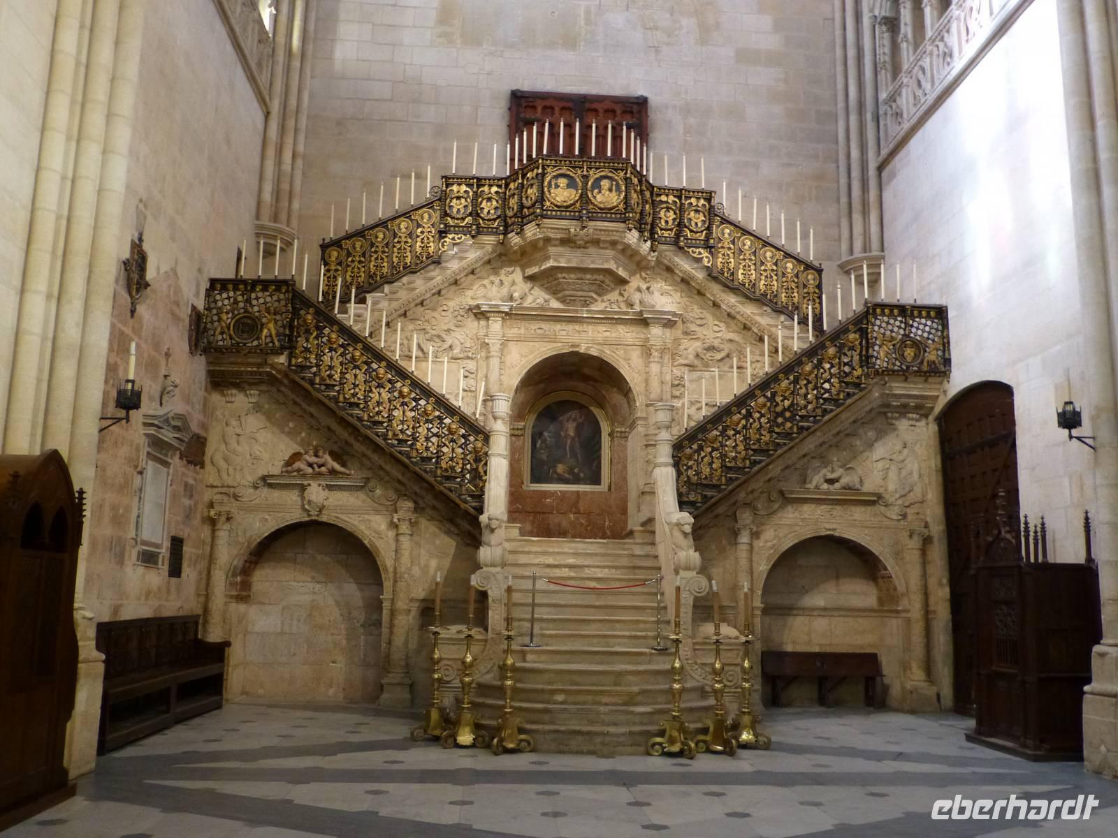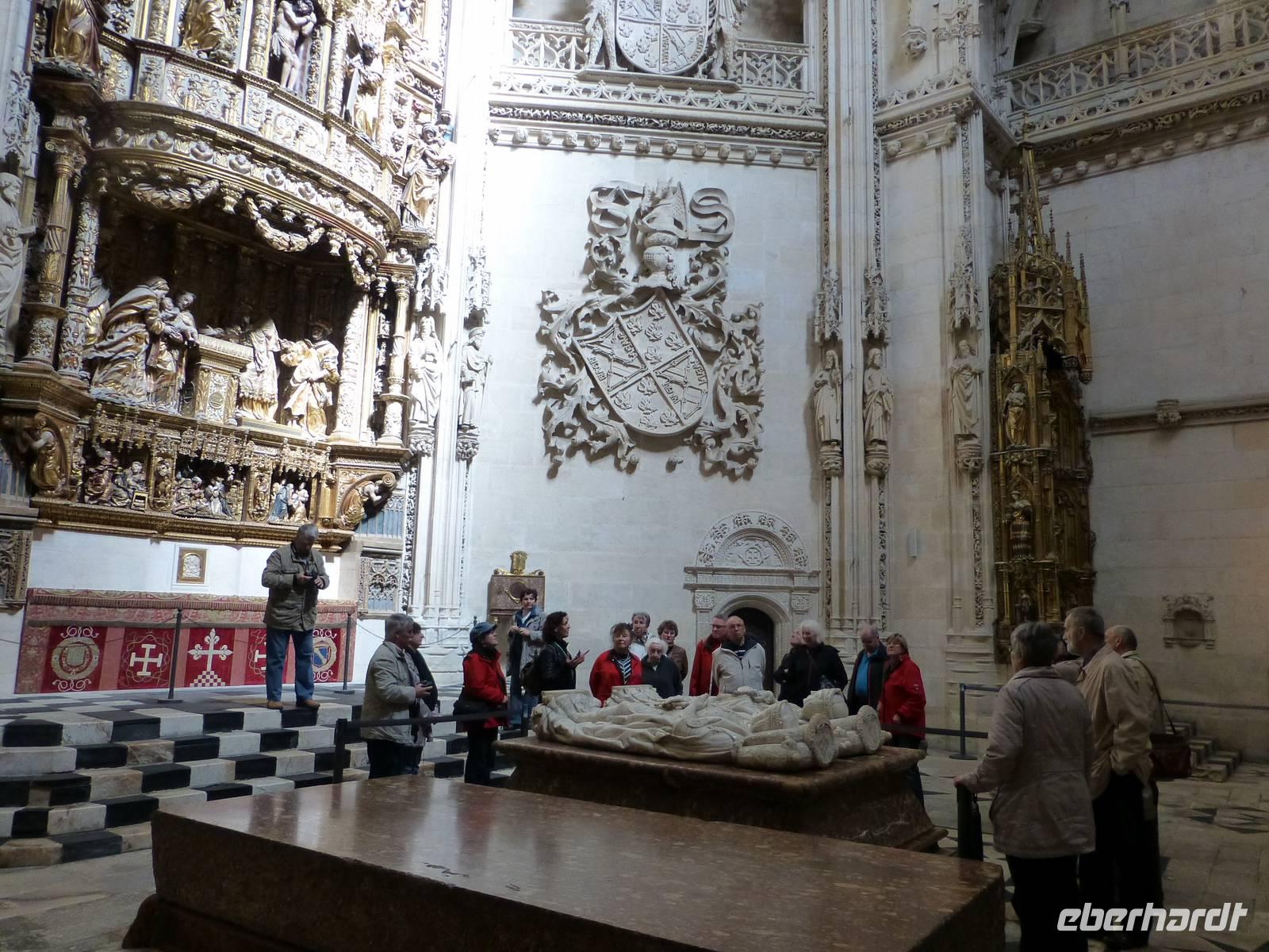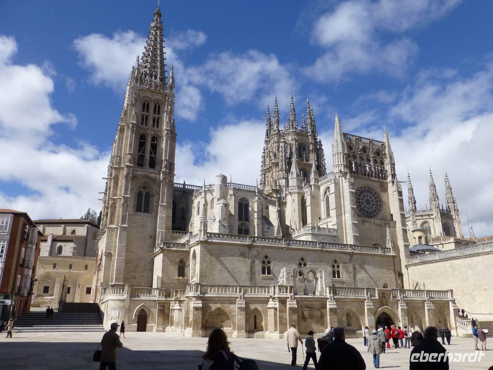 Anschließend setzten wir unsere Reise nach Burgos inmitten der nordkastillischen Hochebene fort. Nach dem Zimmerbezug in unserem Hotel Corona di Castilla stand die Stadtbesichtigung auf dem Programm. Den Beginn der Promenade Paseo del Espolon markierte der aus dem 14. Jahrhundert stammende Arco de Santa Maria. Hier wurden wir bereits von unserer Stadtführerin Merches erwartet. Zuerst besichtigten wir die berühmte Kathedrale von Burgos, eine der eindrucksvollsten gotischen Kirchen. Wir bewunderten den reich vergoldeten Hochaltar in der Capilla Mayor, die „Papamoscas-Uhr" (Fliegenfänger), die Goldenen Treppe, die im reichsten platereskem Stil ausgestattete Condestable Kapelle sowie den Kreuzgang. Nach diesem überwältigendem Eindruck erkundeten wir das Stadtzentrum. Entlang der Flaniermeile bummelten wir zum Casa del Cordón, in dem Christoph Kolumbus nach seiner Rückkehr von seiner zweiten Reise in die Neue Welt empfangen wurde. Anschließend erreichten wir den arkadengesäumten Plaza Mayor, den Mittelpunkt der Stadt. Dann begaben wir uns ca. 500 m auf den Jakobsweg. Nach der Besichtigung nutzen einige noch die Gelegenheit, die Innenstadt auf eigene Faust zu erkunden. Zum Abendessen trafen wir uns alle in unserem Zentral gelegenen Hotel wieder.