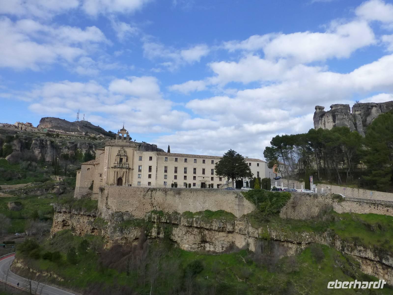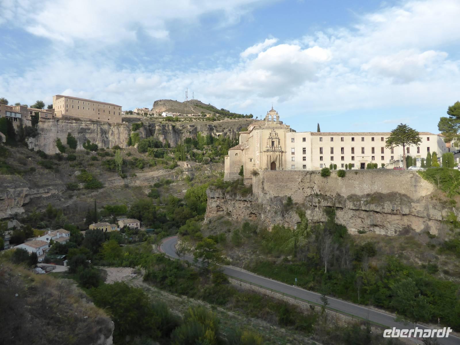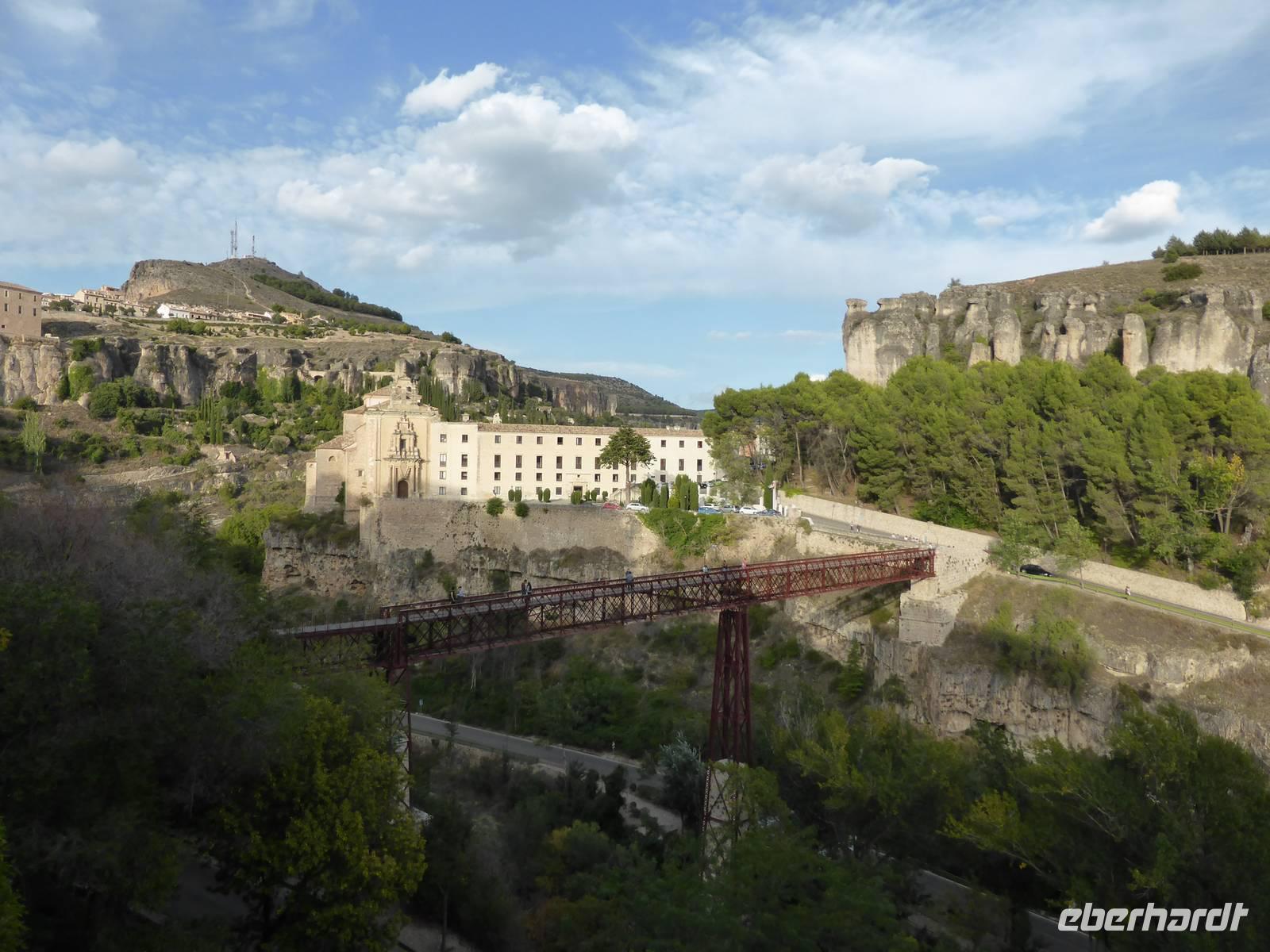 Am Vormittag statteten wir dem Atocha Bahnhof noch einen Besuch ab. Im alten Bahnhofsgebäude wurde ein tropischer Palmengarten mit Schildkrötenteich angelegt. Die bekannten Baby Sklupturen von Antonio Lopez (Tag und Nacht) sowie das Denkmal für die Anschläge vom 11 März 2004 waren ebenfalls noch Ziele unseres Aufenthaltes. Im Anschluss fuhren wir weiter nach Cuenca in 1000 m Meereshöhe. Cuenca liegt überaus schön auf den steilen Felsen der Serrania de Cuenca über den tiefen Tälern des Rio Jucar und des Rio Huecar. Sie ist eine der malerischsten spanischen Städte und berühmt für die „hängenden Häuser" („Casas Colgadas"). Nach dem Zimmerbezug in unserem Hotel Alfonso VIII. trafen wir uns mit unserem Stadtführer Pablo. Er brachte uns seine Heimatstadt auf sehr unkomplizierte Art und Weise näher. Wir fuhren durch die wunderschöne Huecarschlucht und spazierten anschließend durch die Altstadt. Er zeigte uns auch die wunderschöne Kirche. Am Torre Mangana, dem Wachturm der einstigen arabischen Festung beendeten wir unsere Führung. Pablo überraschte uns mit einigen Spezialitäten (Aluja - Mandelkuchen) von Cuenca in seinem Geschäft. Ein kurzer Spaziergang brachte uns zurück an unser Hotel. Während des Abendessens konnten wir von der Terrasse des Hotels einen schönen Blick auf das beleuchtete Cuenca genießen.