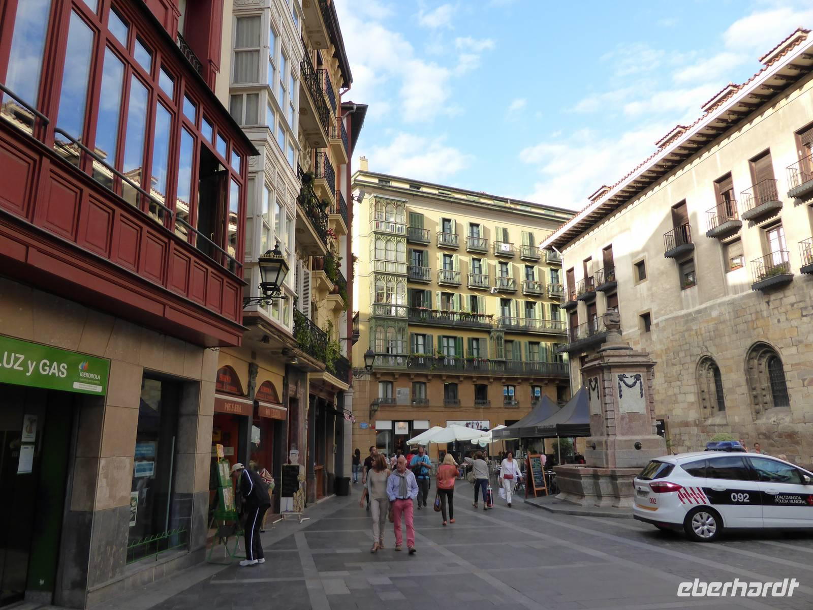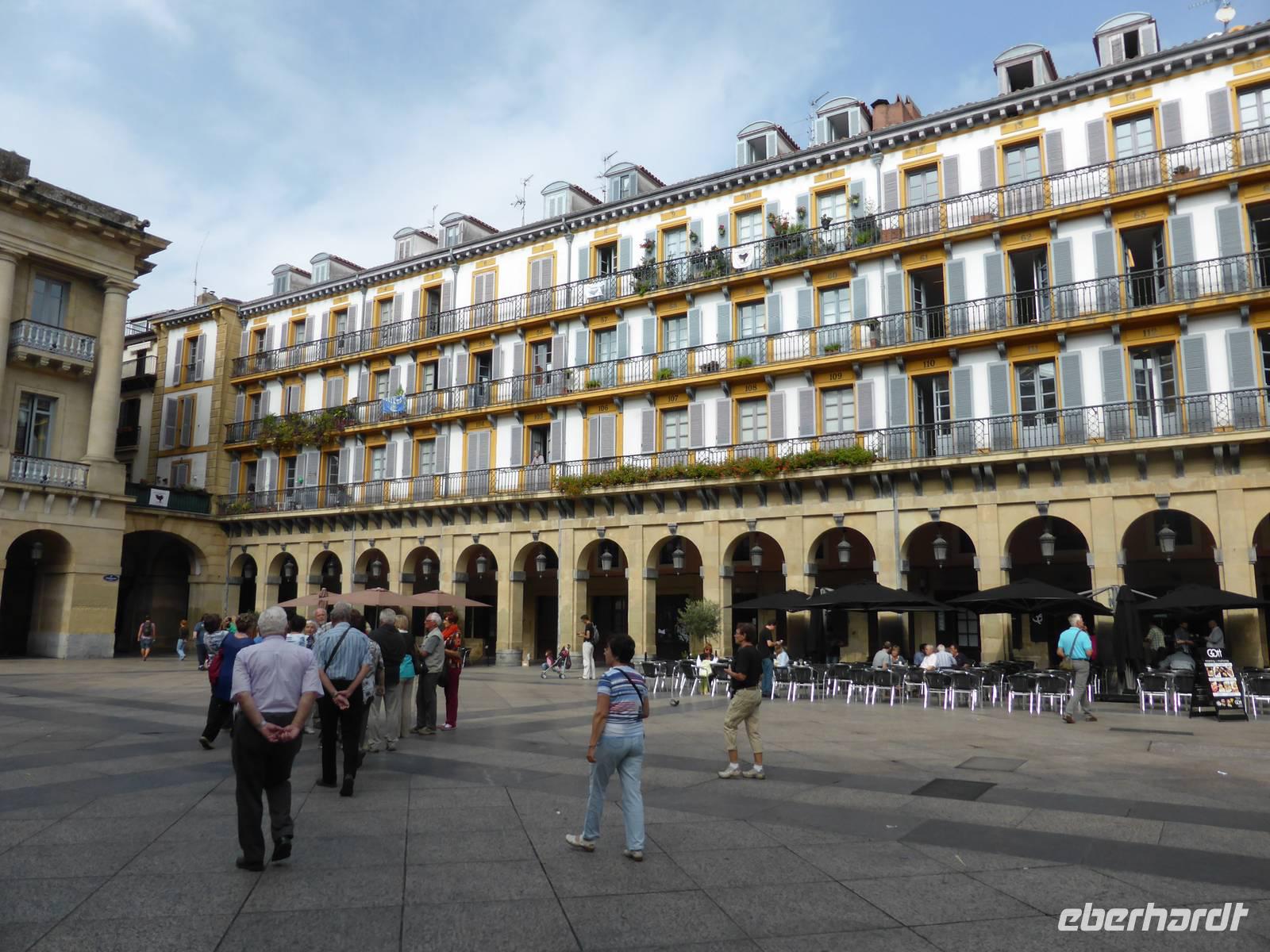 Mit dem Bus setzten wir unsere Stadtrundfahrt entlang der La Concha fort und erreichten den Kursaal, das 1999 eröffnete Kongresszentrum. Der von hier beginnende Stadtrundgang führte uns zuerst über den Fluss Urumea in die Gassen der Altstadt. An der Barockfassade der Basilika Santa Maria vorbei erreichten wir noch einige typische baskische Häuser, die den Flächenbrand von 1813 überstanden hatten. Lourdes erzählte uns über die gastronomischen Gesellschaften bzw. Kochklubs der Männer. Frauen werden nur zum Mittagessen zugelassen und dürfen sich nicht einmischen.