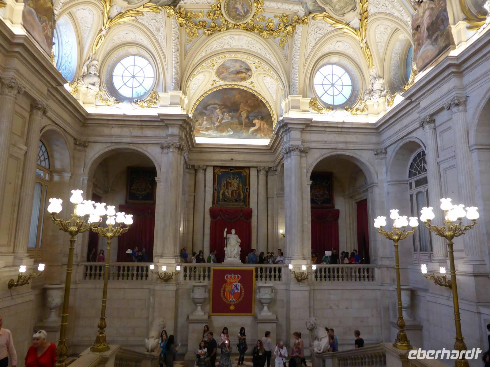Bei einer Stadtrundfahrt mit unserer Reiseleiterin Diana lernten wir die spanische Metropole kennen. Entlang der prachtvollen Nord-Süd-Achse entdeckten wir u.a. den Kybeles Brunnen, das monumentale Postamt sowie die zahlreichen Museen (Prado, Sammlung Thyssen - Bomemizsa). Über die Gran Via, die Hauptgeschäftsstraße und Inbegriff des großstädtischen Geistes Madrids erreichten wir den Plaza Espana. Diesen Platz als Schnittpunkt des habsburgischen und bourbonischen mit dem modernen Madrid prägt das Denkmal für Miguel de Cervantes mit den Figuren seiner Romanhelden Don Quijote und Sancho Pansa. Höhepunkt der Besichtigung war sicherlich der Besuch des Königlichen Schlosses. Über das imposante Treppenhaus erreichten wir die Räume von Karl III. sowie den prunkvollen Thronsaal. Gegenüber dem Königlichen Palast erhebt sich die Hauptkirche Madrids, die Nuestra Senora de Almudena. Am Königlichen Schloss begannen wir unseren gemeinsamen Stadtrundgang. Dieser führte uns durch die Gassen der Altstadt über das Rathaus zum Plaza Mayor. Die bemerkenswerte architektonische Geschlossenheit sowie dem Reiterstandbild von Philipps III. prägen den Hauptplatz der Altstadt. Am Platz erhebt sich die freskengeschmückte Casa Panaderia, ehemalige Verkaufsstelle für Brot. Unsere Reiseleiterin Diana verabschiedete uns in die Mittagspause.