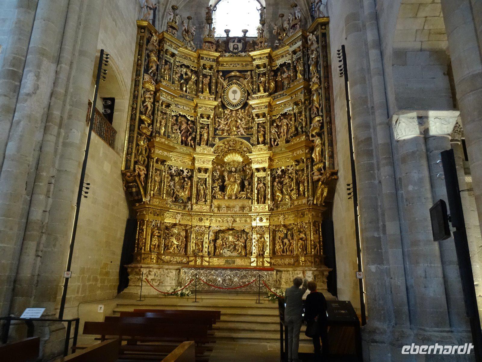 21.04.2017: Zunächst gilt dieser Tag der Hauptstadt des Baskenlandes, Vitoria - Gasteiz. Die Stadt ist kein ausgesprochener Touristenmagnet, aber die Altstadt, die man entweder über die Rolltreppe oder eine Reihe von Stufen erreicht, ist auf alle Fälle sehenswert. Um zwei hübsche Plätze gruppieren sich die Kirche San Miguel Arzangel, die Kathedrale Santa Maria und viele schöne Adelshäuser. Um Spaniens Ruf als Land des Weins gerecht zu werden, besuchen wir nun das Weingut Marqués de Riscal in Elciego, der Weinregion La Rioja. Im Rahmen einer Führung erfahren wir viel über den Anbau der Weinstöcke, das Ernten der Trauben und der anschließenden Verarbeitung der Beeren zu Wein. Mit der Verkostung eines Weins endete die interessante Führung. Nun war schon ein Pause fällig, aber als Besonderheit musste erst noch in Stück gefahren werden, um den Ort Santo Domingo de Calzada zu erreichen. Dort wanderten wir gemeinsam zur Kirche dieses kleinen Pilgerstädtchens. In der Kathedrale de Santo Domingo befindet sich ein sehr schöner Hochaltar, Blickfang ist jedoch ein Käfig mit einem lebendigen Hahn und einer Henne. Sie erinnern an eine Geschichte, die man sich dazu erzählt und in deren Verlauf die gebratenen Hühner eines Richters plötzlich aufstanden und davonliefen. Er hatte es für unmöglich gehalten, dass ein Jüngling, den man fälschlicherweise des Diebstahls bezichtigt und aufgehängt hatte, durch das Eingreifen des Heiligen Domingo am Leben geblieben war. Der Richter sagte, dass der Verurteilte ebenso wenig lebt, wie sein gebratenes Huhn auf dem Teller, aber das Huhn lief davon und seither leben ein Hahn und ein Huhn in der Kirche. Nach dieser spannenden Geschichte fuhren wir nun in eine neue Region, nach Kastilien-Leon und in die Stadt Burgos. Im Hotel Corona de Castillo wurde eingecheckt und anschließend auch zu Abend gegessen.