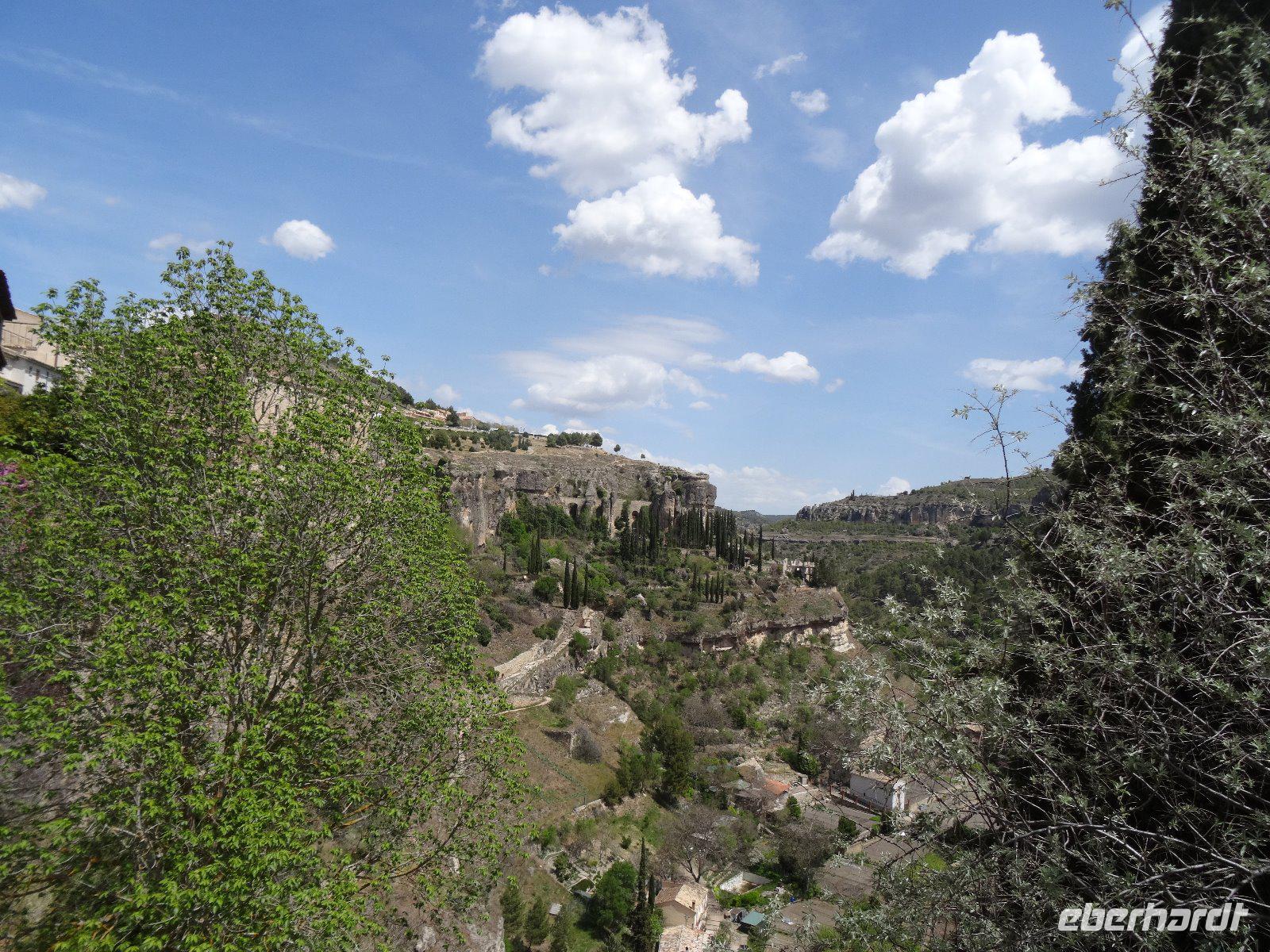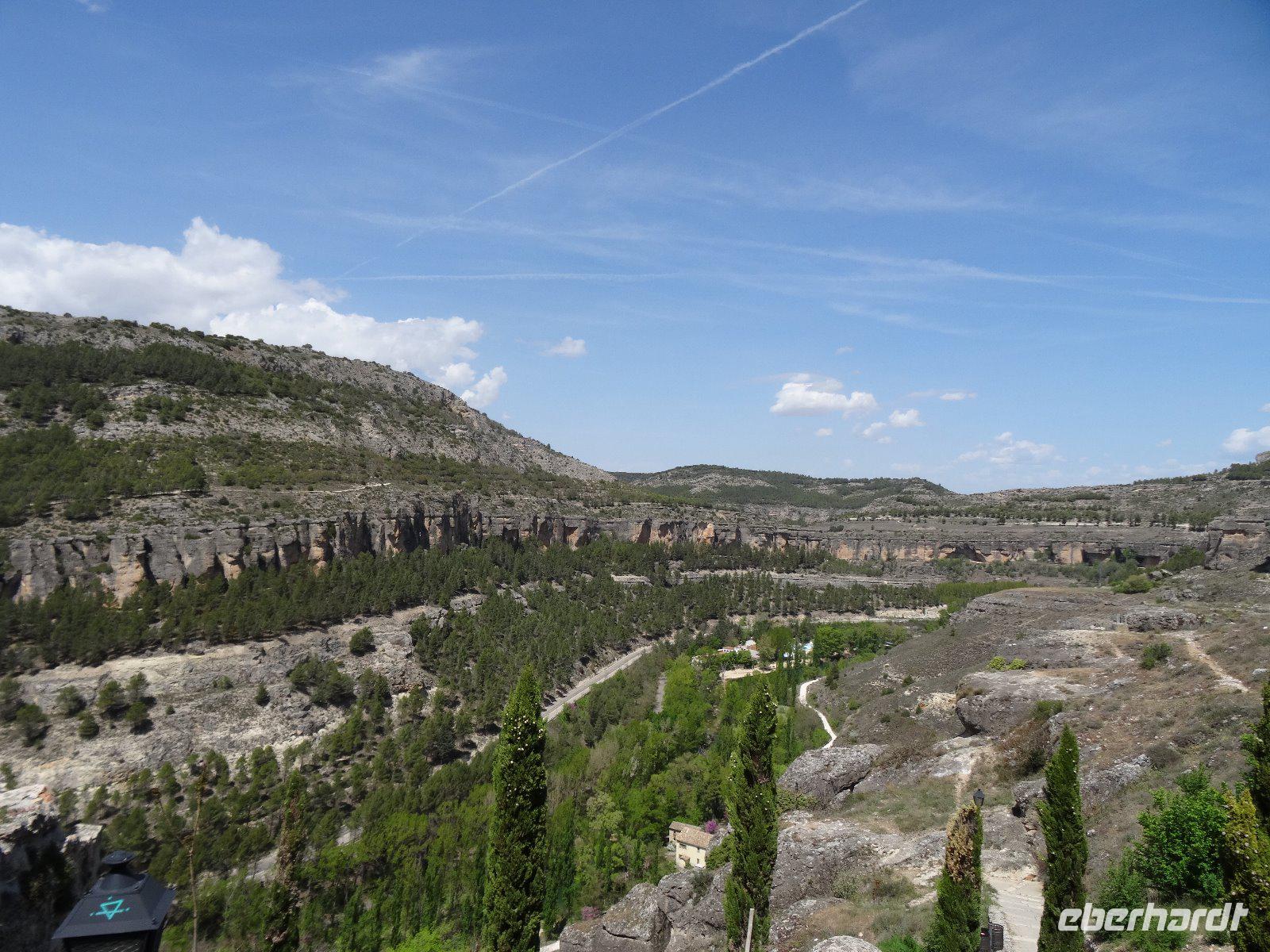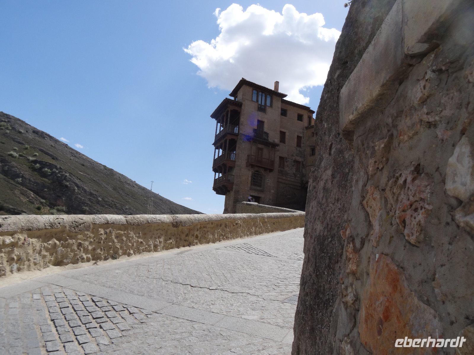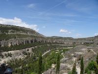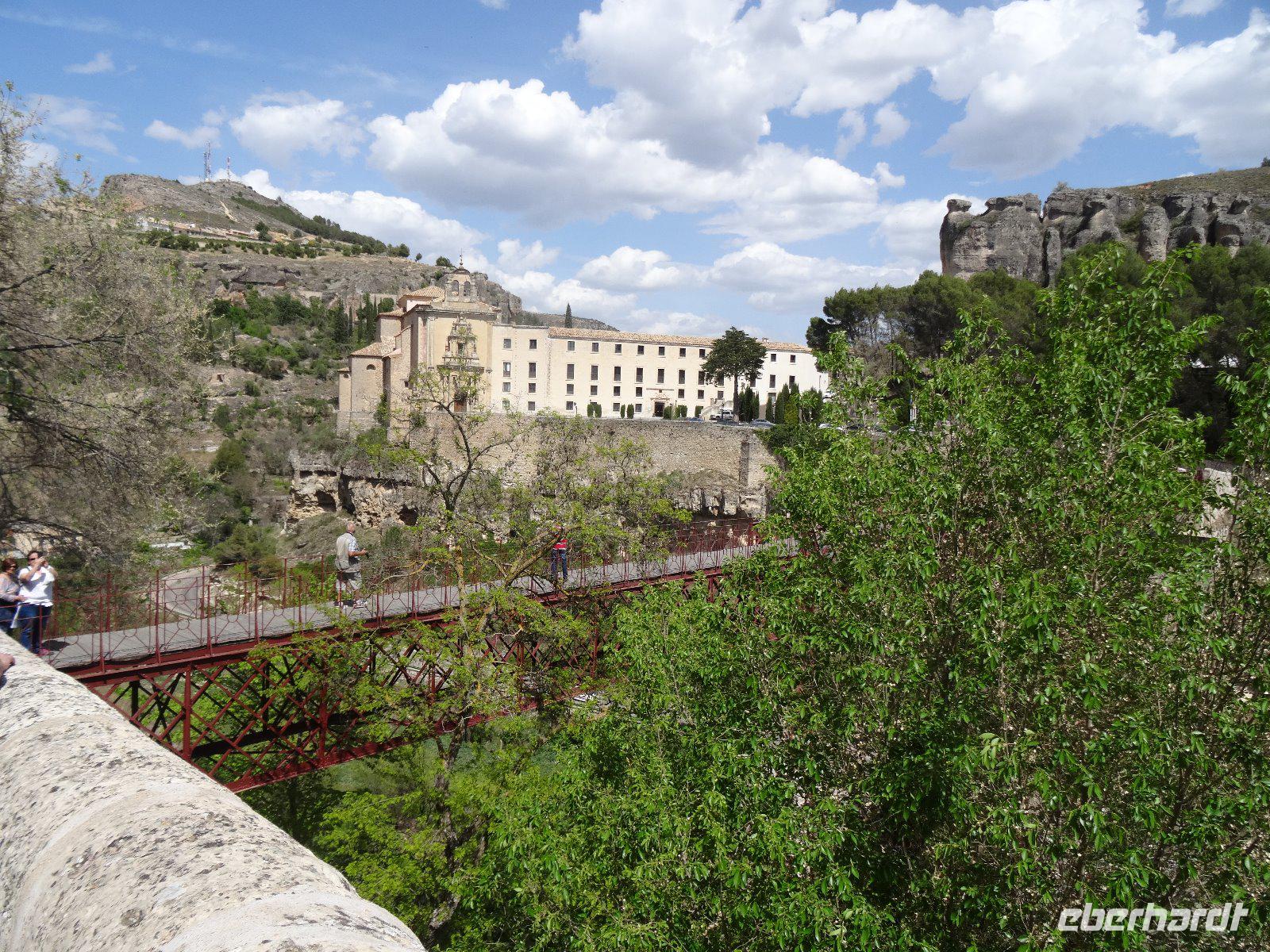 24.04.2017: Eigentlich wollten wir Madrid pünktlich verlassen, jedoch ein Brand in der Nähe unseres Hotels macht es dem Fahrer unmöglich, zu uns zu gelangen. Er setzt aber seinen ganzen Ehrgeiz hinein dies zu erreichen und in zahlreichen Telefonaten (es sind insgesamt 8) versichert er immer wieder, er sei in 2 Minuten da. Aber es gelingt nicht und so wandern wir schließlich zur Plaza Espana und steigen dort in den Bus ein. Wir kommen nun etwas später nach Cuenca (Kastilien - La Mancha), aber dort erwartet uns nicht wie geplant die örtliche Reiseleiterin Olga, sondern Pablo. Er spricht kein Deutsch, aber das ist kein Problem, ich kann ja übersetzen. Die Stadt Cuenca ist eine Universitätsstadt und berühmt für ihre sogenannten "hängenden Häuser" in der Altstadt. Zwei Flüsse, der Huecar und der Júcar haben tiefe Schluchten gegraben und damit der Stadt ein malerisches Aussehen verliehen. Aus Platzmangel sind die Häuser der Altstadt zum Teil förmlich an den Fels geklebt, auch die Kathedrale steht hart am Fels. Einige Reste einer Festung der Mauren, welche fast 700 Jahre das Land beherrschten, sind ebenfalls noch sichtbar.