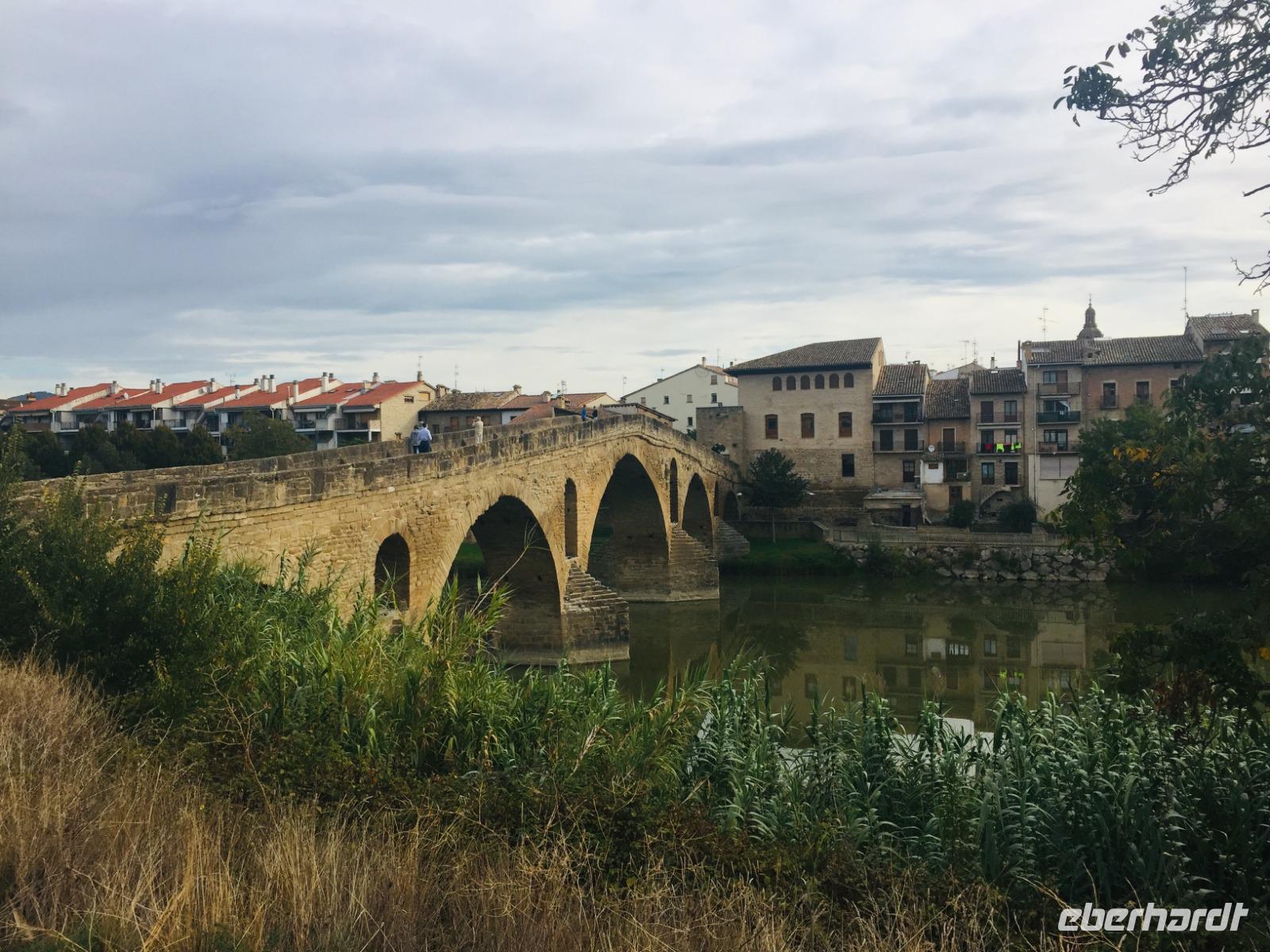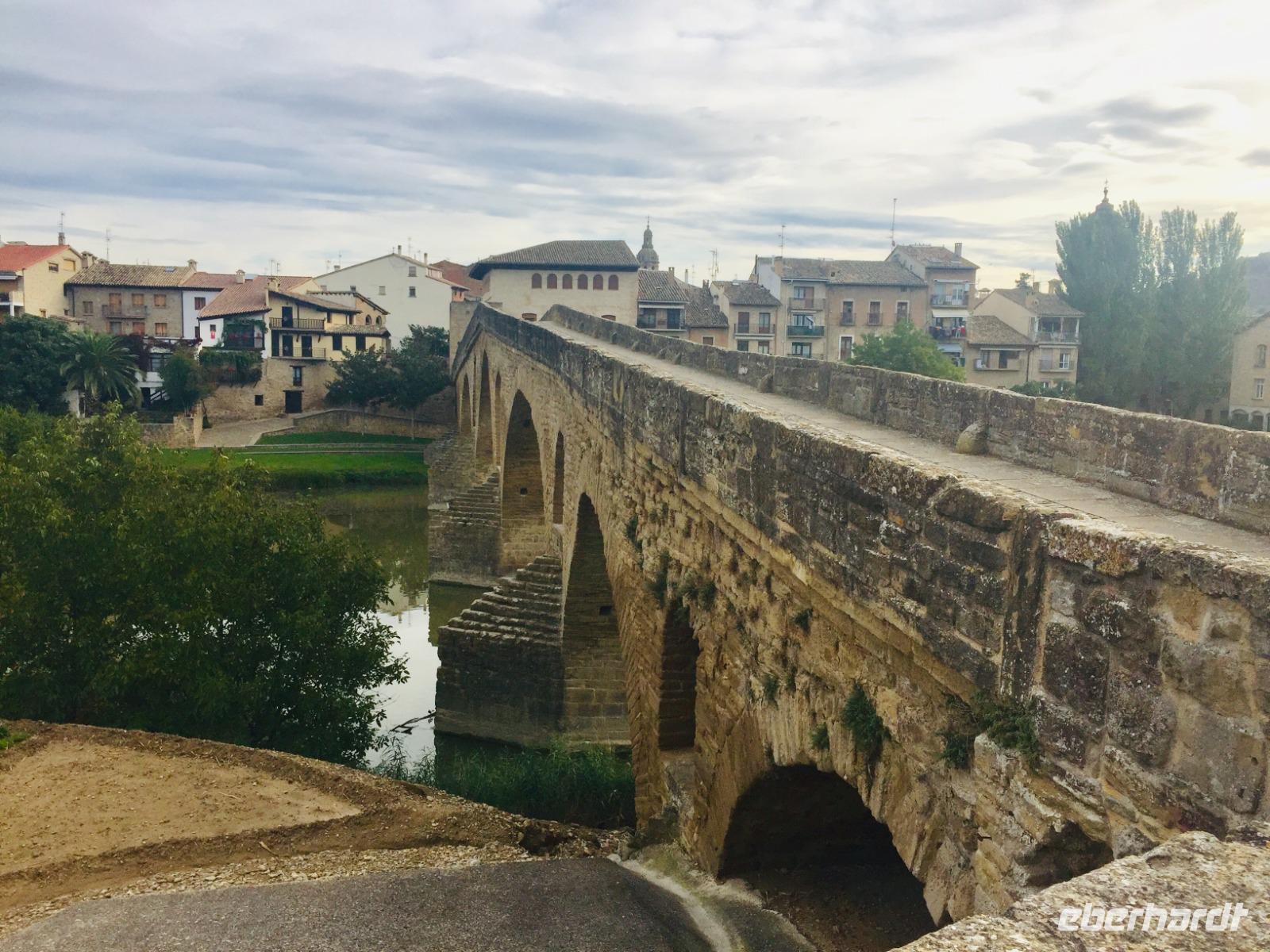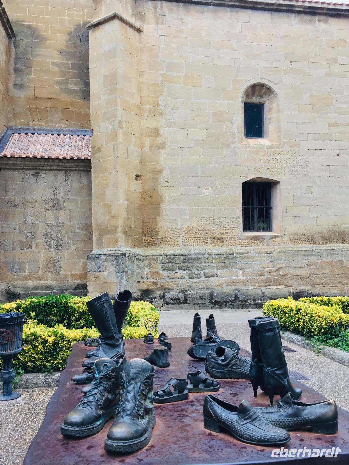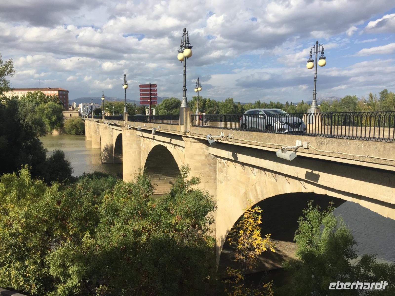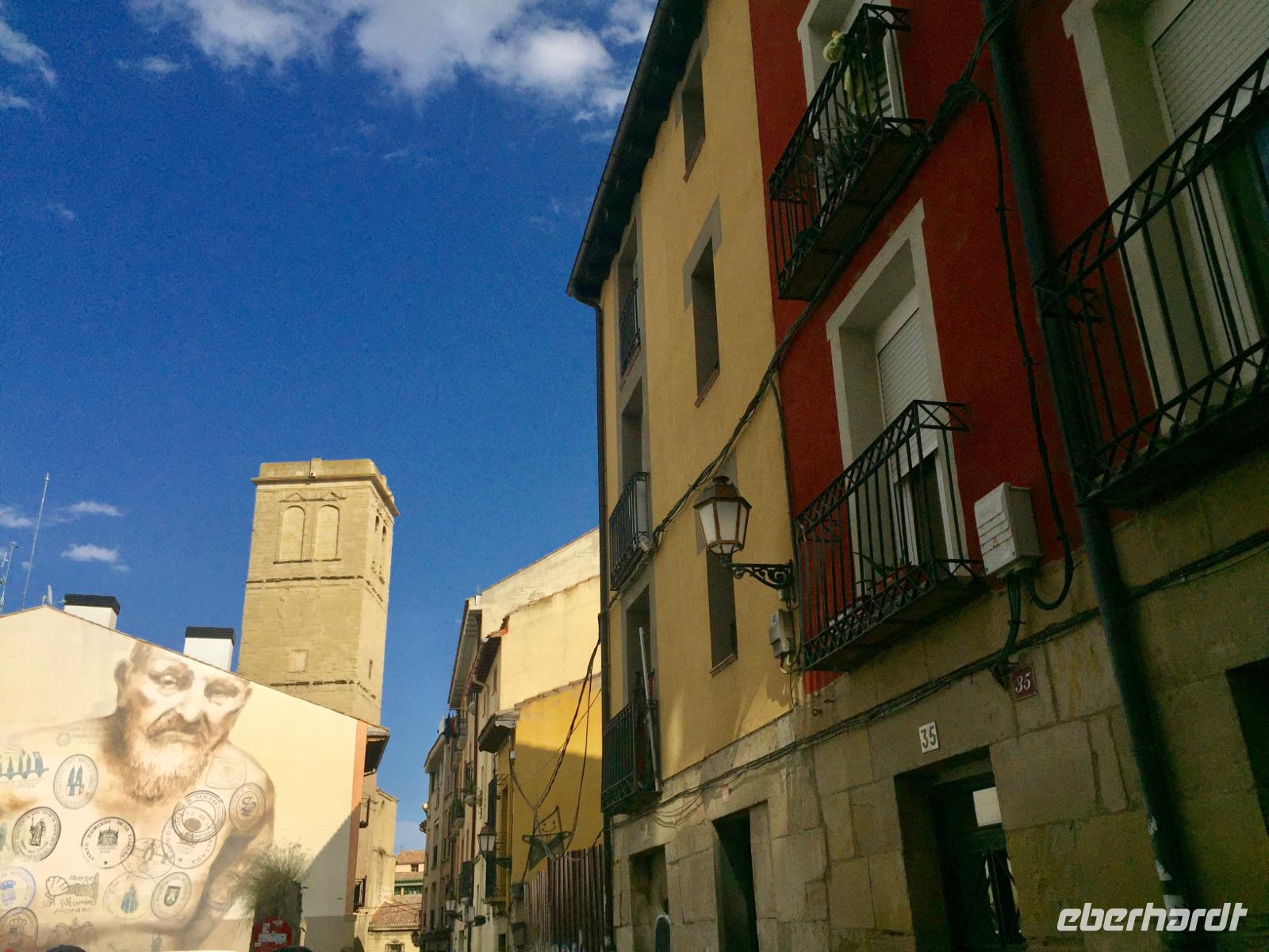 Nächster Stop: Logroño. Wir laufen den Jakobsweg in der Stadt in umgekehrter Richtung. Gelbe Pfeile und das bekannte Muschelsymbol weisen den Pilgern den Weg. Wir sehen eine offizielle Pilgerherberge von außen und vor der Jakobskirche auf dem Platz das „Gänsespiel" mit Stationen des Jakobsweges. Weiter führt uns der Weg an der Brücke Puente Piedra vorbei zur Kirche La Redonda und der Fußgängerzone Portales.