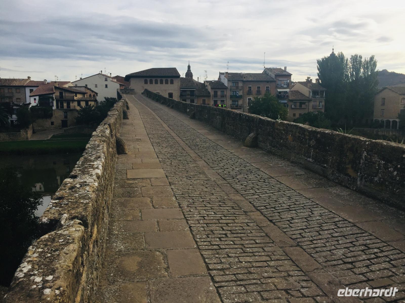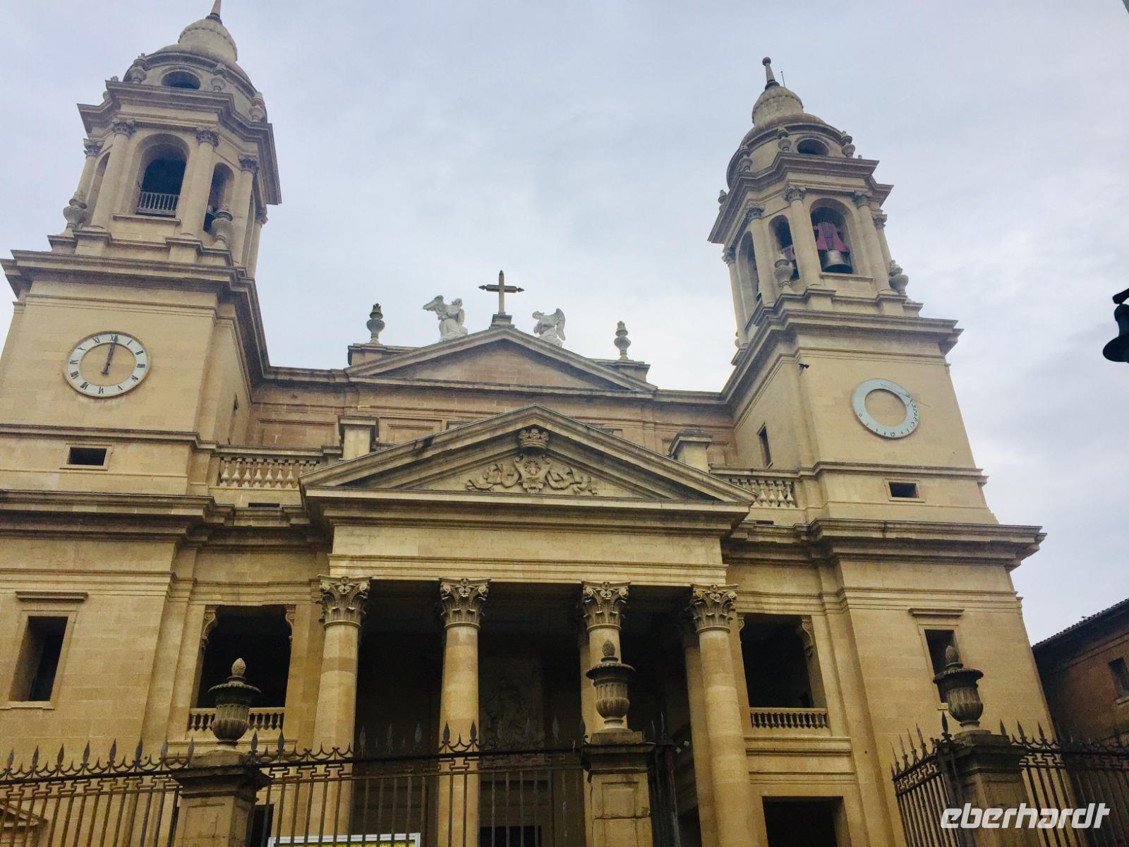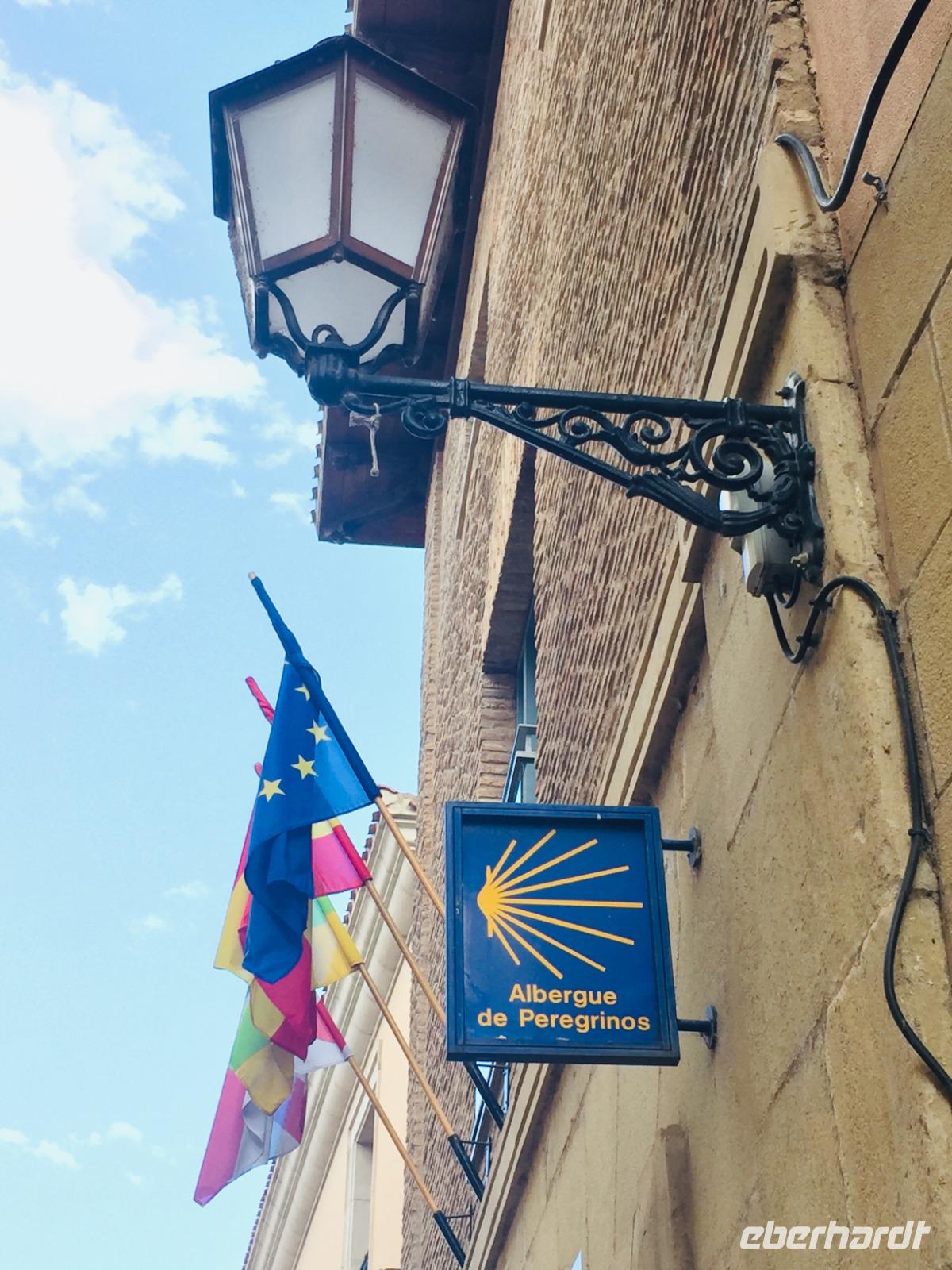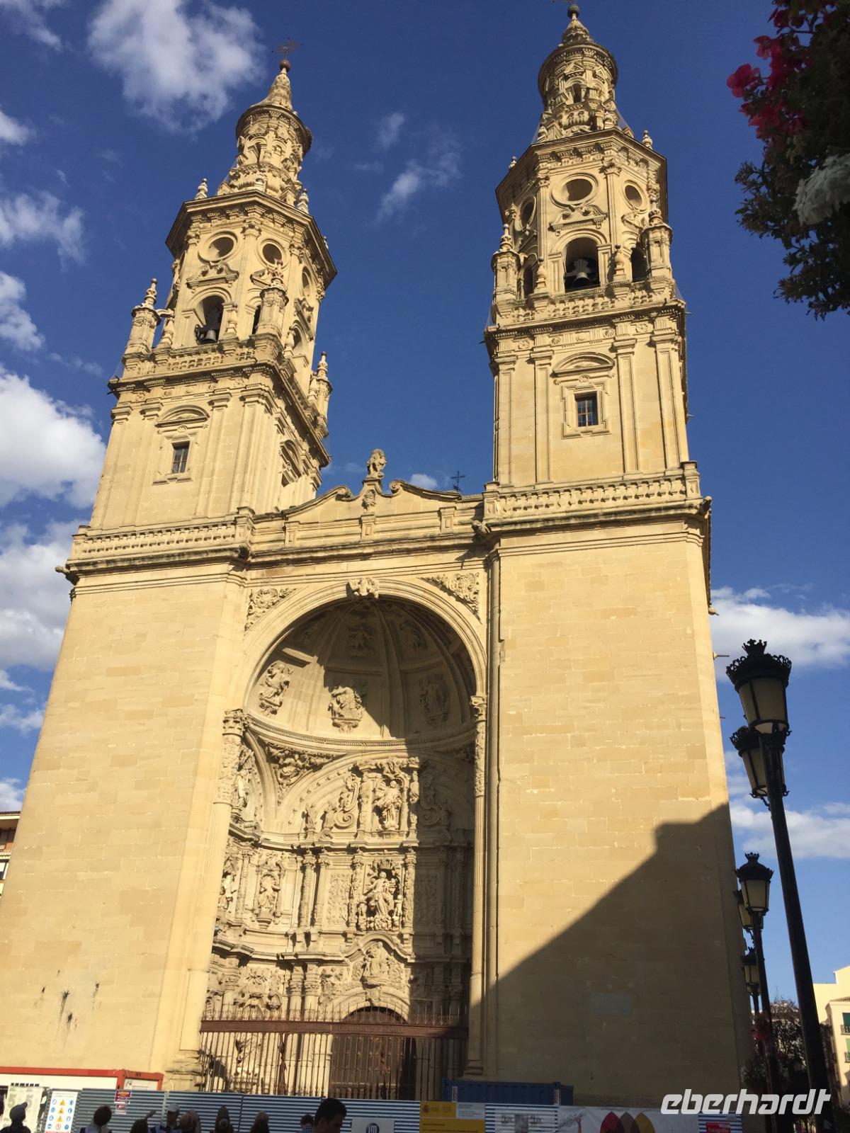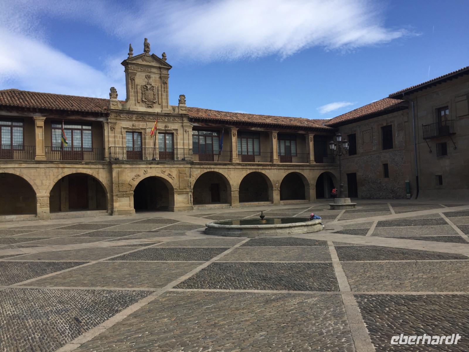 Nächster Stop: Logroño. Wir laufen den Jakobsweg in der Stadt in umgekehrter Richtung. Gelbe Pfeile und das bekannte Muschelsymbol weisen den Pilgern den Weg. Wir sehen eine offizielle Pilgerherberge von außen und vor der Jakobskirche auf dem Platz das „Gänsespiel" mit Stationen des Jakobsweges. Weiter führt uns der Weg an der Brücke Puente Piedra vorbei zur Kirche La Redonda und der Fußgängerzone Portales.