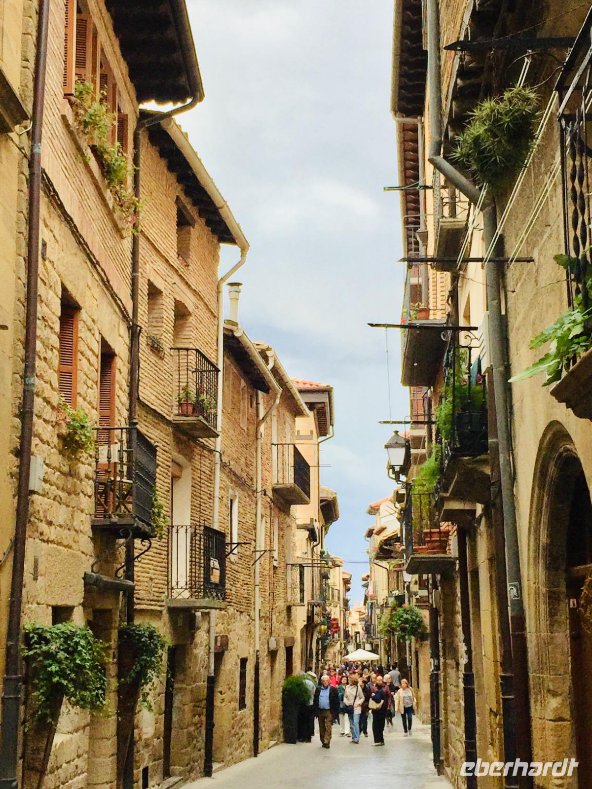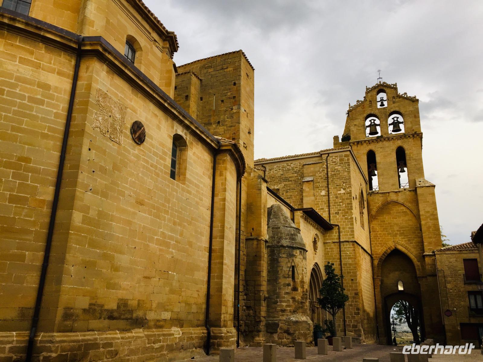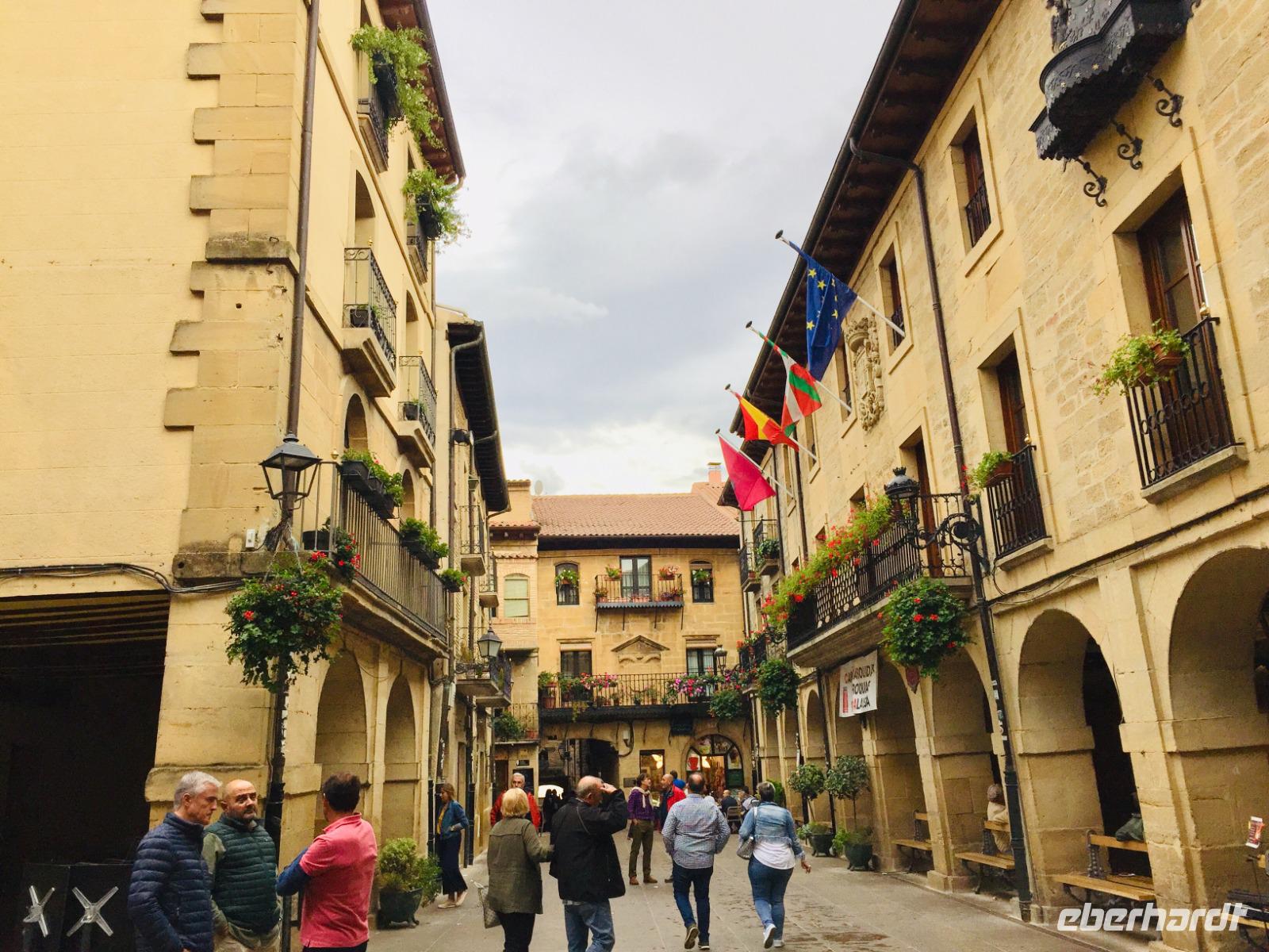 Unser Hotel Sercotel Villa Laguardia lag vorteilhaft am Rande des Dorfes, so dass wir gleich noch auf Erkundungstour gehen konnten. Ein Aufzug führt hinauf auf das Plateau, auf dem der mittelalterliche Ort von einer Stadtmauer umgeben thront. In den engen Gassen finden sich viele Geschäfte, Bars und Bodegas. Besonders sehenswert ist auch der Portico der Kirche Santa Maria de los Reyes, der mit einer Lichtshow erklärt wird.