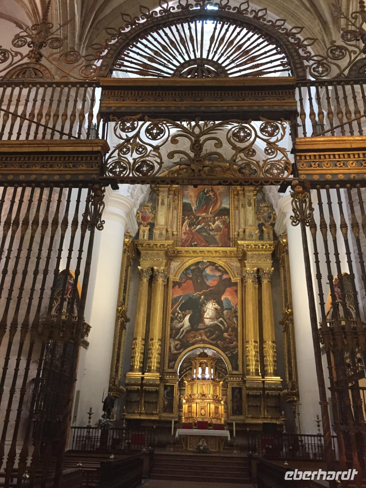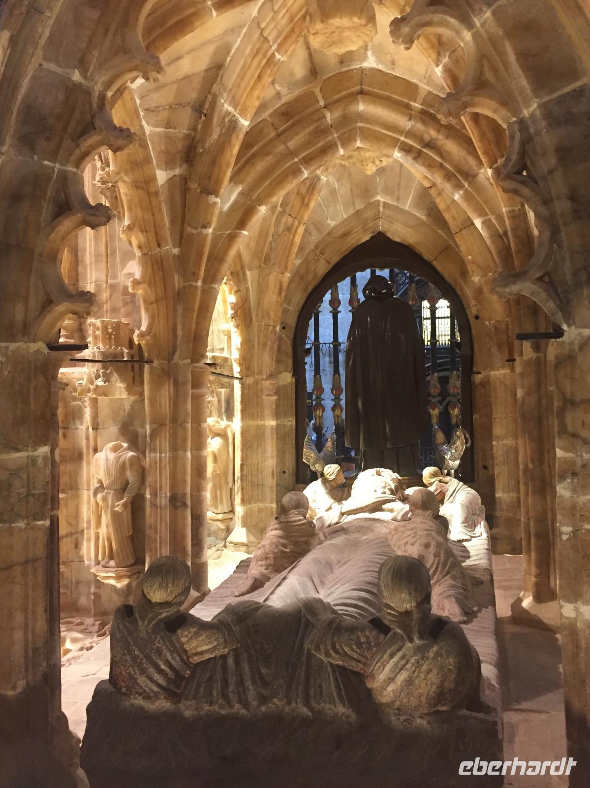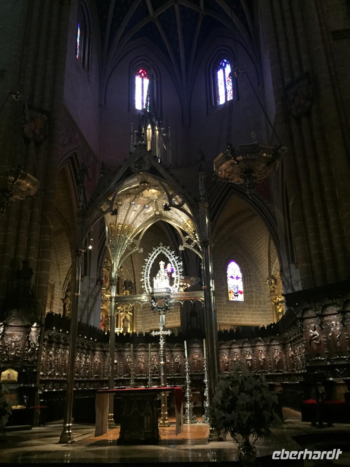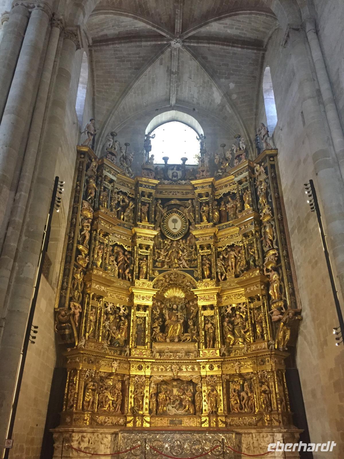 Unser Weg führte heute in die Region Kastilien-León. Wir besuchten Burgos, die historische Hauptstadt von Kastilien. An der Brücke Puente de Santa Maria, wo auch der breite, mit Platanen gesäumte Boulevard Paseo del Espolón beginnt, erwartete uns unsere lokale Führerin Loreto. Sie erläuterte uns kenntnisreich die Geschichte der großen, gotischen Kathedrale Santa Maria (UNESCO-Weltkulturerbe), die zu den schönsten, gotischen Kirchen Spaniens zählt. In ihr befindet sich das Grab des spanischen Nationalhelden El Cid.