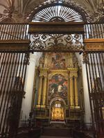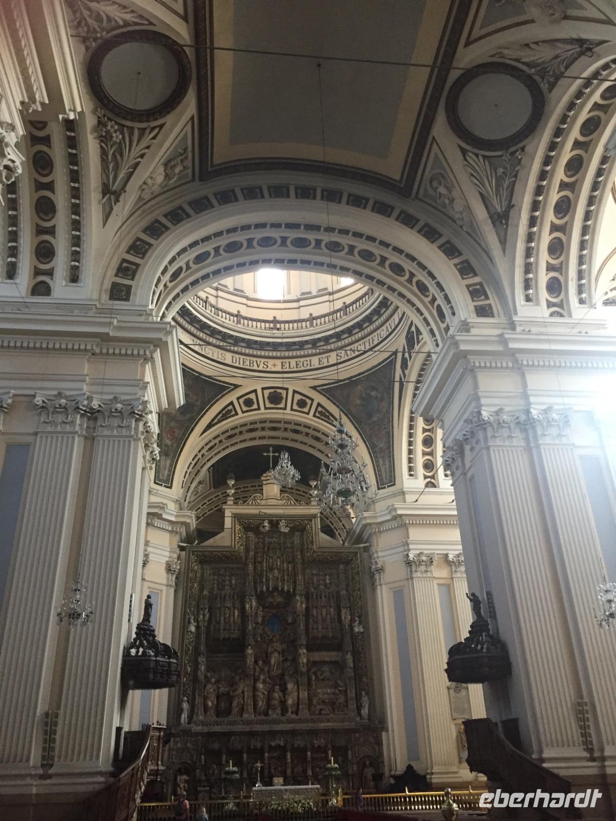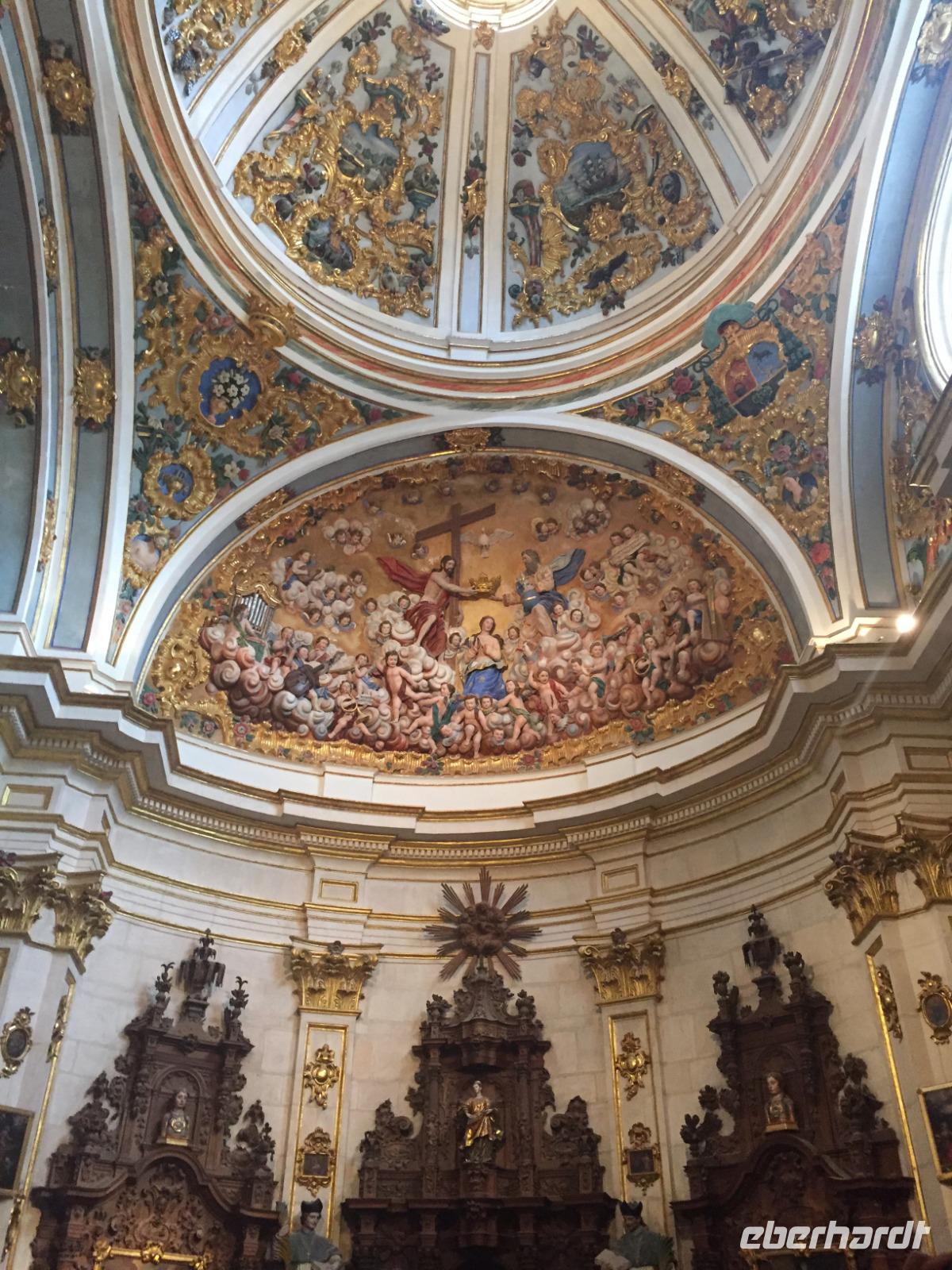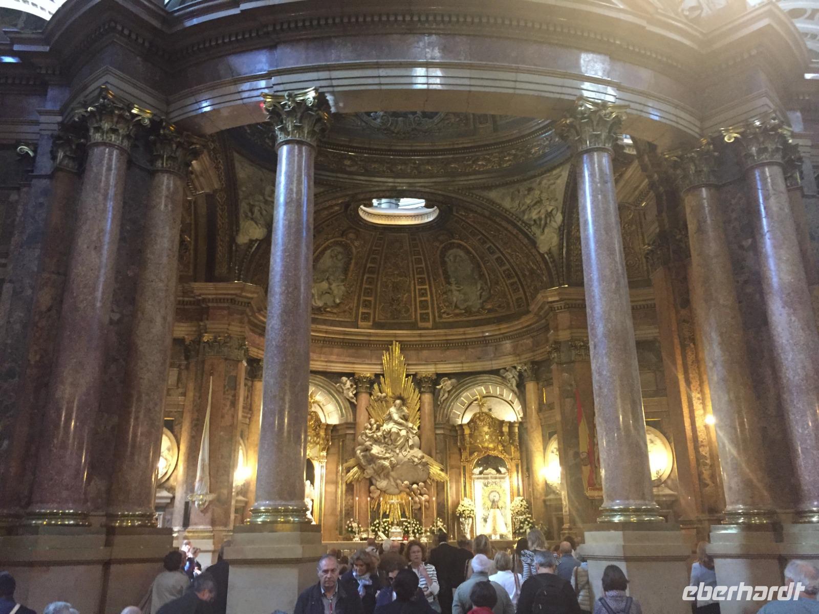 Noch wartet die größte Sehenswürdigkeit auf uns: die riesige Basilika Nuestra Señora del Pilar, das größte barocke Bauwerk Spaniens, direkt an der Plaza del Pilar gelegen. Am 12.10., also drei Tage vor unserem Besuch, ist jährlich der Nationalfeiertag „Dia del Pilar" und die Wallfahrt nach Zaragoza für viele Gläubige Pflichtprogramm. Hier soll die Jungfrau Maria dem Heiligen Jakob erschienen sein. Die Pilger besuchen die Marienstatue auf einer Säule (Pilar) und spenden Blumen, die auf dem Platz zu einem Monument arrangiert werden. Dieses konnten wir noch bewundern und auch weiterhin viele Besucher in der Kirche.